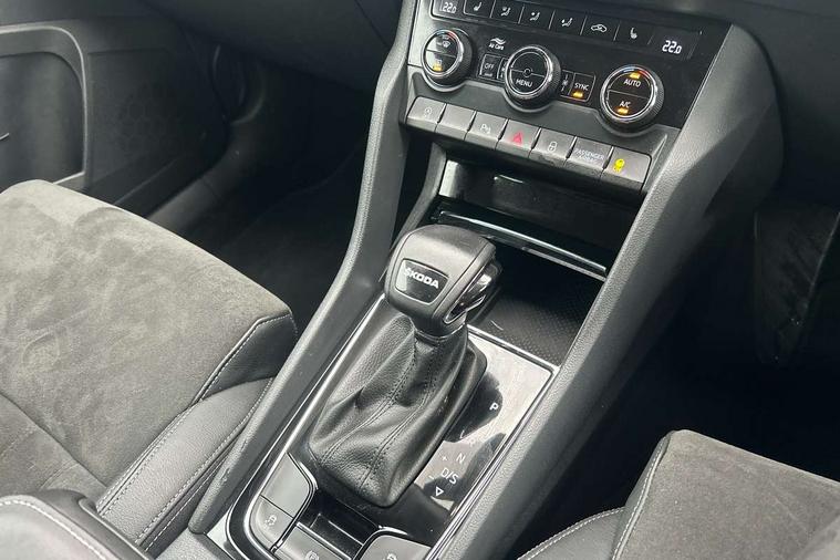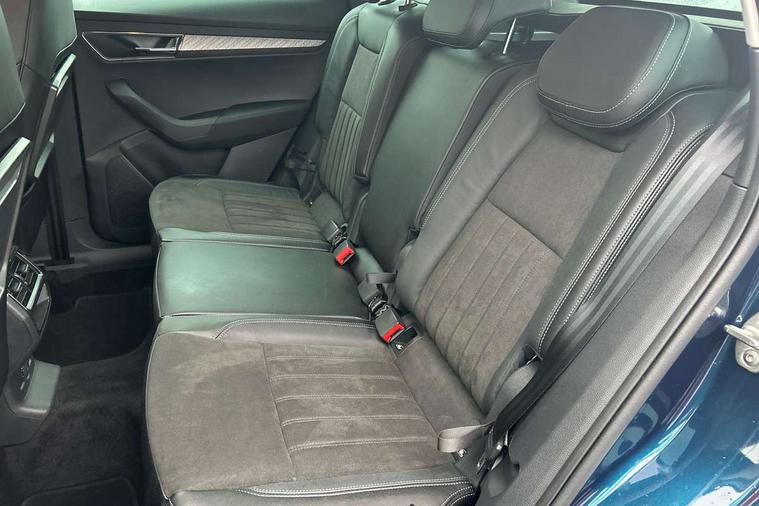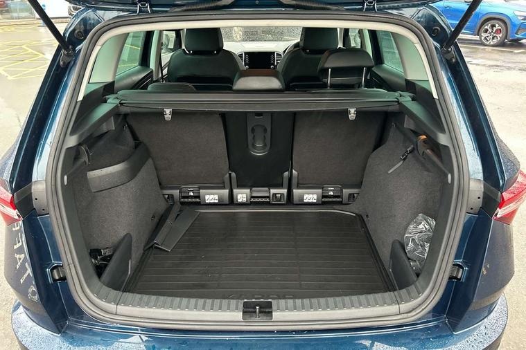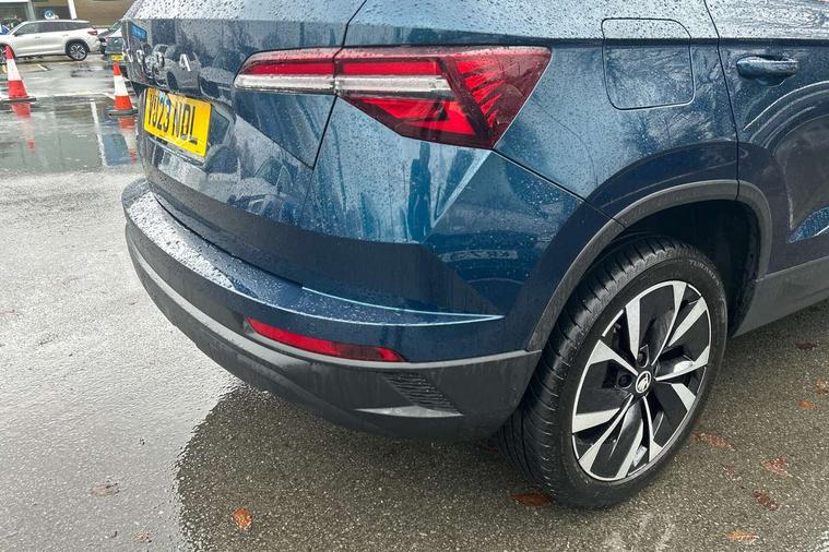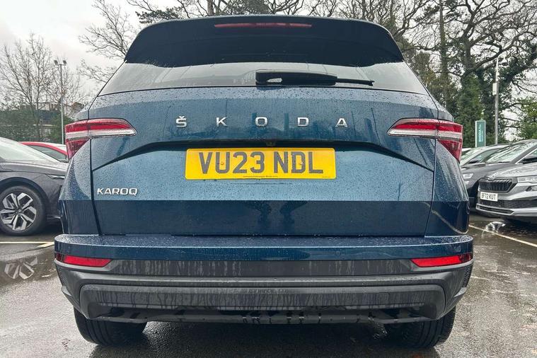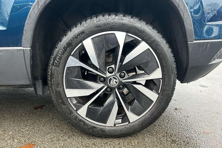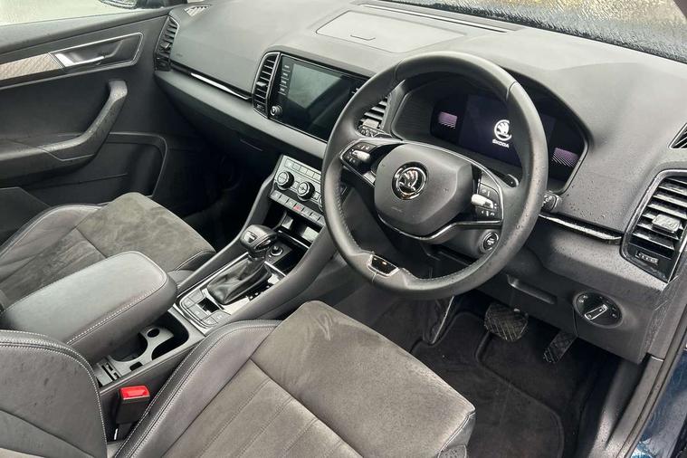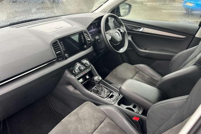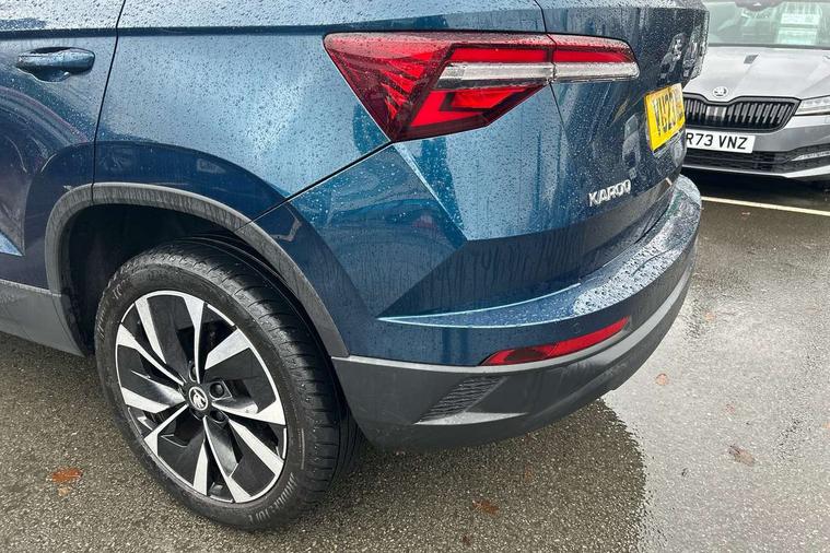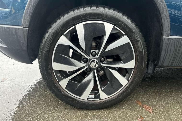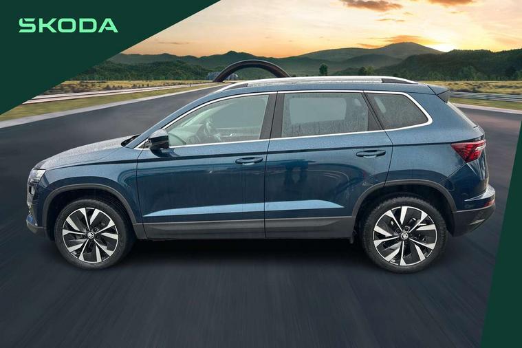 8" Digital display, Care connect, Driver fatigue sensor, Emergency services call system, Outside temperature gauge, Service interval indicator, SmartLink wireless for Apple and wired for Android, Start/stop system with regenerative braking, USB C Port x 2 in front centre console, 8 Speakers, DAB radio with Bluetooth, USB connection, Acoustic glass, Aero front windscreen wipers with intermittent function, Auto dimming rear view mirror with light and rain sensors, Black electric window control buttons, Body colour door mirrors and handles, Dynamic headlight range control with cornering light function, Electric front and rear windows with child proof lock, Heated rear windscreen, LED daytime running lights, LED rear lights with high functionality welcome effect and dynamic indicators, Light assistant (coming/leaving home/tunnel light), Plastic scuff plates, Privacy glass, Rear side wing doors, Rear spoiler, Rear window wiper with washer system and intermittent control, Safety reflectors on front doors, 1.5 litre bottle holders in driver and front passenger door panels, 12V socket in boot, 12v socket in front centre armrest with storage compartment and rear air vents, 2 Folding hooks and nets in boot, 2 spoke leather heated multifunction steering wheel with DSG paddles, 2 x Tablet holder, 3 rear height adjustable headrests, 3 seat bench in 2nd row, 4 foldable roof handles with rear coat hooks, Black floor carpet, Chrome inner door handles, Decorative door sills with KAROQ badging, Double sided boot floor, Foldable hooks in the boot, Front head restraints, Height adjustable front three point seats belts with tensioners, Height/reach adjust steering wheel, Ice scraper, Illuminated glovebox, Illuminated luggage compartment, Isofix child seat preparation for front passenger seat, Isofix child seat preparation outer rear, Manual lumbar support for front seats, Pen holder, Pollen filter, Rear boot cover, Rear reading lights, Rubbish bin door, Safety vest holder, Single front passenger seat, Storage box in upper central dashboard closed, Sunvisors with illuminated vanity mirrors, Textile floor mats, Ticket holder, VarioFlex seats with standard rear seat release, Chrome roof rails + chrome pack - Karoq, Parking pack - Karoq, Automatic door unlocking in case of crash, Automatic fuel cut off in case of crash, Child locks on rear doors, Driver airbag, Electronic parking brake with auto hold function, Emergency rear braking signal, ESC including ABS, MSR, ASR, EDS, HBA, DSR, RBS, MKB and traction control, Front side airbags, Hill hold control, Knee airbags, Passenger airbag with switch-off function, Pedestrian monitor, Seatbelt reminder signalisation and pretensioner for all seats, Three point seatbelts rear, Two tone horn, Tyre pressure display, Tyre pressure monitor, Alarm with interior monitoring, back up horn and tilt sensor with safe function, Electronic engine immobiliser, Keyless entry and start/stop, Remote central locking with 2 remote folding keys, Chrome framed air vents, 18" Procyon silver alloy wheels with anthracite aero inserts, Anti-theft wheel bolts protection, Storage on wheel cover, Tool kit,