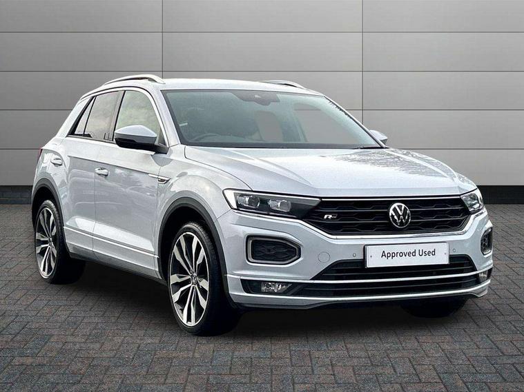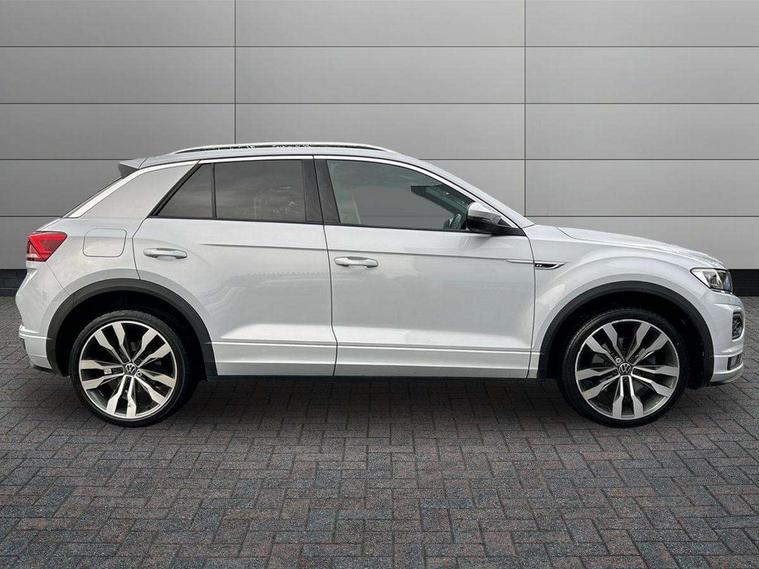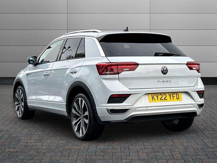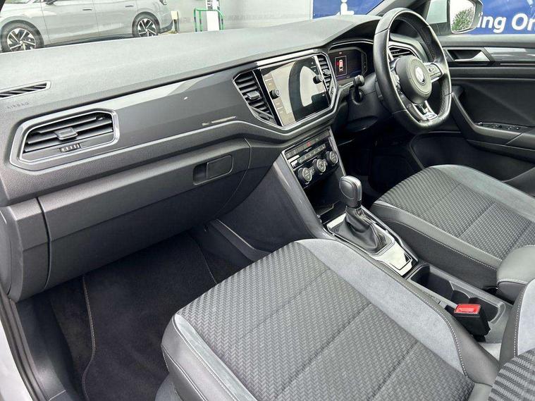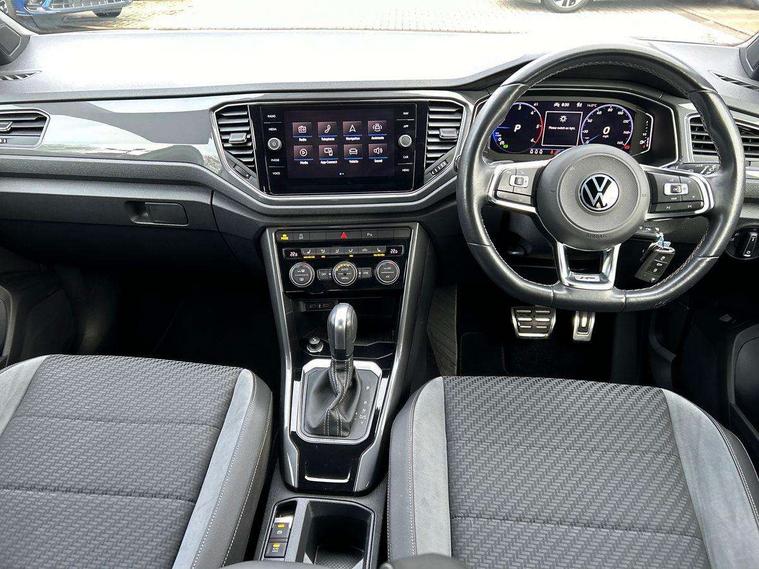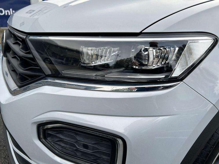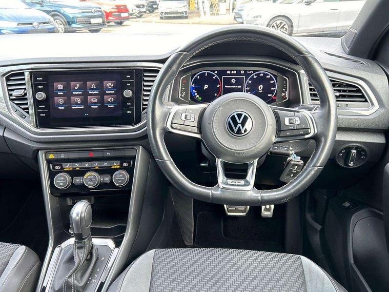 'Lights On' Reminder warning buzzer, Adaptive cruise control, Bluetooth telephone and audio connection for compatible devices, Car information display, Digital Cockpit Pro - Active info display, Driver alert system with audible and visual fatigue detection system, Driver tips and journey analysis, Dusk sensor, Emergency call service, Lane assist with warning text instrument cluster, Modified key software - reduce switch off time for key status change to Long no motion, Multifunction camera, Multifunction computer with visual gear change recommendation for fuel consumption, Navigation system discover media including streaming and internet, Service interval indicator, Think blue trainer driver tips and journey analysis, Traffic sign recognition, Voice activation, Warning sound and light for front seatbelts unfastened, Wireless app connect for apple carPlay, Battery regeneration during braking, Misfuel prevention device for diesel engine, Rear shock absorption for sports version, Start/stop function with battery regeneration, DAB Digital radio, Disk brakes in front, Diversity antenna for FM reception, Music playback - MP3, WMA and AAC files, Premium USB cable in choice of either Apple or Android smartphone compatibility, SD card slot, Simultaneous pairing of 2 compatible mobile devices, SMS functionality - read, compose and send SMS messages using touch-screen display, Storage compartment with longitudinal and height adjustable in armrest and two rear air vents, Three route options - Fast, Short, Eco, Title and cover art display, USB-C Interface and USB charging socket, Auto dimming interior rear view mirror, Automatic coming/leaving home lighting function and daytime running lights, Automatic hazard lights activation under emergency braking, Black grained lower door protectors, Body colored door lower parts, Body colour door handles, Body colour rear roof spoiler, Chrome effect left and right trapezoid exhaust tailpipe fascia surround, Chrome plated moldings, Chrome plated radiator grille inserts, air vent surrounds and light switch surrounds, Chrome trim on upper and lower radiator grille, Dynamic headlight range control with self adjusting whilst driving, Electrically foldable, adjustable and heated door mirrors with puddle lights and reverse activated kerb-view adjustment on passenger's door mirror, External USB type C socket and charging sockets, Front and rear electric windows, Front fog lights with static cornering function, Front windscreen wiper with intermittent wipe and 4 position delay, Fully galvanised body, Heated rear window, Heated windscreen washer jets, High level 3rd brake light, LED darkened rear light clusters, LED headlamps with automatic range adjustment and unique signature LED separate daytime running lights, LED rear number plate lights, LED tail lamp rear comination lamps, Privacy glass, R-Line design body coloured bumpers, Rain sensor, Rear tinted glass from B-pillar backwards approx 65% tinted, Rear wash/wipe with intermittent wipe setting, Silver anodised roof rails, Volkswagen roundel, 12V socket in centre console storage area, 3 rear head restraints, 4 load lashing points in luggage compartment, Aluminium pedals, Black roof lining and sun visors, Branded points of interest, Carbon flag cloth upholstery, Climate control - 2 zone electronic air conditioning with automatic air recirculation and allergy filter, Door and side trim panel, Door and side trim panel in foam film, insert in leatherette, Drawer under drivers seat, Front + rear carpet mats, Front centre armrest, Front cupholders x 2, Front seat back storage pockets, Front sports seats with R-Line logo on seat backrest, Glovebox, Heated front seats, Height adjustable front seats, Height/reach adjust steering wheel, Instrument lighting, white adjustable panel illumination, Interior light delay, Interior light in footwell, Isofix easy fit child seat preparation for 2 outer rear seats, Leather gearshift knob, Leather multi function sport steering wheel with gear change selection via paddle shift on steering wheel, LED interior light with switch off delay/dimmer and 2 front/rear LED reading lights, Load through provision with single cup holder when folded down, Luggage compartment cover, removable, Luggage compartment lighting, R Line badge, Scuff plates in door apertures, Split folding rear seat backrests with centre armrest, Stainless steel pedals, Storage compartment in left and right luggage area, Storage compartment in rear doors, Storage compartments in driver and front passenger doors, Sunvisors with illuminated vanity mirrors, Unique R Line door sill protectors, White ambient lighting, R line styling pack - T-Roc, Winter pack - T-Roc, 3 rear three point seatbelts, ABS, Curtain airbags, Driver and front passenger safety-optimised head restraints, Drivers and front passengers airbags with passengers deactivation switch, Drivers seatbelt reminder, Electronic parking brake with auto hold, Electronic stability control (ESC) includes ASR, EDL, EDTC and trailer stabilisation function, Front assist with city emergency braking and pedestrian monitoring, Front seat side impact airbags, Hill start assist, Predictive pedestrian protection, Rigid safety cell with front and rear crumple zones, Single tone horn, Three point height adjust front seatbelts + pretensioners, Tyre pressure loss indicator, Ventilated front and rear disc brakes, Volkswagen roadside assistance, Alarm with remote central locking and interior protection, Electronic engine immobiliser, Remote central locking with SAFELOCK, radio remote control with 2 remote control folding keys, Shadow grey decorative inserts in dash, centre console and door panel, 19" Suzuka alloy wheels with low rolling resistance tyres and anti wheel bolts,