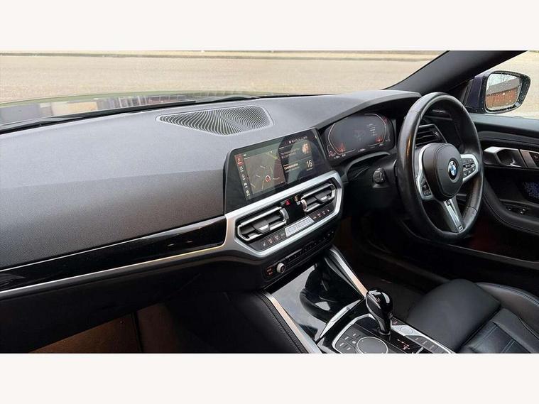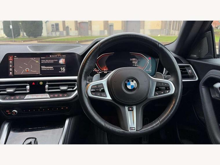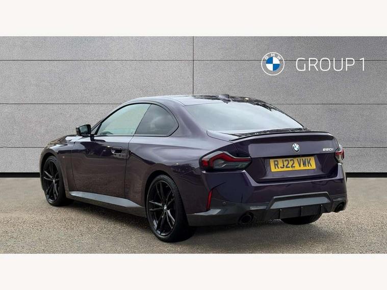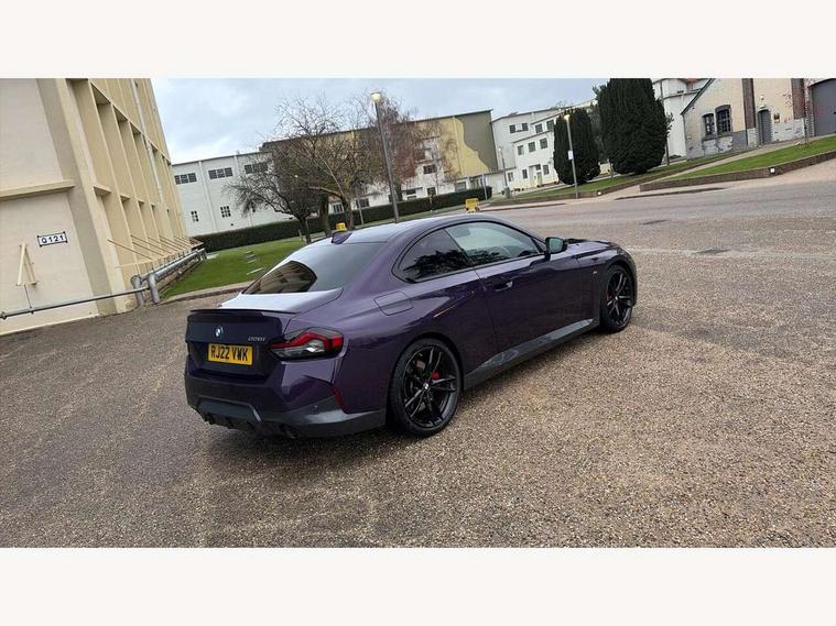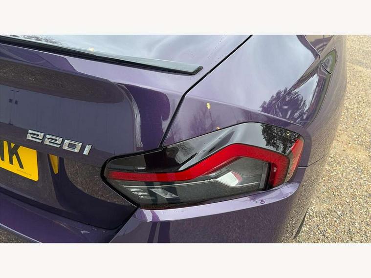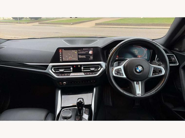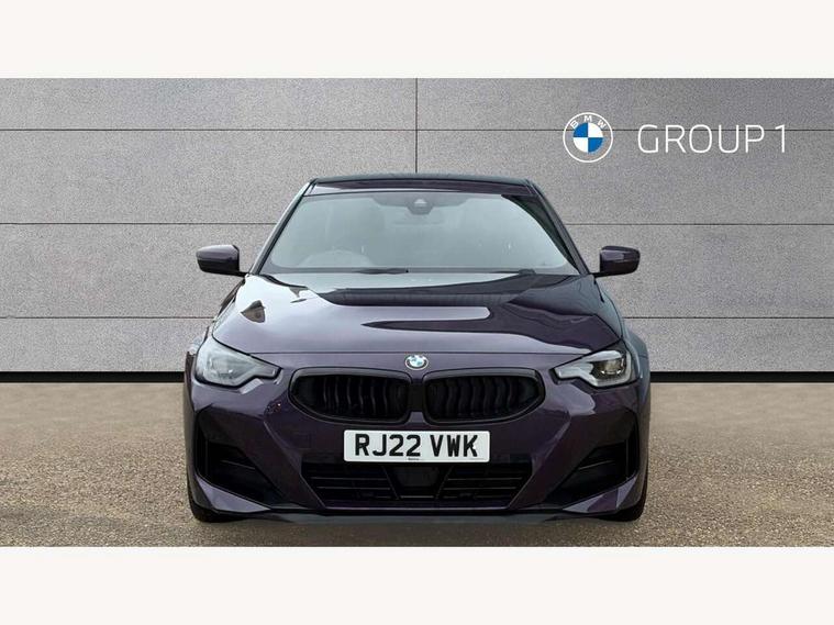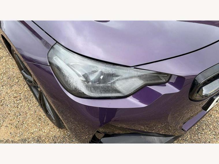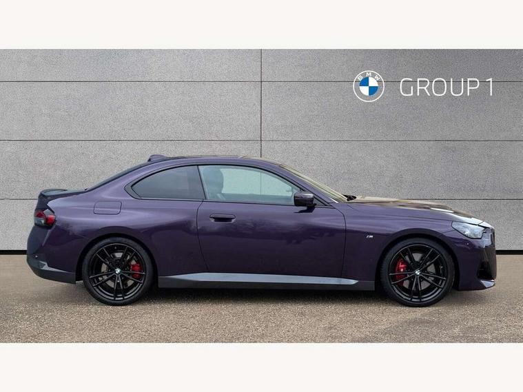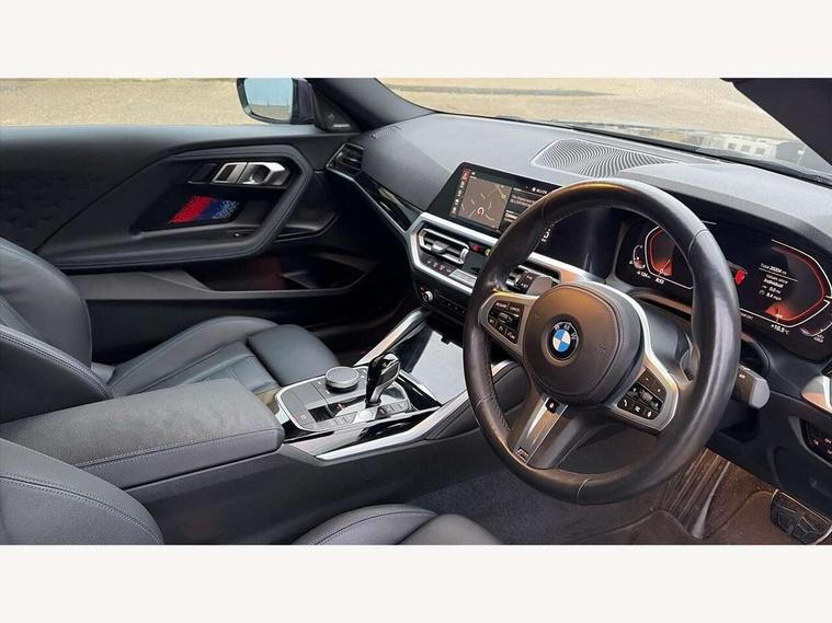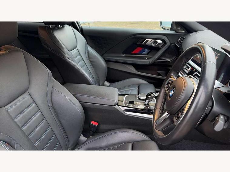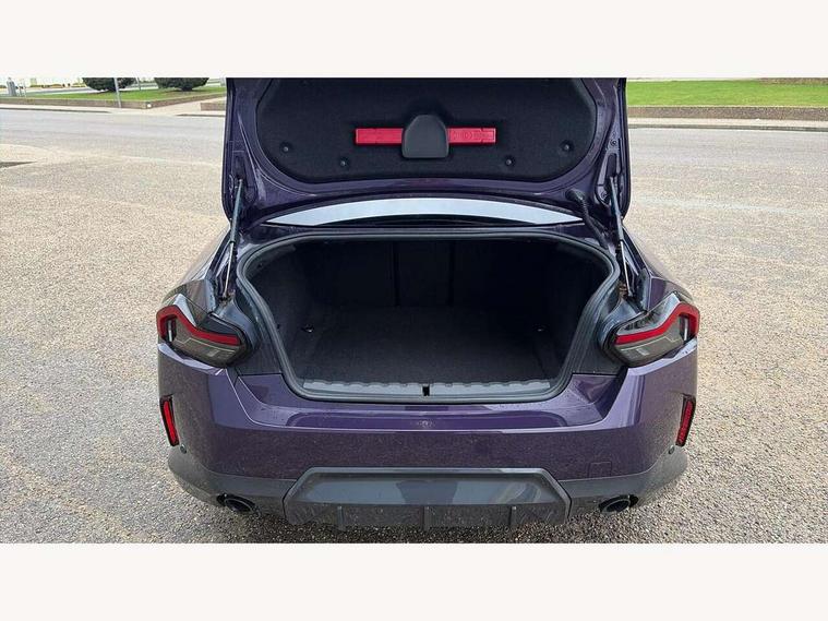 Attentiveness assist, Auto start-stop, Bluetooth, BMW ConnectedDrive online services, BMW Teleservices, Check Control warning system for monitoring of lights and door/luggage compartment open warning, Direct selection buttons, Drive off assistant, Eco pro mode, Electric power steering, Front/rear Parking distance control, iDrive controller with turn and press function, Integrated owners handbook, Intelligent functions, Live cockpit plus with nav function 12.3" instrument cluster and 14.9" centre display, Oil sensor for level and grade, Optimum shift indicator, Personal Profile, Touch operation on control display, Variable sport steering, Widescreen multi-media display, Aluminium lightweight construction, Balancer shaft, BMW TwinPower Turbo four-cylinder petrol engine, Double VANOS, Drive performance control with ECO PRO comfort + sport mode, Electronic differential lock, High precision injection, M sport suspension, Petrol Particulate Filter, Sport automatic steptronic transmission with gearshift paddles, manual gearshift time display, launch control, coasting idle ECO PRO/COMFORT modes, Twin scroll turbocharger with Valvetronic, DAB tuner, Acoustic windscreen wipers for reduced driving noise, Adaptive LED Headlights, Automatic windscreen wipers and automatic headlight, Automatically dimming rear view mirror, Body colour door handles flush with door surface, Body colour door mirrors, Body colour front and rear bumpers, Daytime running lights, Electric windows - front and rear, with open/close fingertip control and trap release, Exhaust tailpipes x2 - 90mm in left and right, Fading support, Front and rear bumper system with replaceable deformation elements, Front door sill finishers in black plastic with BMW designation, Front windscreen wipers with integrated washer jets, Green tinted heat protection glazing, High beam assistant, High gloss shadowline exterior trim in mirror triangle cover, mirror cover panel, mirror bezel and window border, High level third brake light, Indicators integrated int mirror housing, LED registration plate light, LED technology rear tail lights, brake lights and turn indicators, Lightweight engineering, Model designation on right side of tailgate, One piece kidney grille with hight gloss chrome surround, Rear boot, Rear fog lights, Reversing light in rear light cluster, Shark fin antenna, Single part LED rear lights with smoked glass components, Trailer stabilisation logic, Visible VIN plate, 12V power socket in front centre console with blanking plug, 2 cupholders in front centre console, 3 zone automatic air conditioning, Ambient lighting, Compartment in front of cupholder, Conditioned based service, Driver seat backrest width adjustment, Front and rear side armrests integrated into door trim, Front armrest, Front door pockets, Front head restraints, Front sport seats, Heated front seats, Illuminated glove compartment with separate small compartment, M headliner Anthracite, M sport leather steering wheel, Manually adjustment steering wheel column, Rear seat backrest with manual 40:20:40 split folding, Rear seat centre foldable armrest with integrated cup holder, Single front passenger seat, Storage compartment between rear seats, Storage tray and compartment with cover in centre console, Sun visors with vanity mirrors and insert tab, Through loading system with 40/20/40 split folding 2 rear seat in 2nd row, Two folding rear seat headrests, Velour floor mats, Additional storage compartment pack without USB - 2 Series Coupe, Connected pack professional - 2 Series Coupe, Interior and exterior mirror pack - 2 Series Coupe, M Sport exterior styling aerodynamics pack - 2 Series Coupe, 2 tone horn, Anti lock braking system (ABS) with cornering brake control, Automatic Stability Control (ASC), BMW emergency call, Brake drying, Child seat ISOFIX attachment for the two outer rear seats, Crash sensor activating of airbags, Unlocking doors, hazard warning lights, interior light, safety battery terminal, Deactivation of fuel pump in the event of a crash, Driver and front passenger airbags, Driver and front passenger side airbags, integrated in the door side seat backrest bolsters for all seat variants, Dynamic brake control, Dynamic stability control + (DSC+), Dynamic Traction Control - DTC, Electrically operated hand brake including automatic hold function and automatic release when driving off, Front and rear disc brakes, Front passenger airbag deactivation, Head airbags for all 4 outer seats, Manual deactivation of front passenger airbag, Seat belt security check for driver and front passenger, Seatbelt warning, Side impact protection, Three point seat belts on 4 seats including front belt stopper, pyrotechnic belt tensioners and belt force limiters, Tyre pressure sensor, Warning triangle and first aid kit, Alarm system (Thatcham 1) with remote control and electronic engine immobiliser, Central locking switch for all doors, fuel filler cap and luggage compartment, Deadlocking function system to all doors, Drive away locking system on all doors and luggage compartment, Locking wheel bolts, Start/Stop button (illuminated) in centre console with keyless engine start and Auto Start-Stop deactivation button, Two remote control key with integrated key - one button for open and close doors/fuel flap/tailgate and separate button for unlock luggage compartment, BMW mobility tyre sealing system, Electrically powered 12V compressor, Reduced rolling resistance tyres,