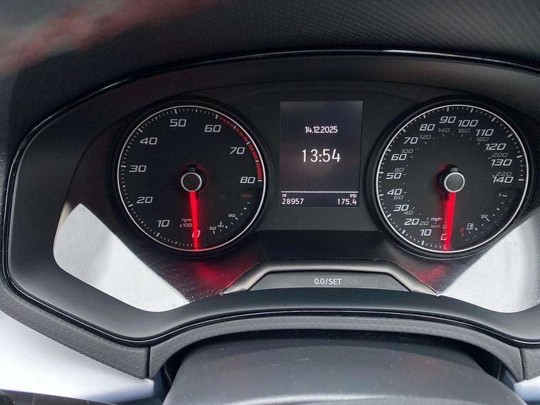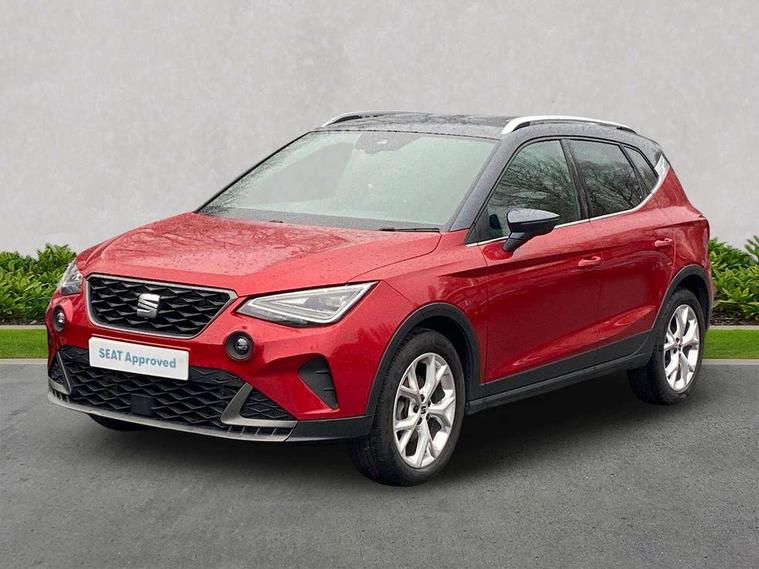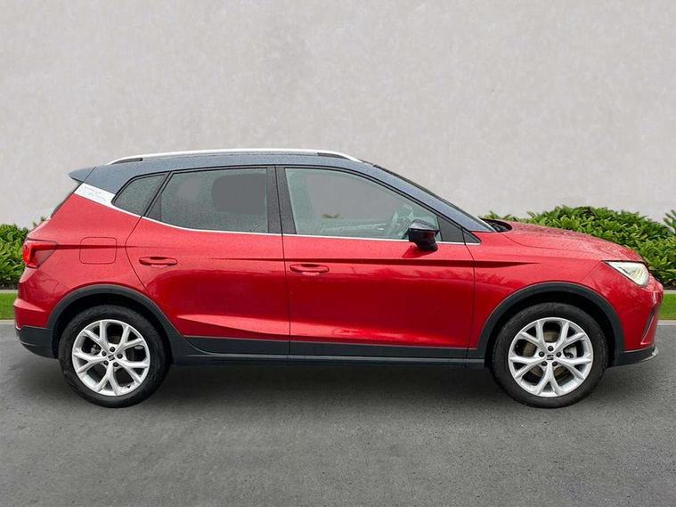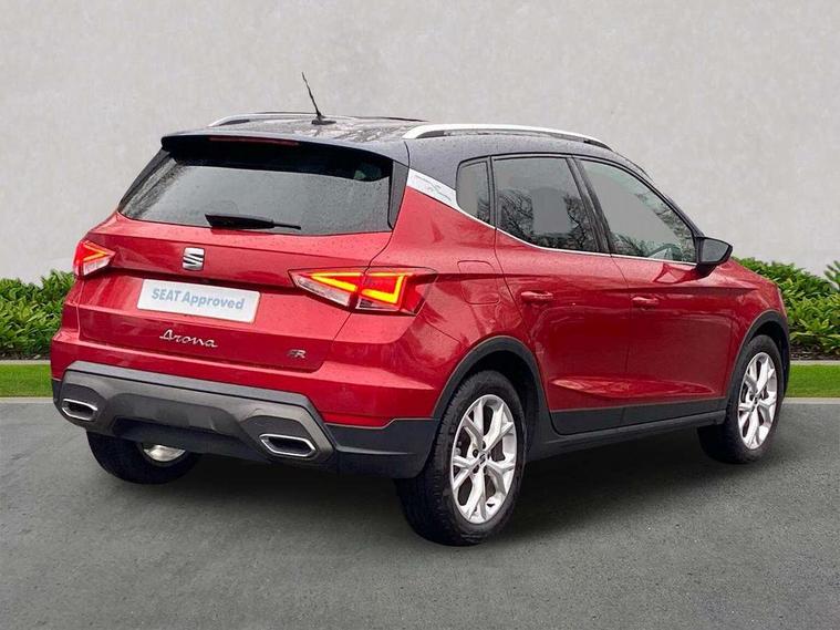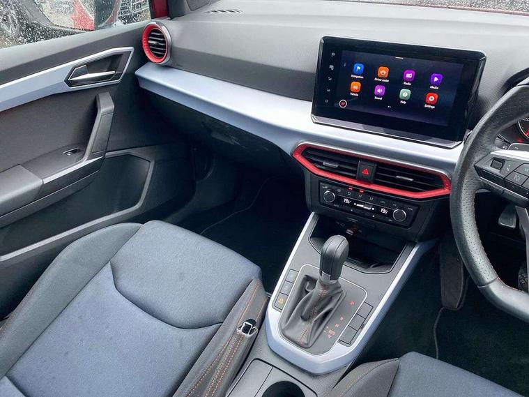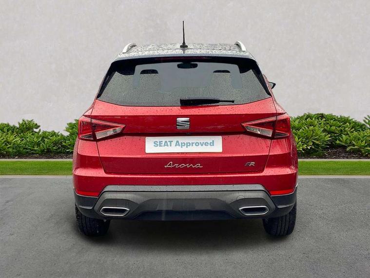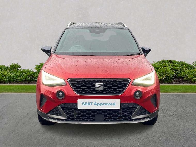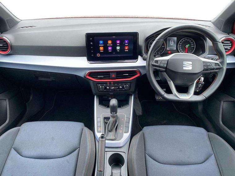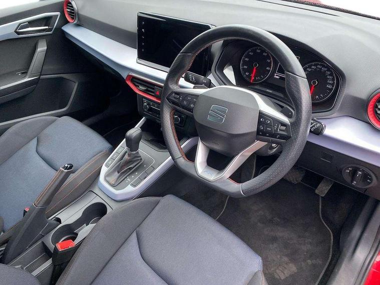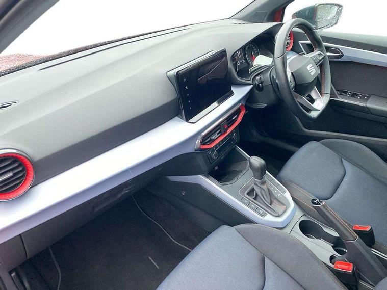 'Lights On' Reminder warning buzzer, Digital clock, E-call, Electric speed sensitive power steering, Full Link Smartphone Integration with Mirror Link, Apple Car Play, Google Android Auto with USB Type C cable for Apple and Android compatibility, Lane keeping system, Low fuel warning light, Outside temperature display, Rear parking sensor, RPM counter, Seat connect with safety, service, remote and online, SEAT Drive profile - Four different models normal-sport-eco-individual, steering response, throttle response and gear shifts mode, Trip computer, Bluetooth interface for hands free and audio streaming, DAB digital radio and AM/FM radio, Steering wheel mounted audio controls, Anti theft roof antenna, Auto dimming interior rear view mirror, Automatic activation of hazard warning lights, Body coloured bumpers, Body coloured door handle inserts, Chrome roof rails and window surrounds, Chrome window trim, Dark tinted rear windows, Electric front/rear windows, Electrically adjustable, heated and folding door mirrors, FULL LED automatic headlights with dynamic headlight range control, coming and leaving home, LED daytime running lights, LED rear tail lights and licence plate lights, Protective side mouldings, Rain sensing wipers, Rear side wing doors, Rear spoiler, Rear window wash/wipe, Roof colour door mirrors, Third brake light, Twin exhaust pipe styling hidden exhaust pipe, Visible VIN plate, Windshield wiper with intermittent control and potentiometer, 2 cupholders, 3 seat bench in 2nd row, 60/40 split folding rear seat, Aircare filter, Black interior roof, Cloth upholstery, Daring red Illuminated coloured air vent, Double boot floor, Driver sunvisor with covered mirror + card holder, Dual zone climate control, Front courtesy light with 2x front and 2x rear reading lights, Front sport seats, Gear shift indicator, Height adjustable front seats, Height/reach adjustable steering column, Illuminated boot, Instrument lighting with brightness control, Interior ambient lighting, Interior light in footwell, central console and door panel, ISOFIX points in outer rear seats with top tether anchorage points, Passenger sunvisor with vanity mirror, Perforated flat bottomed leather steering wheel/gear knob/handbrake with red stitching and FR logo, Single front passenger seat, Steering wheel mounted gearshift paddles, Two front and three rear height adjustable headrests, Connectivity pack plus - Arona, Interior chrome pack - Arona, 3 point seatbelts on all rear seats, ABS, Active front headrests, Child locks on rear doors, Driver and front passenger airbags with front passenger airbag de activation, front side and curtain airbags, Electronic stability control, Emergency Brake Assist (EBA) and front assist, Front and rear seatbelt reminder, Hill hold control, Multi-Collision braking, Tiredness recognition system, Traction control, Tyre pressure monitoring system, Alarm with back-up horn, Electronic engine immobiliser, Locking wheel bolts, Remote central locking + deadlocks, Tow away protection, Titan black dashboard, 17" Dynamic alloy wheels,