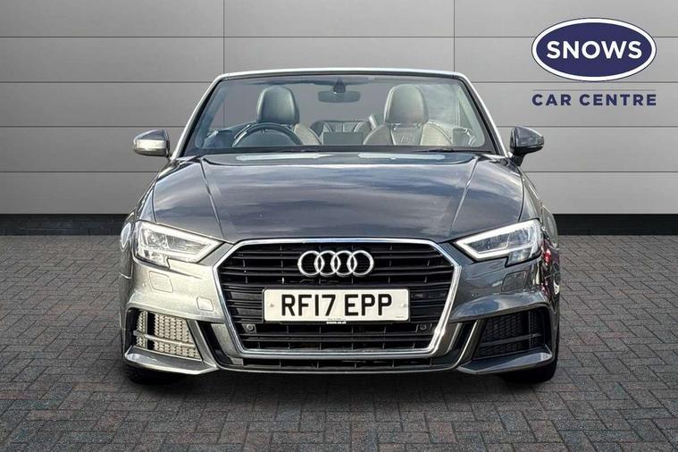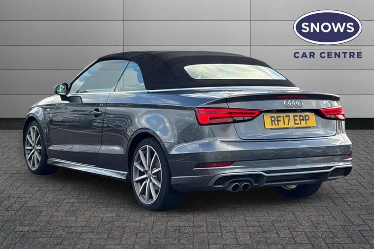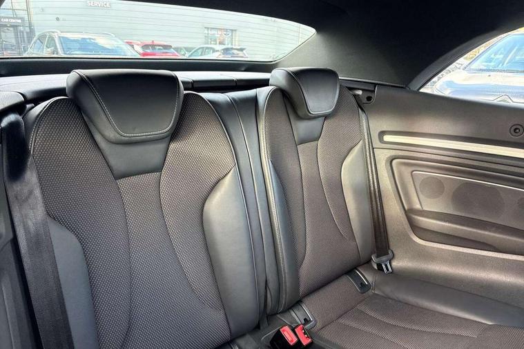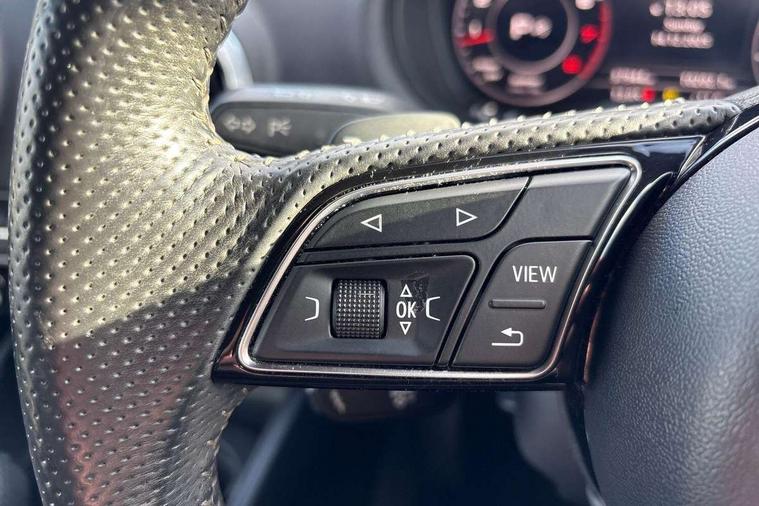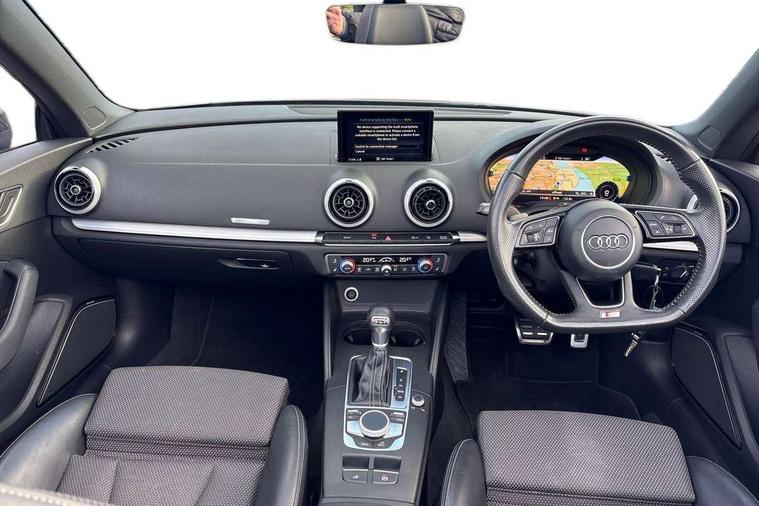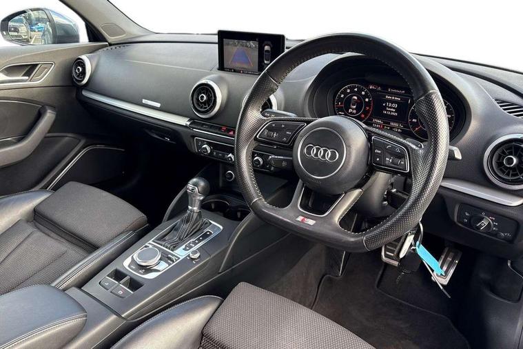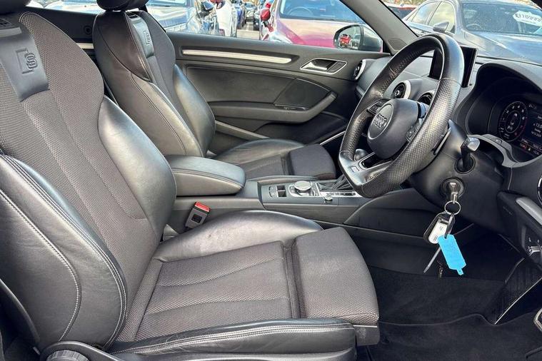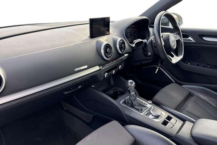 Audi connect, Audi drive select, Audi smartphone interface, Bluetooth interface, Colour driver's information system display, Service interval indicator, 2 USB ports, Audi music interface, DAB Digital radio, Aluminium side window trim, Automatic lights and wipers, Body colour bumpers, Body colour door mirrors with integral indicators, Chrome exhaust tailpipes, Electric operated/heated door mirrors, Front and rear electric windows, Fully automatic acoustic hood, Heated front windscreen, Heated rear window, Heated windscreen washer jets, LED daytime running lights, S Line body styling, 2 height adjustable rear headrests, 3 spoke flat bottom multi-function leather steering wheel including paddle shift, 4 lashing points to secure luggage, 50/50 split folding rear seat, Adjustable front armrest, Driver/passenger sunvisors, Dual zone electronic climate control, Front/rear floor mats, Height adjustable front seats, Height/reach adjustable steering column, Illuminated door sills, Illuminated glovebox, ISOFIX child seat preparation+airbag deactivation, Jack and tool kit, Perforated leather gearknob, Stainless steel pedals, Storage compartment in centre console, Storage compartments in doors, LED interior light pack - A3/RS3, Light and rain sensor pack - A3 Cabriolet, Storage pack - A3 Cabriolet/Saloon, 3 point seatbelts on all seats, ABS/EBD, Active bonnet, Active front headrests, ASR, Automatic roll over protection, Driver and passenger side airbags, Driver/Front Passenger airbags, Drivers knee airbag, EDL, Electromechanical parking brake, ESC - Electronic Stability Control + traction control, Front passenger airbag deactivation, Seatbelt warning, Tyre pressure monitor, Warning triangle and first aid kit, Anti theft alarm, Anti-theft wheel bolts, Immobiliser, Remote control central locking, Aluminium air vent surrounds, Aluminium trim elements, Space saver spare wheel,