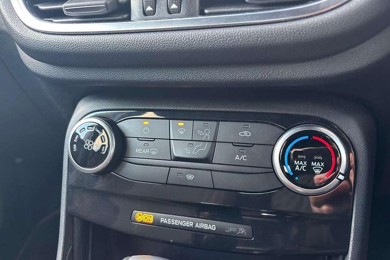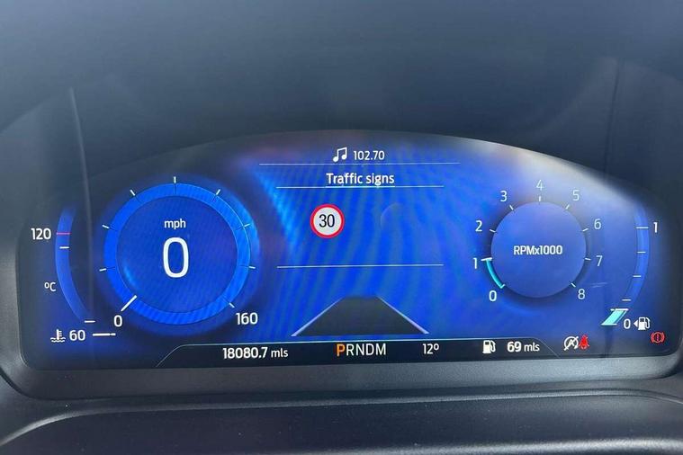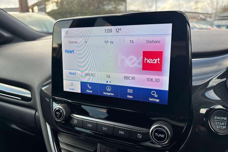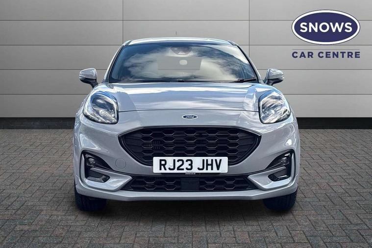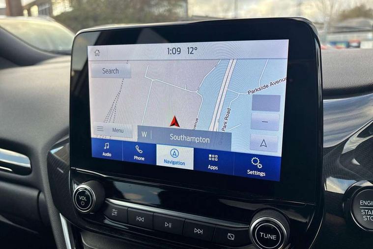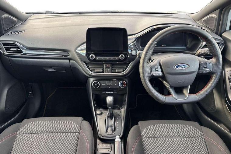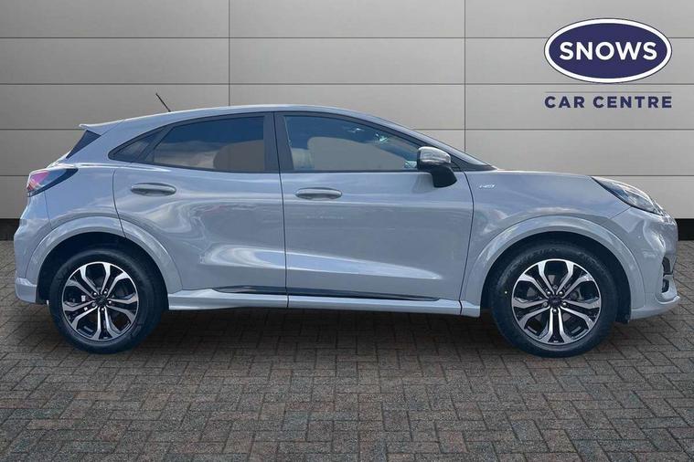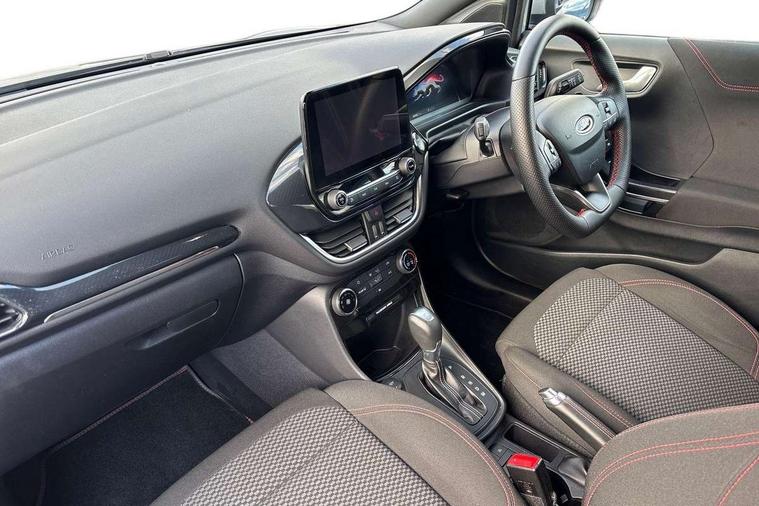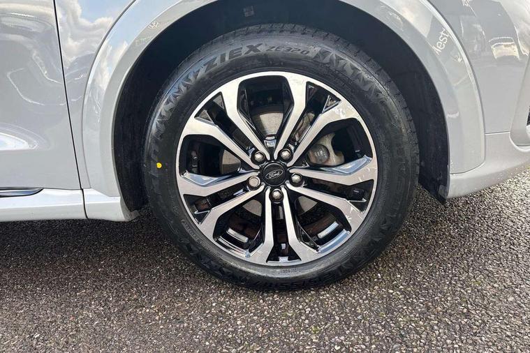 Driver impairment monitor, Emergency call service, Ford easy fuel, Full digital 12.3" instrument cluster, Lane keeping aid with lane departure warning, Power assist steering, Power start button, Rear parking sensor, Selectable drive modes(Normal, Eco, Sport, Slippery and Trail), Speed sign recognition, Sport suspension, Automatic headlights with auto high beam, Automatic rain sensing wipers, LED rear lamps, Power foldable heated door mirrors with puddle lamps, Projector headlamps with LED day time running lights and front fog lamps, Quickclear heated windscreen, Rear side wing doors, Rear wiper, ST-Line body styling kit with unique grille and large body colour rear spoiler, Third brake light, 3 seat bench in 2nd row, Centre console with armrest and stowage, Ford megabox extended bootspace, Front and rear head restraints, Front floor mats, Manual 2 way passenger seat adjustment, Manual 4 way driver seat adjust with lumbar adjustment, Single front passenger seat, ST- Line cloth trim with red stitching, ST-Line flat bottomed sensico leather steering wheel with leather handbrake and aluminium gear knob, Ford SYNC 3 navigation pack - Puma, 3 rear seatbelts, Child safety lock, Electronic stability control (ESC) and hill start assist, Pedestrian/cyclist detection & post-collision braking, Pre collision assist system, Tyre pressure monitoring system (TPMS), Thatcham alarm,