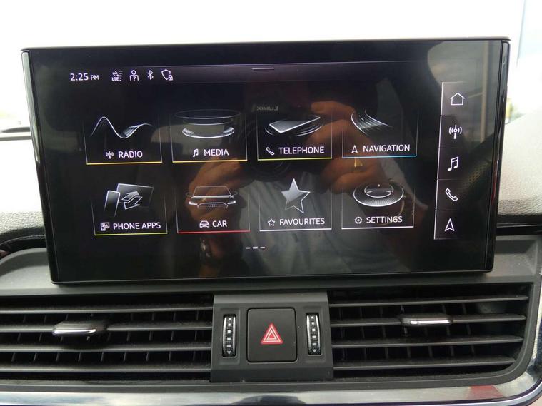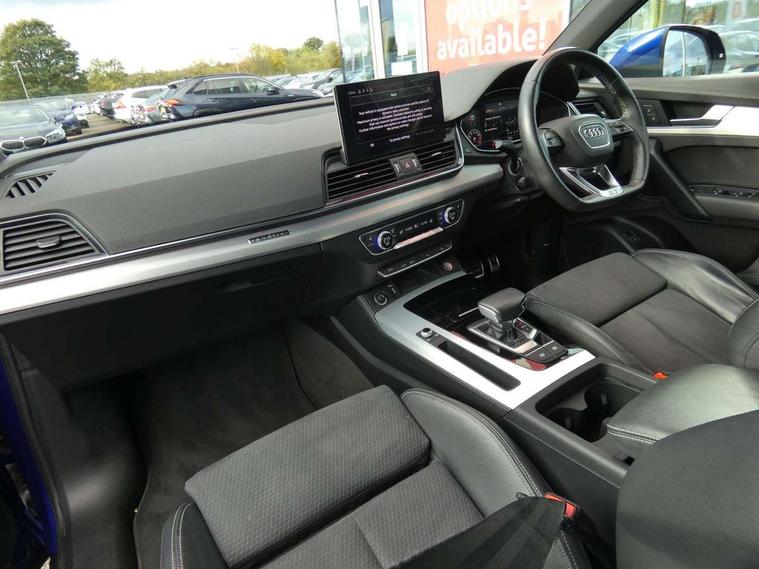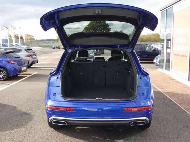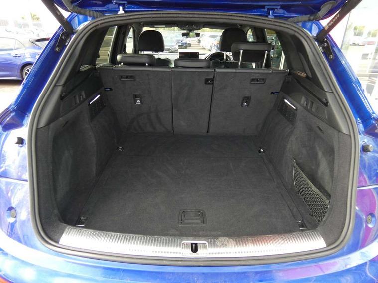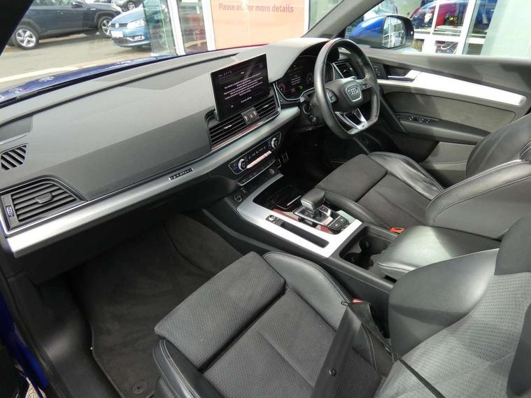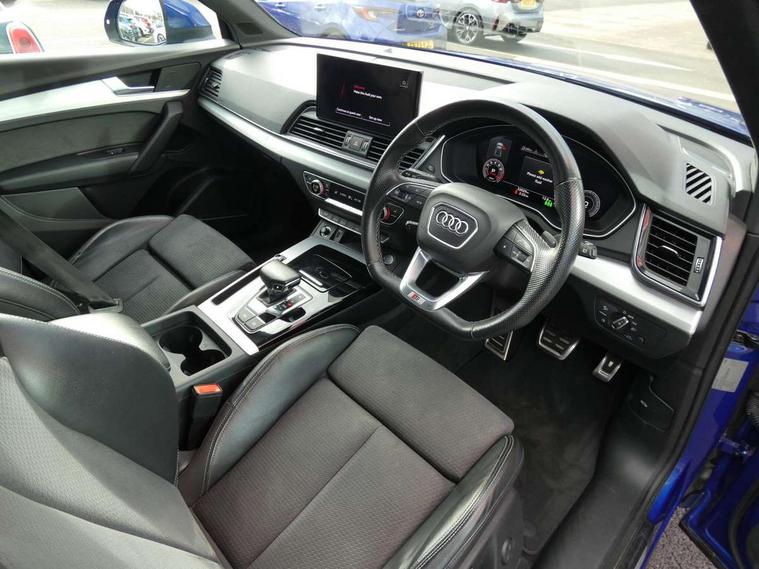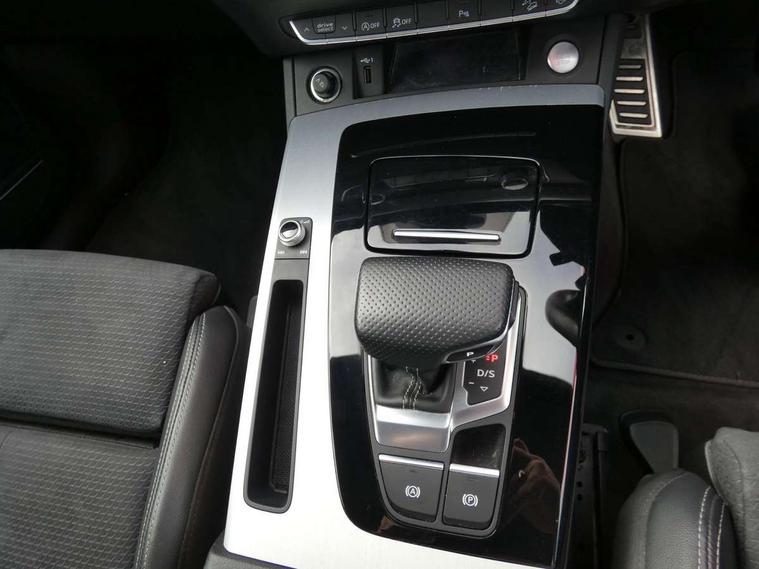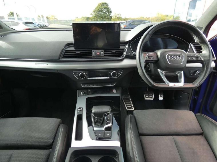 Audi connect safety and service (e-call), Audi connect with Amazon Alexa Integration, Audi drive select, Audi virtual cockpit plus with 12.3" screen and three different layout designs, Audi wireless smartphone interface, Automatic start-stop system with coasting functionality and efficiency programme, Bluetooth interface, Electro - mechanical power assisted steering, MMI navigation plus with 10.1" touch screen, Power tailgate, Reversing camera, Service interval indicator, Voice control system with Audi hotword activation "Hey Audi", Quattro on demand, S line sports suspension, DAB Digital radio, Acoustic windscreen, Aluminium roof rails, Audi matrix LED headlights with dynamic front and rear indicators, Auto dimming rear view mirror, Automatic headlights and windscreen wipers, Body colour bumpers, Body colour door mirrors, Body colour rear diffuser with matt aluminium silver surrounds, Body colour underbody protection, Chrome plated exhaust trims, Door sills in Selenite silver, Electric adjustable/heated/folding door mirrors, Front air inlet surrounds in aluminium, Front and rear electric windows, Front radiator grille in honeycomb design, Headlight washers, Lower bumpers painted in contrast Manhattan grey, Rear chrome trim strip below lights, Rear privacy glass and rear side windows, Rear spoiler, Rear wiper, Roof bars, S Line badges on the front wings, S Line front and rear bumpers, S Line side skirts, 2 x USB charging port with aux input socket, 3 rear headrests, 40:20:40 split folding rear seat with rear centre armrest, Black cloth headlining, Comfort front centre armrest, Contrast stitching on seats, steering wheel and gear lever gaiter, Deluxe 3 zone electronic climate control, Front/rear floor mats, Gear lever in black leather, Heated front seats, Height adjustable front head restraints, Height/reach adjustable steering column, Illuminated door sill trims with S logo, ISOFIX child seat mounting and top tether, Luggage compartment cover, Manual seat adjustment with 4-way electric lumbar support, Removable luggage compartment floor, Stainless steel pedals, Sunvisors with vanity mirrors, High gloss pack - Q5, LED interior light pack - Q5, 3 point seatbelts on all seats, 6 airbags - Driver, front passenger, curtain and side airbags, Electrically operated child locks on rear doors, Electromechanical parking brake, Electronic stabilisation control including ABS, ASR and EDL, Front passenger airbag deactivation, Hill descent control, Hill hold assist, Multi collision brake assist, Pop-up bonnet for pedestrian protection, Pre sense city, Seat belt force limiter, Seatbelt monitoring, Tyre pressure warning, Warning triangle and first aid kit, Anti theft alarm, Anti-theft wheel bolts, Keyless Go access/ignition system, Matt brushed aluminium inlays,