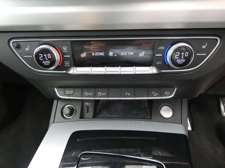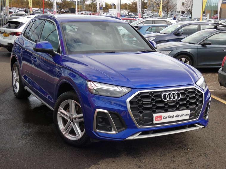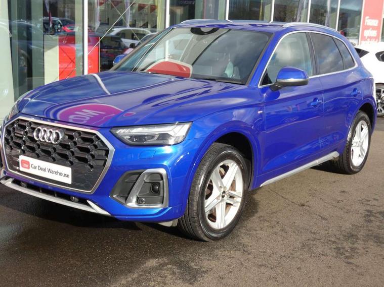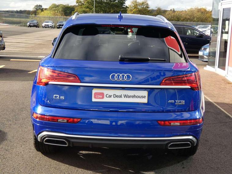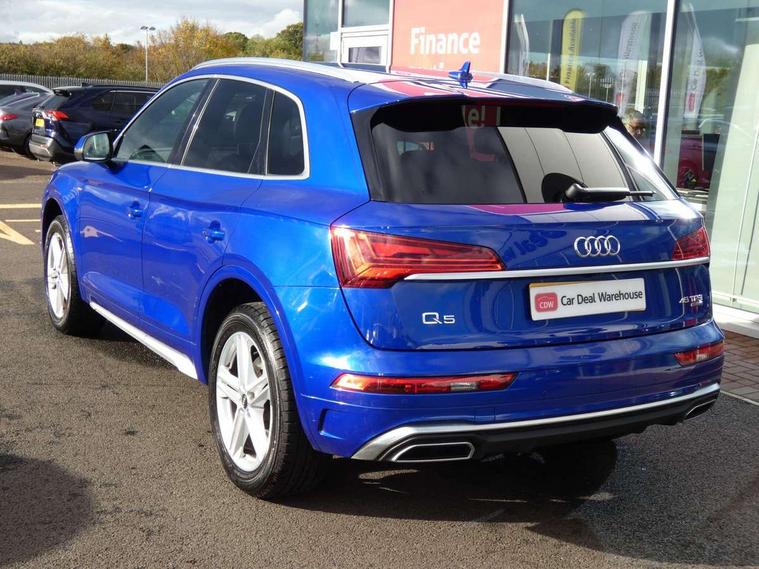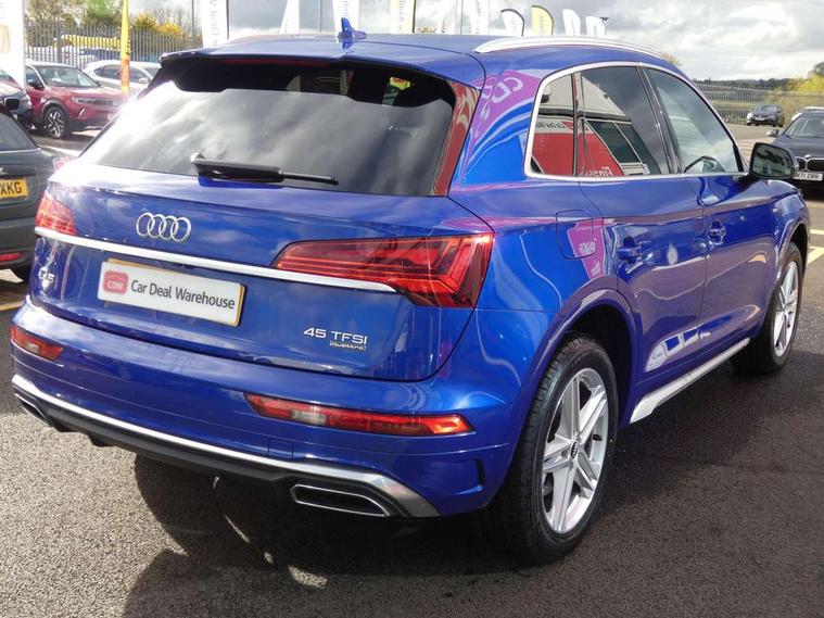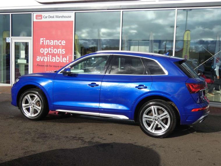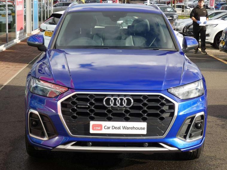 Audi connect safety and service (e-call), Audi connect with Amazon Alexa Integration, Audi drive select, Audi virtual cockpit plus with 12.3" screen and three different layout designs, Audi wireless smartphone interface, Automatic start-stop system with coasting functionality and efficiency programme, Bluetooth interface, Electro - mechanical power assisted steering, MMI navigation plus with 10.1" touch screen, Power tailgate, Reversing camera, Service interval indicator, Voice control system with Audi hotword activation "Hey Audi", Quattro on demand, S line sports suspension, DAB Digital radio, Acoustic windscreen, Aluminium roof rails, Audi matrix LED headlights with dynamic front and rear indicators, Auto dimming rear view mirror, Automatic headlights and windscreen wipers, Body colour bumpers, Body colour door mirrors, Body colour rear diffuser with matt aluminium silver surrounds, Body colour underbody protection, Chrome plated exhaust trims, Door sills in Selenite silver, Electric adjustable/heated/folding door mirrors, Front air inlet surrounds in aluminium, Front and rear electric windows, Front radiator grille in honeycomb design, Headlight washers, Lower bumpers painted in contrast Manhattan grey, Rear chrome trim strip below lights, Rear privacy glass and rear side windows, Rear spoiler, Rear wiper, Roof bars, S Line badges on the front wings, S Line front and rear bumpers, S Line side skirts, 2 x USB charging port with aux input socket, 3 rear headrests, 40:20:40 split folding rear seat with rear centre armrest, Black cloth headlining, Comfort front centre armrest, Contrast stitching on seats, steering wheel and gear lever gaiter, Deluxe 3 zone electronic climate control, Front/rear floor mats, Gear lever in black leather, Heated front seats, Height adjustable front head restraints, Height/reach adjustable steering column, Illuminated door sill trims with S logo, ISOFIX child seat mounting and top tether, Luggage compartment cover, Manual seat adjustment with 4-way electric lumbar support, Removable luggage compartment floor, Stainless steel pedals, Sunvisors with vanity mirrors, High gloss pack - Q5, LED interior light pack - Q5, 3 point seatbelts on all seats, 6 airbags - Driver, front passenger, curtain and side airbags, Electrically operated child locks on rear doors, Electromechanical parking brake, Electronic stabilisation control including ABS, ASR and EDL, Front passenger airbag deactivation, Hill descent control, Hill hold assist, Multi collision brake assist, Pop-up bonnet for pedestrian protection, Pre sense city, Seat belt force limiter, Seatbelt monitoring, Tyre pressure warning, Warning triangle and first aid kit, Anti theft alarm, Anti-theft wheel bolts, Keyless Go access/ignition system, Matt brushed aluminium inlays,