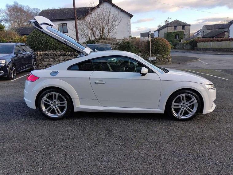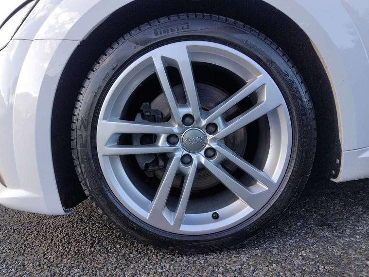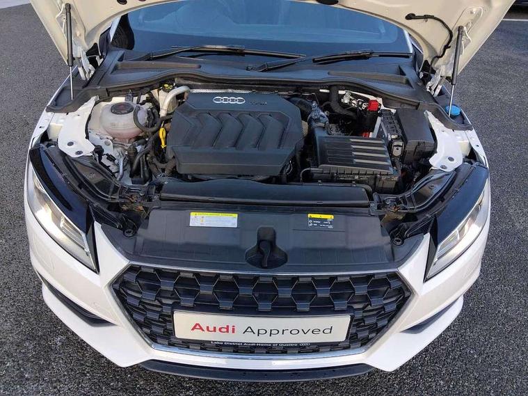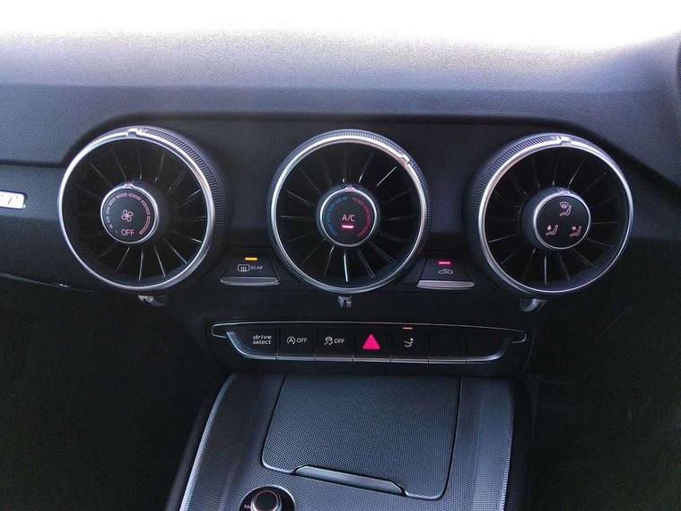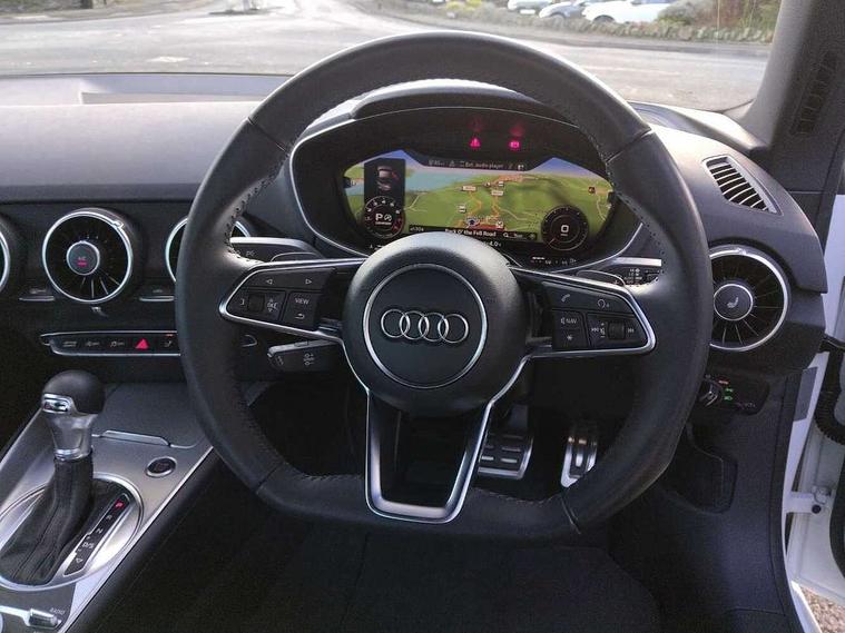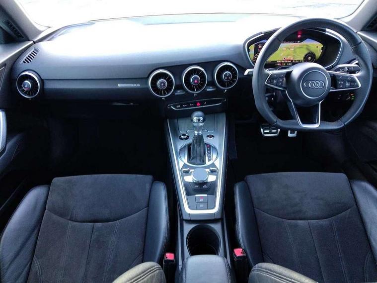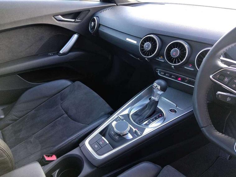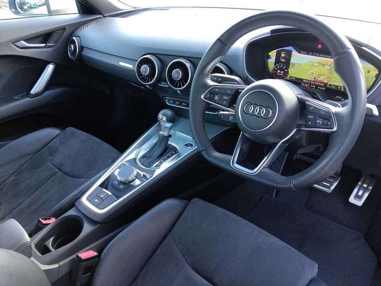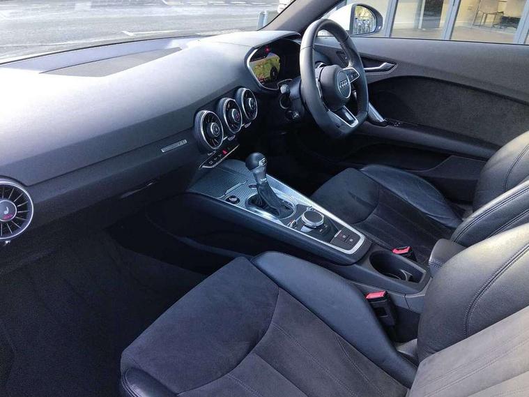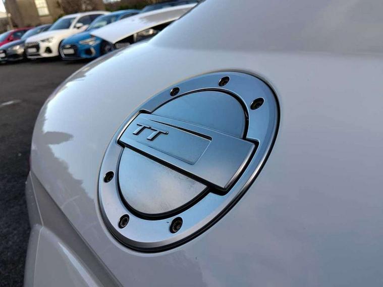 Audi drive select with 4 Pre configured modes, Audi virtual cockpit - 12.3" high-resolution LCD display with fully customisable instrument cluster, Cruise control + speed limiter, MMI touch panel, Mobile phone preparation with bluetooth interface, Progressive power assisted steering, Rear parking sensors, Service interval indicator, Start/Stop system with energy recuperation, TP memo, Sports suspension, 8 speakers, AM/FM radio, Audi music interface, Bluetooth audio streaming, DAB Digital radio, MMI Radio with CD player and SD/XC card slot, Auto dimming rear view mirror, Body colour bumpers, Body colour electrically adjustable and heated door mirrors with built in LED side indicators, Electric folding door mirrors, Electric front windows, Front fog lights, Green tinted heat insulating glass, Light and rain sensors, Retractable rear spoiler, Sunband for windscreen, 12V socket, 3 spoke flat bottomed high multi-function leather sport steering wheel with gearshift paddles, Alcantara/Leather upholstery includes seat centre panels, door trim inserts in black Alcantara with side bolsters, head restraints in black leather, Aluminium door sill trims, Front centre armrest, Heated front seats, Height adjustable driver's seat, Height adjustable front head restraints, Height/reach adjust steering wheel, ISOFIX child seat mounting for front passenger seat with airbag deactivation, Reading lights, Rear top tether child seat ISOFIX attachment, Split folding rear seat, Tool kit, Top tether anchor plate for isofix child seat, Non smoking pack - TT/TT RS, 3 point front seat belts, ABS, ASR traction control, Brake energy regeneration, Curtain airbags, Driver and front passenger airbag with front passenger airbag deactivation, EDL traction control, Electromechanical parking brake, ESP, First aid kit, Front side airbags, Head airbags, Hill hold assist, Seatbelt warning, Tyre pressure warning, Warning triangle, Anti theft alarm, Anti theft wheel bolts, Immobiliser, Keyless Go, Remote central locking, Aluminium design inlays, Tyre repair kit,