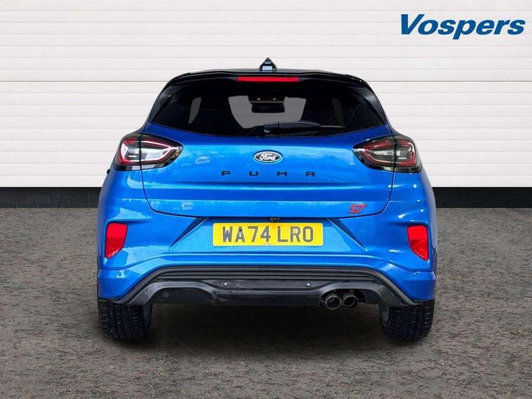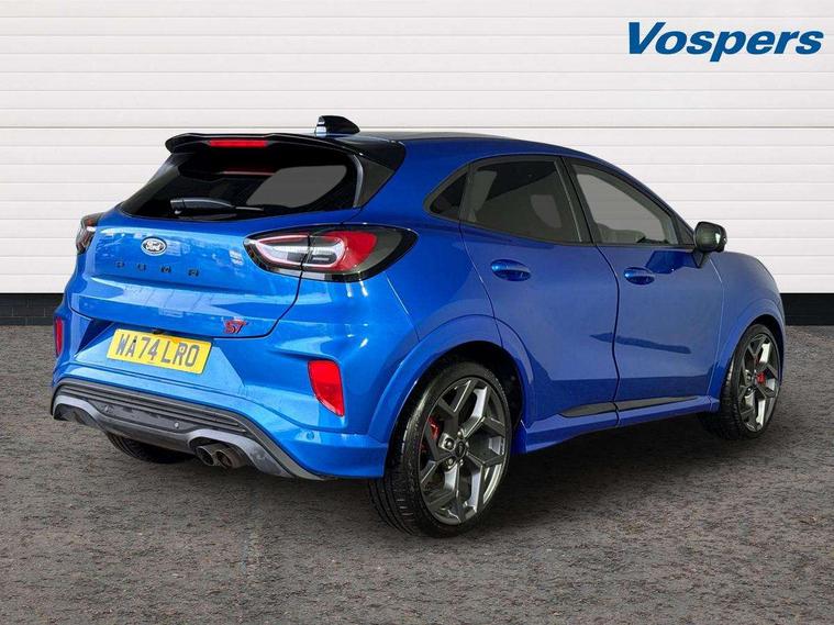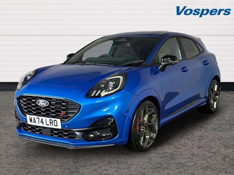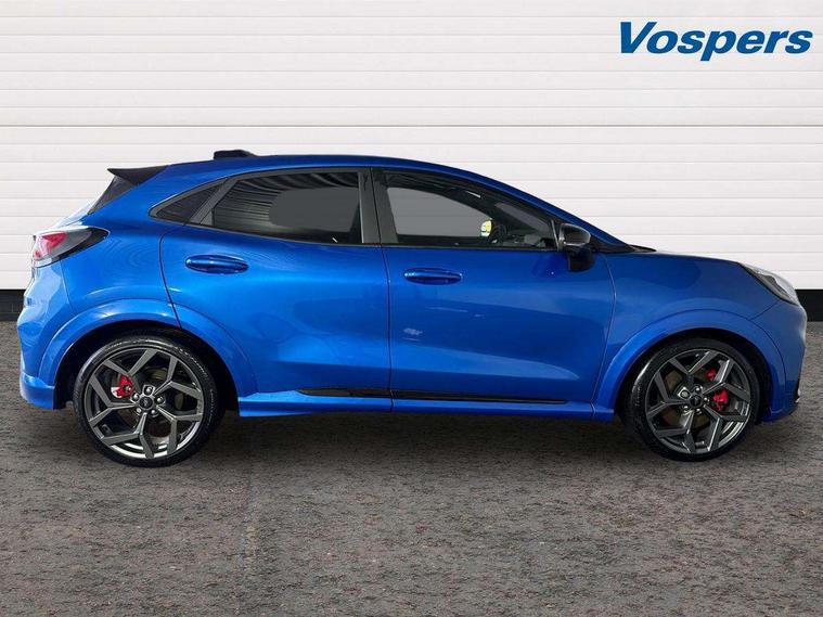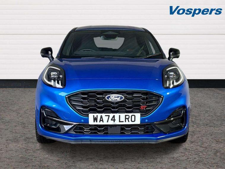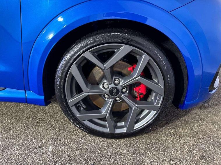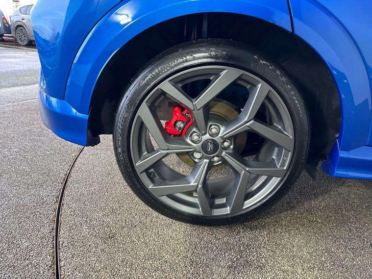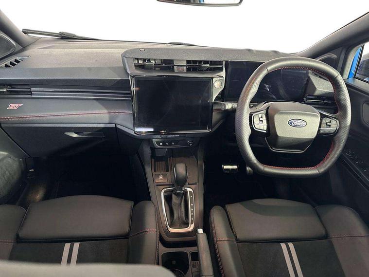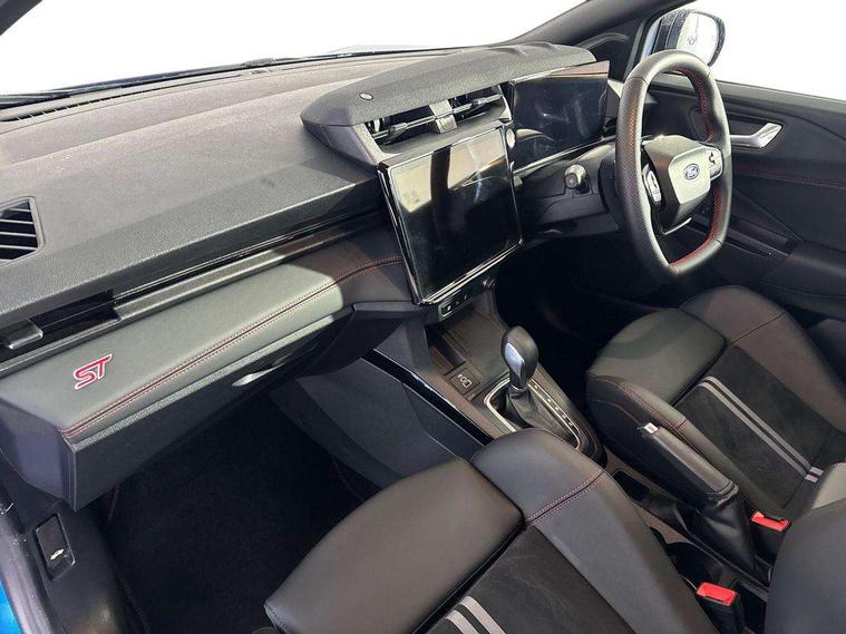 Driver impairment monitor, Emergency call service, Ford easy fuel, Full digital 12.8" instrument cluster, Lane keeping aid with lane departure warning, Power assist steering, Power lift tailgate, Selectable drive modes (normal, sport, eco, track), Speed sign recognition, ST suspension, 12" landscape touchscreen display with wireless apple car play and android auto premium B&O audio system with 10 speakers, Ford pass connect and emergency assistance, Ford SYNC4 with connected navigation, Automatic headlights with rain sensing wipers and auto high beam, Front fog lamps, Glare-free matrix LED headlamps, LED daytime running lights, LED rear lamps, LED third brake light, Power foldable heated door mirrors with puddle lamps and puma logo protection, Quickclear heated windscreen, Rear privacy glass, Rear side wing doors, Rear wiper, Unique ST body styling kit including wing mirrors and Ford Performance embossed splitter, 3 seat bench in 2nd row, Centre console with armrest and stowage, Electronic automatic temperature control (EATC), Ford megabox extended bootspace, Ford Performance seats premium synthetic leather upholstery, Front and rear head restraints, Front floor mats, Manual 6 way driver seat adjust with lumbar adjustment, Manual 6 way passenger seat with lumbar seat adjustment, Single front passenger seat, ST flat bottomed steering wheel with metal grey stitching, Driver assistance pack with blind spot information system - Puma for automatic transmission, Winter pack - Puma, 3 rear seatbelts, Child safety lock, Electronic stability control (ESC) and hill start assist, Pre-collision assist with autonomous emergency braking, pedestrian/cyclist detection & post-collision braking, Red brake calipers, Tyre pressure monitoring system (TPMS), Keyless entry and power start button, Keyless start and wireless charger, Thatcham alarm, 19" alloy wheels with magnetite dark finish, Tyre inflation kit,