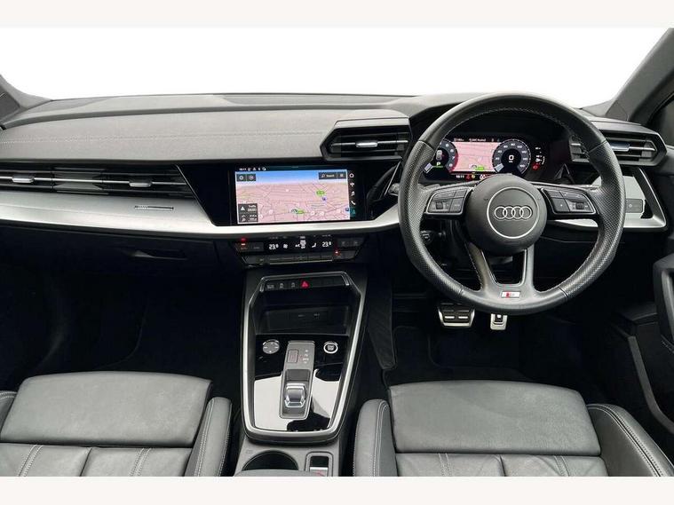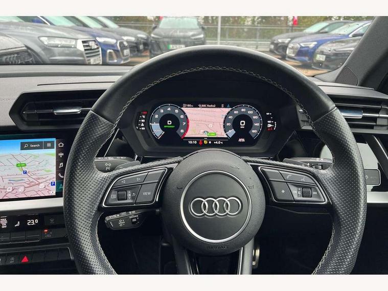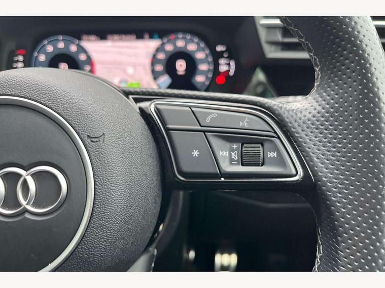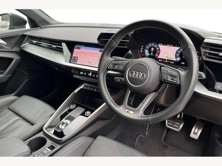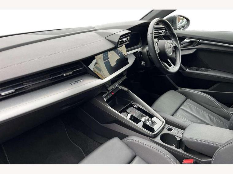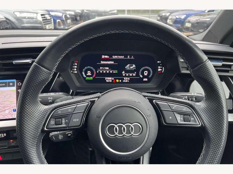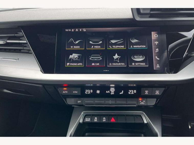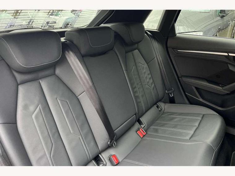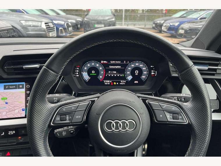 Audi drive select (Auto, Comfort, Dynamic, Efficiency and Individual), Audi smartphone interface, Audi Virtual Cockpit - 10.25" digital and colour instrument cluster, Automatic start/stop system with recuperation, Bluetooth interface, Collision avoidance assistant, e-Call (emergency call), Electromechanical power speed sensitive steering, Lane departure warning system, MMI Navigation Plus with high resolution 10.1" colour touch screen display, Service indicator, Trip computer, Voice control system with natural language interaction, Sports suspension, 2xUSB-C connection with data and charging functions, 6 passive loudspeakers, DAB Digital radio, 3rd brake light, Acoustic glass windscreen, Aluminium window trim, Auto dimming frameless rear view mirror, Body colour exterior mirrors, Electrically adjustable/heated/folding/dimming door mirrors with kerb view includes integrated LED indications + kerb view function for passenger side, Front electric windows, Illuminated aluminium inserts front door sills with S logo, LED daytime running lights, LED headlights with LED rear lights and dynamic rear indicators, Light and rain sensors, Privacy glass - dark tinted rear window, rear door and side windows, Rear electric windows, Rear side air outlets in grained matt black, Rear side wing doors, Rear wiper, S line bumpers, S roof spoiler, 12V socket and storage compartment in front centre console, 3 seat bench in 2nd row, 3 spoke leather multifunction steering wheel with paddle shift, 40/20/40 split folding rear seat bench with cupholder, Black cloth headlining, Dual zone electronic climate control, Front and rear centre armrest in leather, Front and rear headrests, Front/rear floor mats, Height and reach adjustable steering wheel, Illuminated vanity mirror, Interior lighting - glove compartment light and right hand side, Luggage compartment floor covering, Manual boot compartment lid, Manually adjustable front seats, Seat side bolsters, Single front passenger seat, Stainless steel pedals and front footrest in black, Twin leather upholstery with front sports seats S embossed logo, Aluminium interior elements pack - A3 Sportback, LED interior lighting pack - A3 Sportback, S line styling pack - A3 Sportback, 3x3 point rear seat belts, Audi pre sense front, Driver and front passenger airbag with passenger airbag deactivation, Electronic Stabilisation Control (ESC) including ABS, ASR and EDL, First aid kit with warning triangle and 2 safety vests, Front side airbags with head airbags and interaction airbag, Pre-sense front with pedestrian and cyclist detection, Seatbelt monitoring, Tyre pressure loss indicator, Anti theft alarm, Anti-theft wheel bolts, Electronically operated child lock, Immobiliser, Remote control central locking, Accent surfaces in the dashboard and centre console in platinum grey silk effect paint finish, Dark spectrum aluminium inlays,