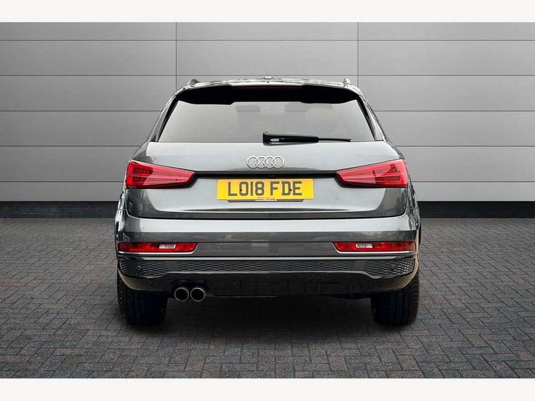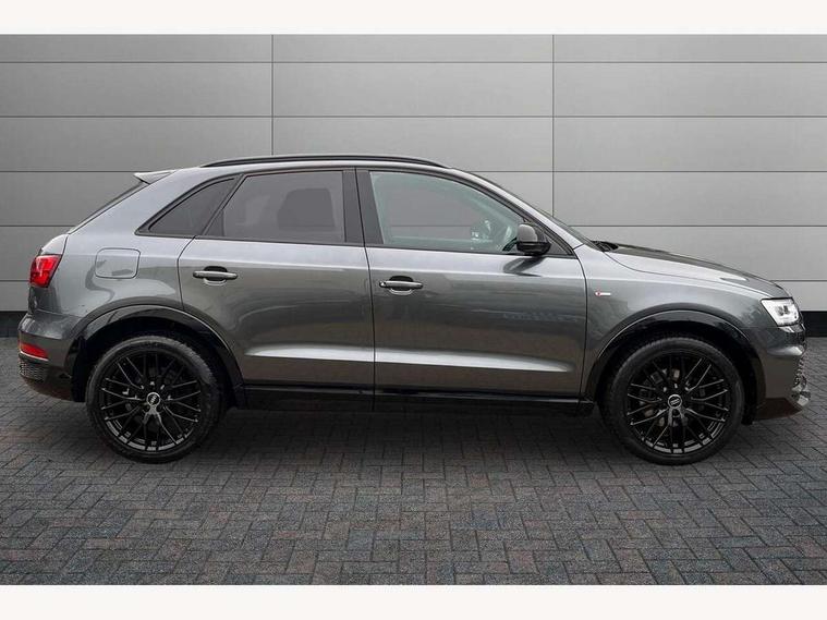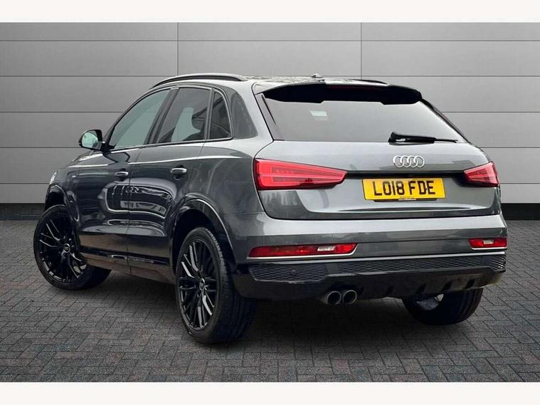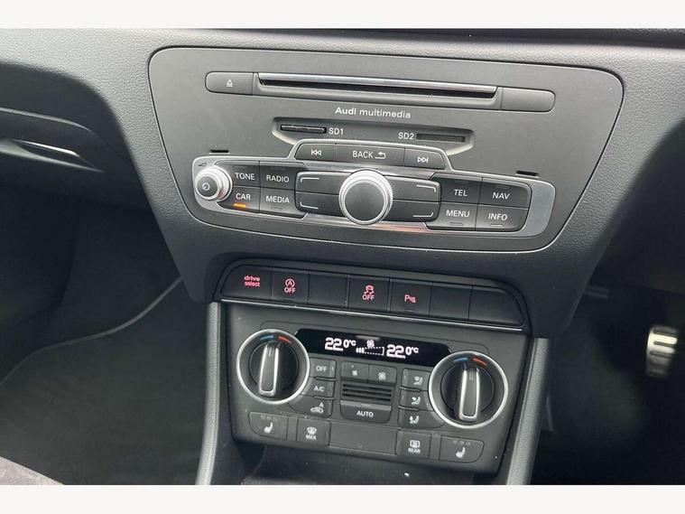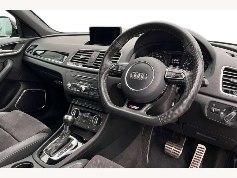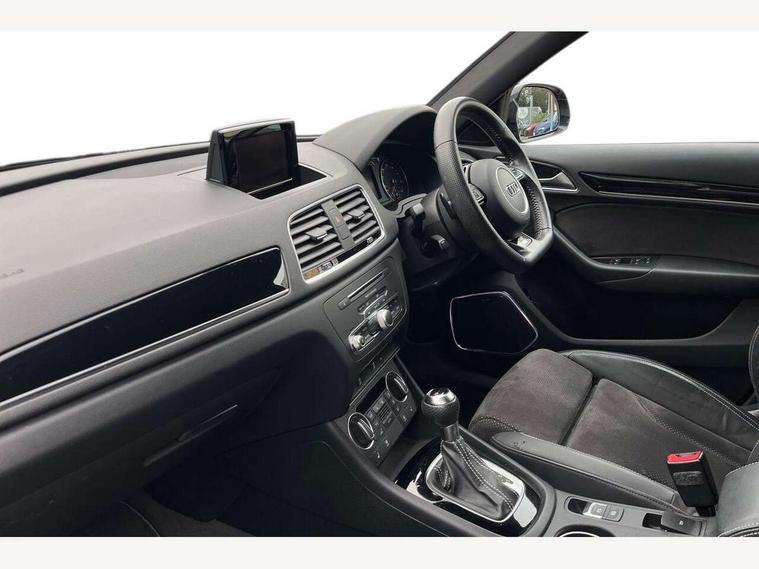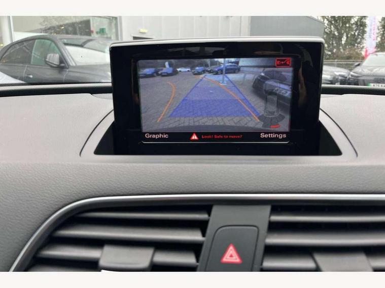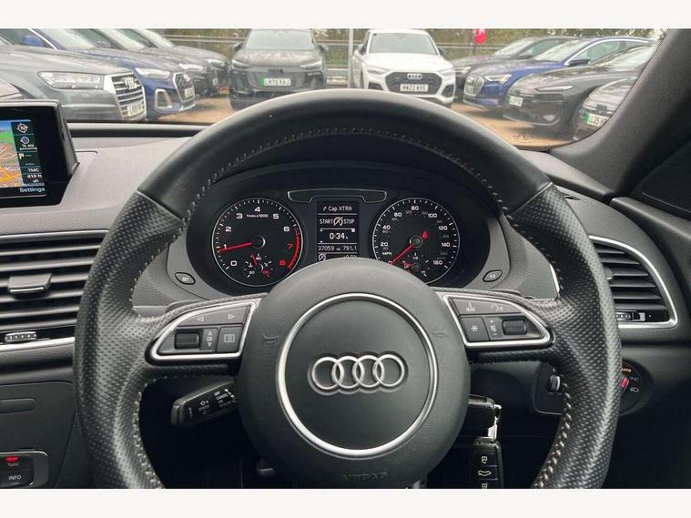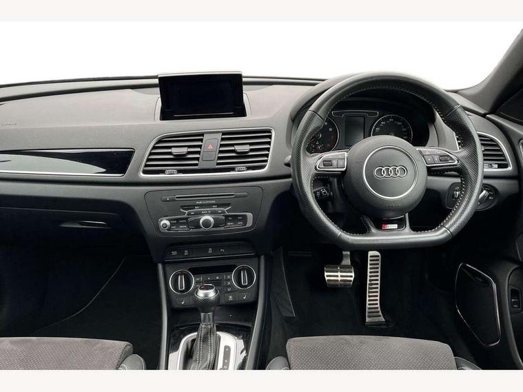 6.5" colour display screen, Audi drive select, Cruise control, Electro-mechanical PAS, Low washer fluid indicator, MMI - Multi Media Interface control system, On board computer, Remote electric boot opening/closing, Service interval indicator, Voice control system, Sports suspension, Audi music interface, BOSE sound system, DAB digital radio module, Acoustic windscreen, Aluminium window surround, Auto dimming rear view mirror, Black exhaust tailpipes, Black high gloss door mirrors, Black roof rails, Coming home function, Door mirror integrated indicators, Front and rear electric windows, Front fog lights, Front lip spoiler, Heated windscreen washer jets, High Gloss Black Contrast Bumpers, High Gloss Black rear spoiler, LED daytime running lights, LED headlights with headlight washers, LED rear lights, Light and rain sensor for auto activation of lights and windscreen wipers, Loading sill protector in stainless steel, Privacy glass, Rear diffuser with platinum insert, Rear wiper, S Line body styling, Sunband for windscreen, 12V socket in rear centre console, 3 spoke flat bottom multi-function perforated leather steering wheel with contrast stitching and aluminium gearshift paddles, Aluminium door sill trims, Aluminium gear knob, Black cloth headlining, Door sill trim strips, Dual zone climate control, Electric front lumbar adjustment, Front and rear headrests, Front and rear velour floor mats, Front centre armrest with storage compartment and angle adjustment, Front sports seats, Height/reach adjust steering wheel, ISOFIX on front passenger and rear outer seats, Jack and tool kit, Retractable luggage cover, Reversible boot floor, Split fold rear seat, Stainless steel pedals, Storage compartment and 12V socket, Under floor storage in luggage area, Audi Exclusive black styling pack - Q3, LED interior light pack - Q3, 3x3 point rear seatbelts, ABS+Electronic Brake force Distribution, Curtain airbags, Driver and passenger airbags, Driver and passenger side airbags, EDL + ASR, Electrically operated child locks on rear doors, Electromechanical parking brake, ESP, First aid kit, Front passenger airbag deactivation, Head airbags, Seatbelt warning light, Tyre pressure monitoring system, Warning triangle, Locking wheel bolts, Remote central locking, Thatcham category 1 alarm + immobiliser, Piano black finish inlay,
