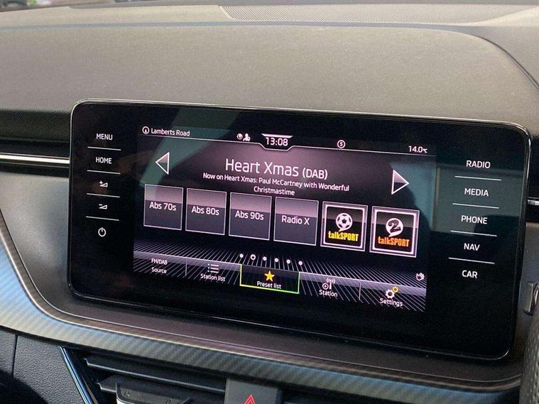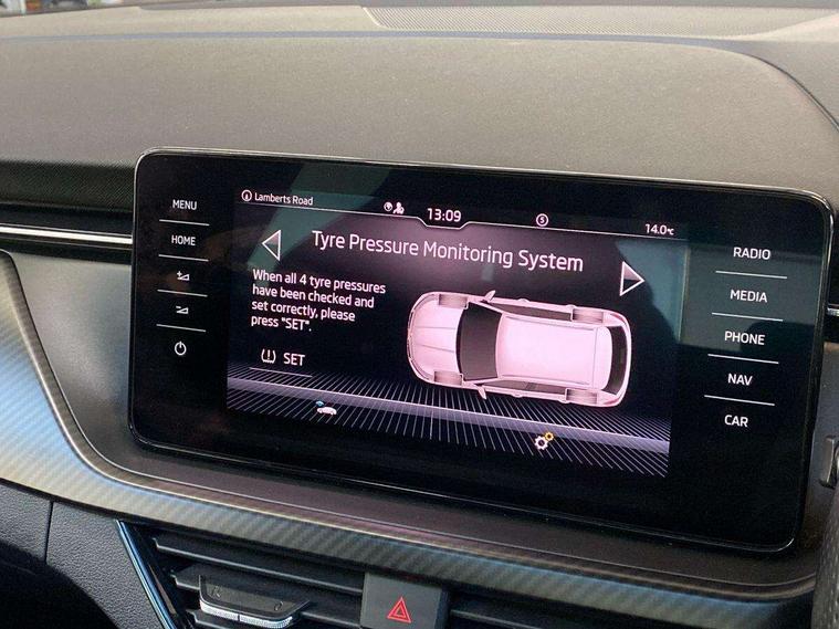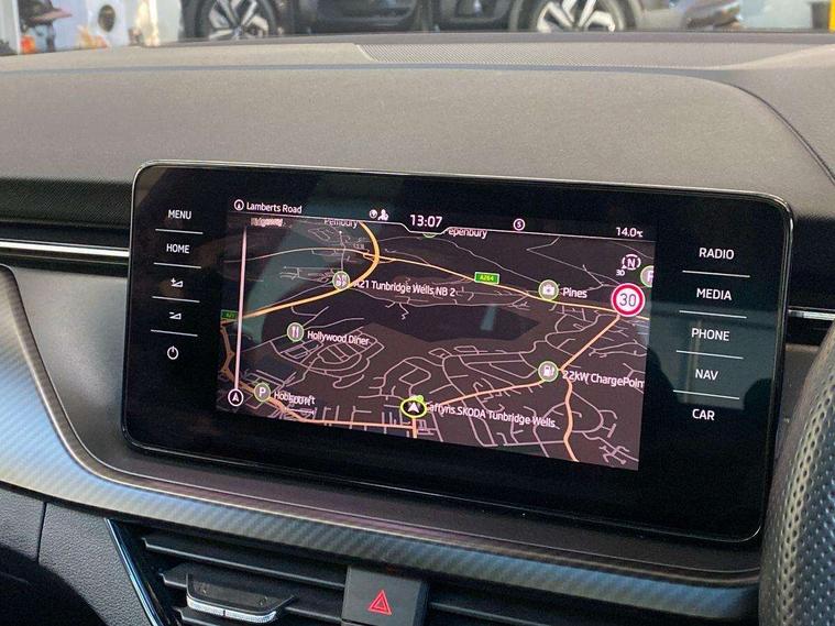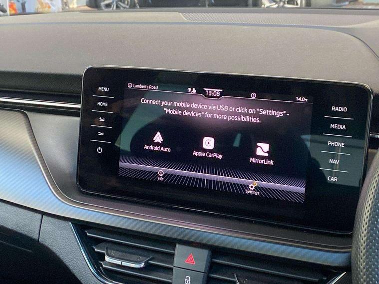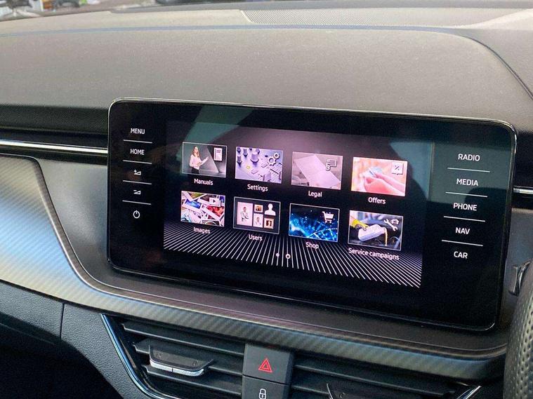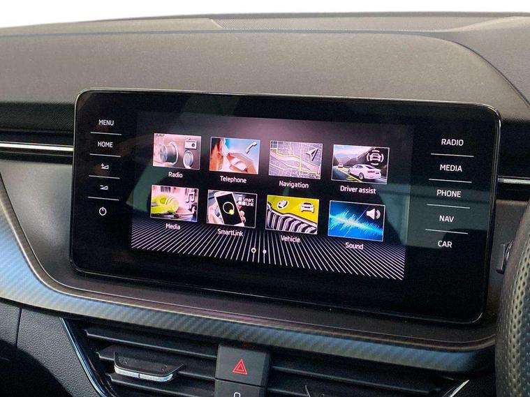 Amundsen satellite navigation with 9.2" touchscreen display, voice control, virtual cockpit and web radio, Bluetooth system, E-call, Front assist system, Gesture control, PAS, Service indicator, Speed limiter, Virtual cockpit with 10.25" display, Wireless SmartLink for apple car play, android auto and mirrorlink, 8 Speakers, Auxiliary input socket, DAB Digital radio, Black door mirrors, Black radiator grille, Black rear diffuser, Body colour bumpers, Body colour door handles, Body colour roof spoiler, Boot lettering in black, Chrome grille surround, Dimming rear view mirror with black surround, Electrically adjustable and heated door mirrors, Fixed panoramic sunroof with black roof rails, Front and rear electric windows, Front sport bumper, Full LED headlights with adaptive front light system, dynamic indicators, cornering function and fog lights, Headlight range control, Heated rear window, High functionality rear led lights with dynamic indicators, KAMIQ Door sills, Light sensors, Monte carlo plaque, Privacy glass, Rear fog lights, Rear side wing doors, Rear wiper, 12V Accessory socket in centre console, 3 seat bench in 2nd row, Aluminium pedals, Black ceiling for black/beige interior, Chrome inner door handles, Cloth upholstery, Front head restraints, Glove compartment with illumination, Ice scraper, Isofix child seat fittings on outer rear seats, ISOFIX on front passenger seat, Leather gear lever, Manual lumbar support for front seats, Rake/reach adjustable steering wheel, Reading lights, Single front passenger seat, Sports seats, Sun visors with illumination on front passenger, Textile floor mats, Third rear headrest, Top tether for front passenger seat, Umbrella in driver's door, 3x3 point rear seatbelts, Airbags - driver and front passenger, ESP, Front passenger airbag deactivation switch, Front side airbags with curtain airbags, Hill hold control, Manual parking brake, Manual rear child locks, One tone horn, Rear disc brakes, Seatbelt reminder for driver an co-driver, Traction control, Tyre pressure monitor, Anti-theft alarm system with interior monitoring, backup horn, towing protection and remote central locking with SAFE system, Anti-theft wheel bolts, Electronic engine immobilizer, Chrome air vent surrounds, 18" Vega alloy wheels in black,