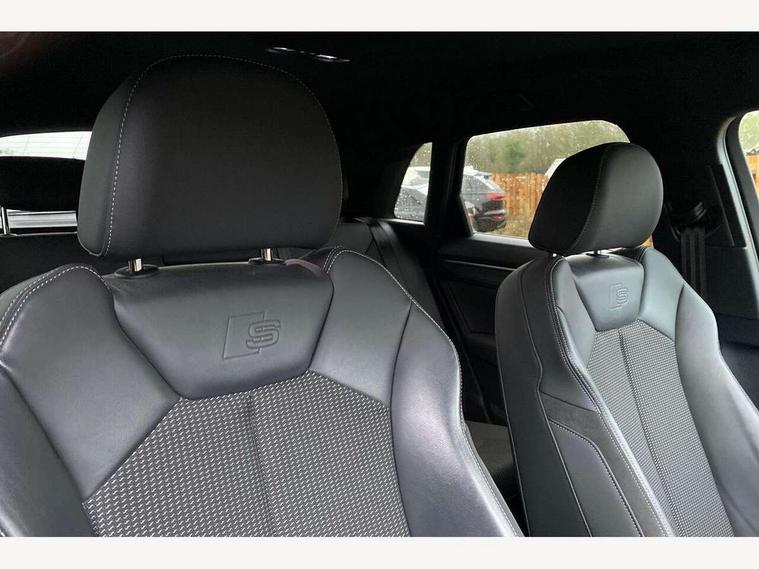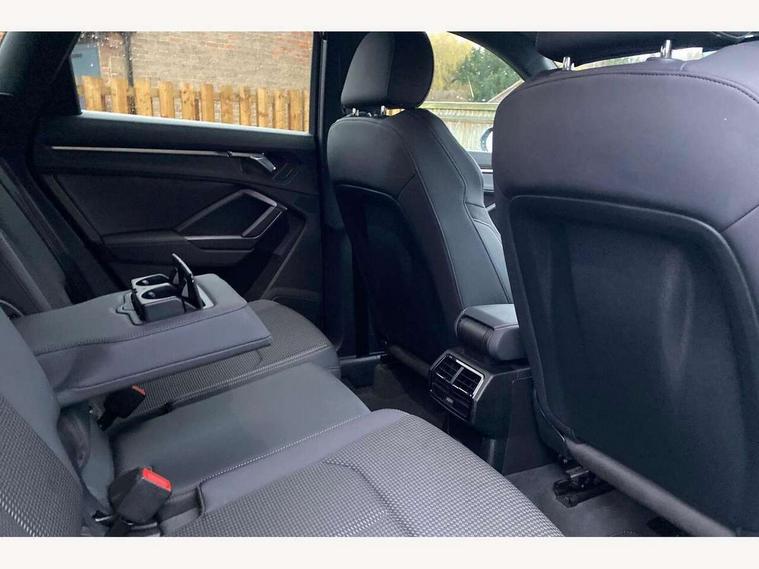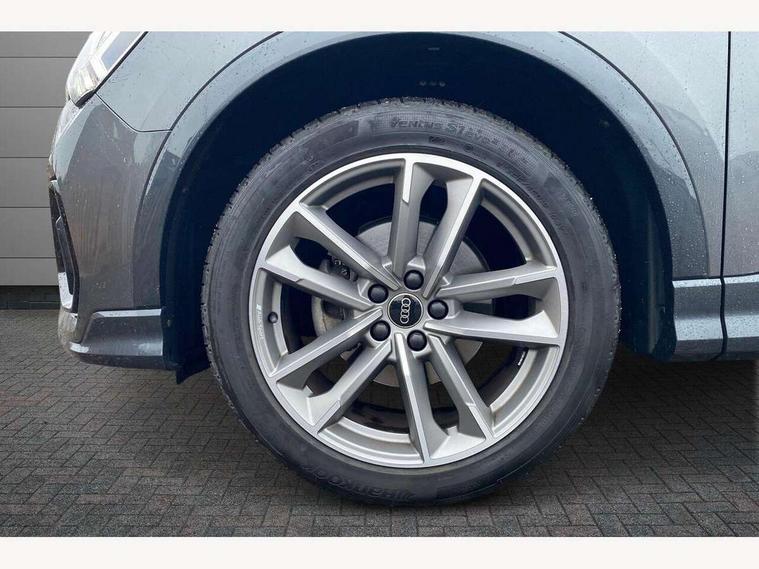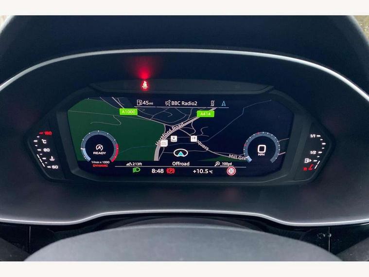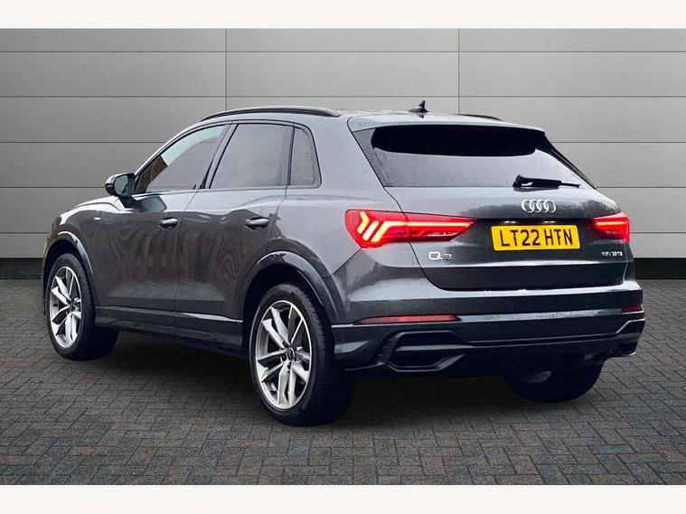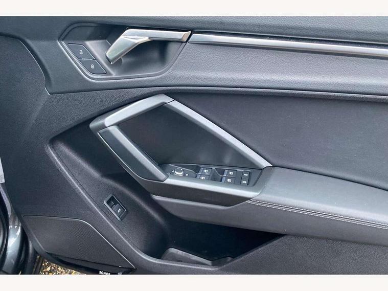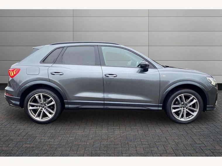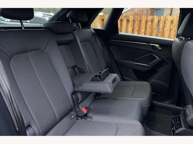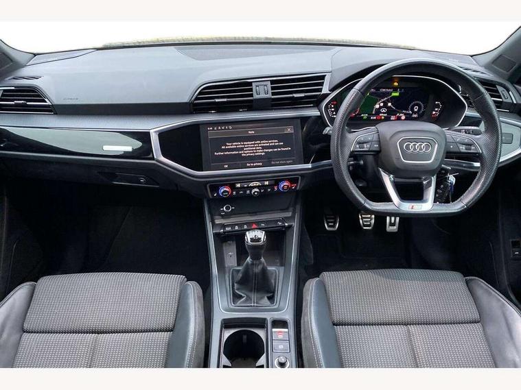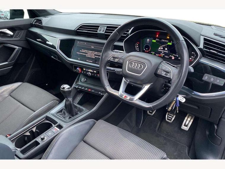 Amazon alexa Integration, Audi connect safety and service (e-call), Audi drive select, Audi lane departure warning, Audi Virtual Cockpit - 10.25" display, Bluetooth interface, Camera based traffic sign recognition, Cruise control + speed limiter, MMI Navigation Plus with high resolution 10.1 inch touchscreen colour display, Power operated tailgate, Progressive steering, Rear parking sensors, Service interval indicator, Smartphone interface includes wireless Apple carplay/Android Auto, Start stop system with recuperation, Voice control system with natural language interaction, Sports suspension, 2 USB-C ports with charge and data functions, 6 passive loudspeakers, DAB digital radio module, Acoustic windscreen, Auto dimming frameless rear view mirror, Black roof rails, Electrically folding, adjustable and heated door mirrors with integrated LED side indicators and kerb view function for passenger side, Front and rear electric windows, Front fog lights, Grille vertical bars in aluminium silver/Matt, High gloss black finish B and C pillars, LED headlights with LED daytime running lights and dynamic rear indicator, LED rear lights, Privacy glass dark tinted rear and rear-side windows (from B-pillar backwards), Rain and light sensors, Rear diffuser strip in matt titanium black, Rear side wing doors, Rear wiper, S line bumpers in contrasting Manhattan grey, Third brake light, Tinted rear windows, Variable front intermittent wipers, 12V socket in rear centre console, 3 seat bench in 2nd row, 3 spoke flat bottomed multi-function leather sport steering wheel, 40:20:40 folding with manual adjustment for 60:40 forwards/backwards position and backrest angle, Adjustable rear seat bench/backrest with centre armrest and cupholder, Black cloth headlining, Dual zone electronic climate control, Front and rear black floor mats with contrast stitching in rock grey, Front and rear headrests, Front and rear roof module including reading lights, Front centre armrest, Glove compartment lighting, Height and reach adjustable steering wheel, Illuminated door sill trims with S logo, ISOFIX child seat mounting for front passenger with airbag deactivation and outer rear seat including top tether attachment point for outer rear seats, Luggage compartment light, Manual front seats with height adjustment, Perforated leather gearknob, Single front passenger seat, Stainless steel luggage compartment sill finisher, Stainless steel pedals, Black styling pack - Q3, Non smoking pack - Q3, 3x3 point rear seatbelts, 6 airbags - Driver, front passenger, curtain and side windows, Audi pre-sense front with pedestrain and cyclist recognition, Electrically operated child locks on rear doors, Electromechanical parking brake, Electronic stabilisation control including ABS, ASR and EDL, Front seatbelt reminder, Hill descent control, Hill hold assist, Pre sense basic, Seatbelt monitoring, Tyre pressure warning, Warning triangle and first aid kit, Anti theft alarm, Anti theft wheel bolts, Immobiliser, Remote central locking, Detail dashboard around MMI touch colour display in glass look, black with surround in aluminium look, Leatherette door armrest, Piano black inlay,