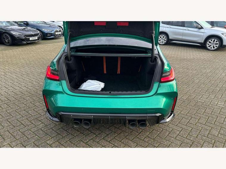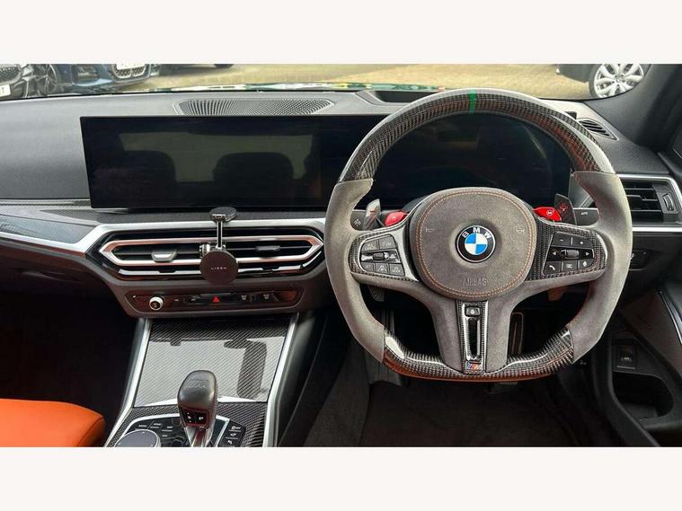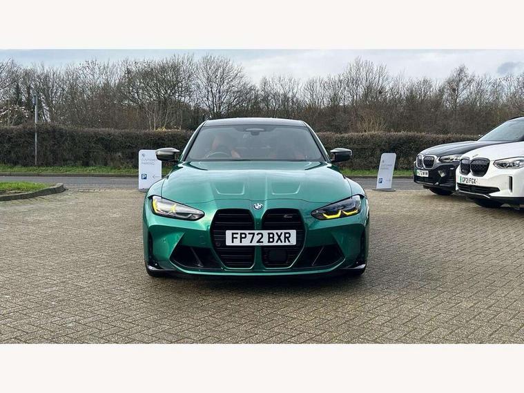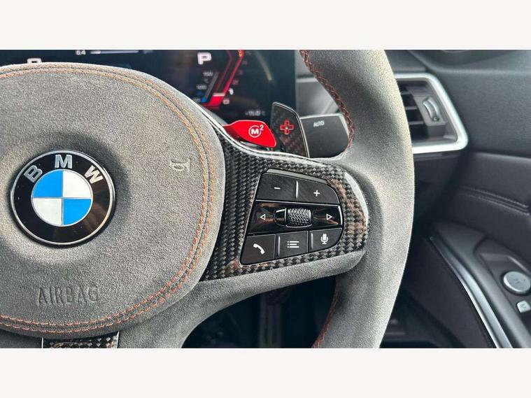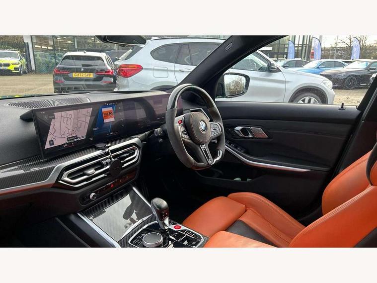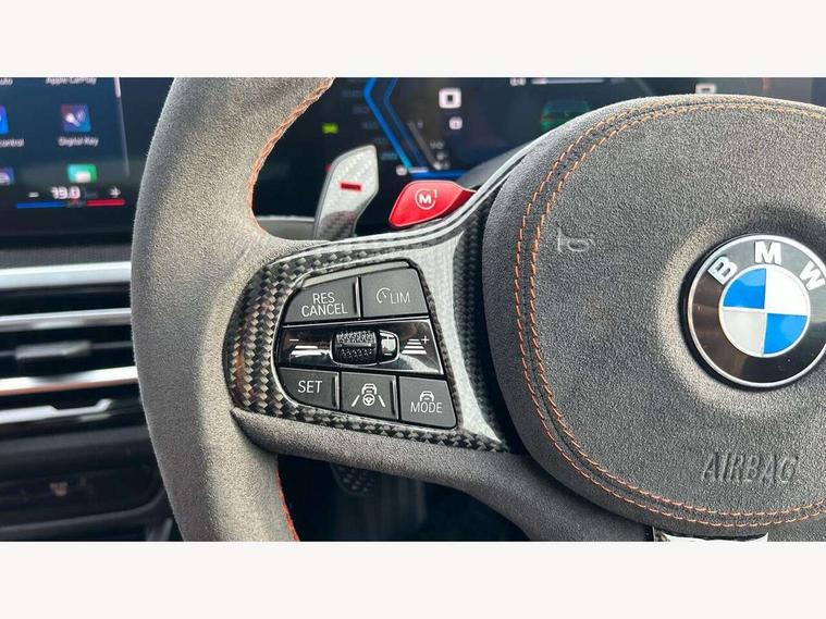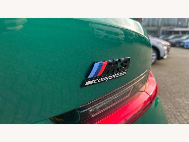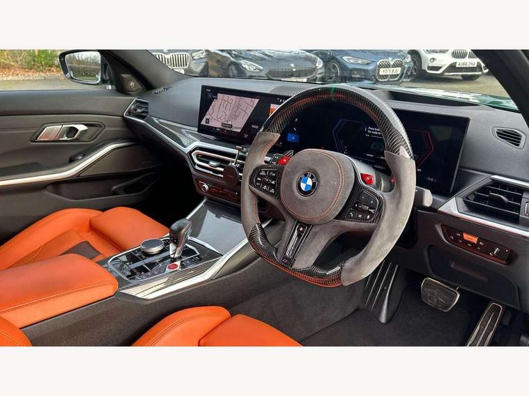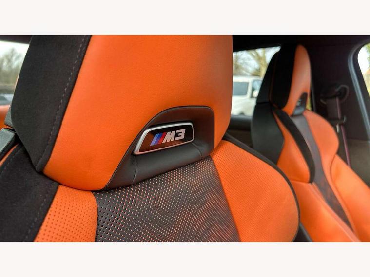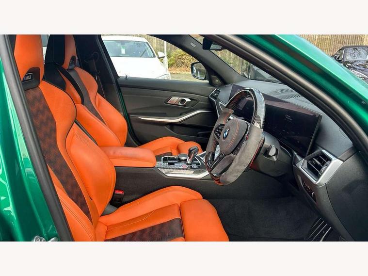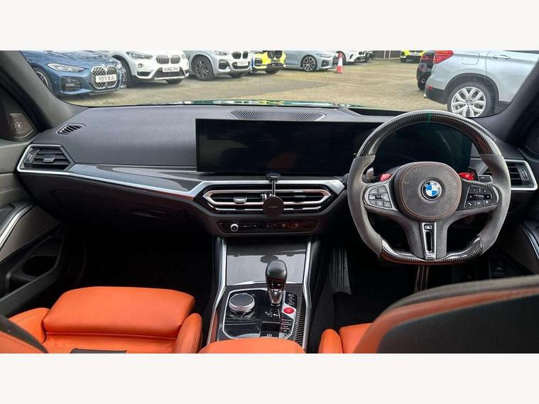 Active guard plus, Automatic start/stop system, Bluetooth functionality with Apple CarPlay/Android Auto, BMW iDrive controller on centre console, BMW legal emergency call, BMW Live Cockpit Professional sat nav system with 12.3" instrument display and high resolution control display, BMW Online services, BMW Teleservices, Brake pad wear indicator warning light, Condition based service, Connected drive services, Door/boot open warning light, Driving experience switch, Head up Display, Illuminated control elements, Instrument cluster with extended contents, Lights on warning, M drive buttons, Oil sensor for level and grade, warning by check control system, Oil temperature gauge, On board computer, On board diagnostics, Optimum shift indicator, Outside temperature display, Pull away assistant, Run flat indicator, Service interval indicator, Shifting point display, Speed limiter, Variable sport steering, Wi-Fi hotspot, Widescreen display, Adaptive M Sport suspension, Double joint spring strut front axle, M Drive Professional including track mode, laptimer, traction control & Drift analyser, M Sport differential, M steptronic sport transmission with drivelogic, Safety battery terminal clamp, 8 programmable favourite buttons, Auxiliary point for auxiliary devices, BMW professional radio/CD/MP3, DAB Digital radio, Harman/Kardon loudspeaker system, 3rd brake light, Acoustic glazing, Auto dimming driver's door mirror, Auto dimming rear view mirror, Automatic headlights + automatic windscreen wipers, Black chrome exhaust tailpipes, Black model designation badges, BMW emblem on engine compartment lid and tailgate, BMW high gloss shadow line with extended contents, BMW Individual shadowline lights, Body colour bumpers, Body colour door handles, Carbon fibre reinforced plastic (CFRP) roof with high gloss black roof aerial bulge and roof mouldings, Day time running light, Door mirror integrated indicators, Door sill finishers with aluminium inserts, Dynamic brake lights, Electric adjustable heated door mirrors, Electric folding door mirrors, Electric front and rear windows with one touch/convenient open/close function, Follow me home headlights, Front and rear apron plastic in body colour, Front and rear bumper system, Headlight beam throw control, Heat protection, sun protection glazing, Heated rear window with automatic switch off, Heated washer jets, High beam assistant, High gloss black frameless kidney grille with M badge, High gloss black lower bumper edges, side sills and diffuser edge binding, LED number plate light, LED tail lights with 3D L-shaped LED light design, M designation, M Sport entry door sill strips, Mirror glass aspheric on driver's side, convex on passenger side, Rear boot, Rear fog lights, Rear reflectors, Rear right M3 competition inscription, Rear side wing doors, Reversing light, Shark fin roof aerial, Strakes in front side panel, black matt/black high-gloss, with model badge, Visible VIN plate, Welcome lighting, 2 front cupholder in centre console with clamping elements and matt black inlay, 2 x 12 V Power sockets (luggage compartment and front centre console), 2 x USB Type C ports for charging and data transmission in front centre console, 2 x USB Type C ports for charging in rear centre console, 3 folding rear headrests, 3 seat bench in 2nd row, Ambient inside door handle light, Ambient lighting for instrument panel, Ambient lighting for storage compartment, Ambient lighting front and rear, Ambient lighting in door panels, Anthracite headlining, Battery in luggage compartment, Carbon fibre centre console incl. cover for cupholders and storage compartment, Carbon fibre decorative steering wheel finishers, Carbon fibre shift paddles, Carbon fibre strip in instrument panel on front passenger side, Centre console armrest with storage compartment, Compartment in front of cupholder, Driver/passenger sunvisors with illuminated vanity mirrors + covers, Dynamic ambient interior lighting, Electric front seats + driver memory, English handbook, Floor mats in velour, Folding rear centre armrest with 2 cupholders, Footwell lighting, Front and rear ambient footwell lighting, Front and rear door exit lights, Front door storage bins with bottle holder, Front interior light, Front isofix attachment + airbag deactivation, Front seat backrest width adjustment, Front seats lumbar support, Front/rear door armrests, Gearshift lever with embossed M badge, Heated front seats, Height adjustable front headrests, Interior mirror lighting, Isofix on 2nd row outer seats, Lockable/illuminated glovebox, Luggage compartment lighting, Manual 40:20:40 split folding rear seat with two tilt positions for backrest, Multifunction steering wheel, Rake/reach adjustable steering wheel, Single front passenger seat, Storage compartment in rear doors, Three zone automatic air conditioning, Through loading system, Toolkit located in luggage compartment, Wireless charging tray, Additional storage compartment pack - M3, Connected package professional - M3, High gloss shadowline exterior trim pack - M3, 3 point seatbelts on all seats, ABS/EBD, Automatic Stability Control (ASC), Brake energy regeneration, Brake fade compensation, Compound structure brake discs, Cornering brake control (CBC), Crash sensor, Driver/Front Passenger airbags, Dry braking, Dynamic brake control, Dynamic Stability Control with M Dynamic mode, Dynamic Traction Control - DTC, Electromechanical parking brake, Electronic differential lock control (EDLC), Front and rear head airbags, Front seat side impact airbags, Front seatbelt pretensioners + load limiters, Hill start assist, M Sport seat belts, Rear child proof door locks, Seatbelt warning, Side impact protection, Two tone horn, Tyre pressure sensor, Warning triangle and first aid kit, Centre lock switch, Closing system with central locking, Digital key, Electronic immobiliser, Thatcham cat 1 remote alarm, Vehicle Key with 4 buttons including the integrated key, Galvanic finish to control surroun