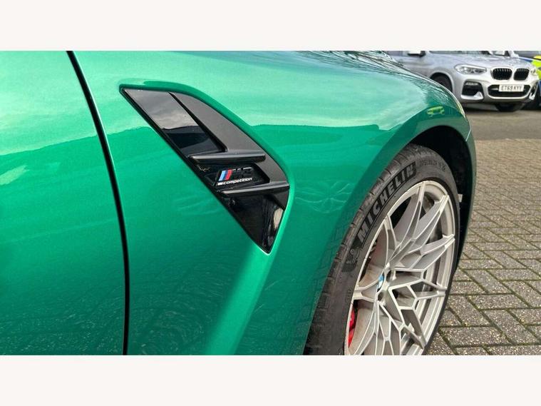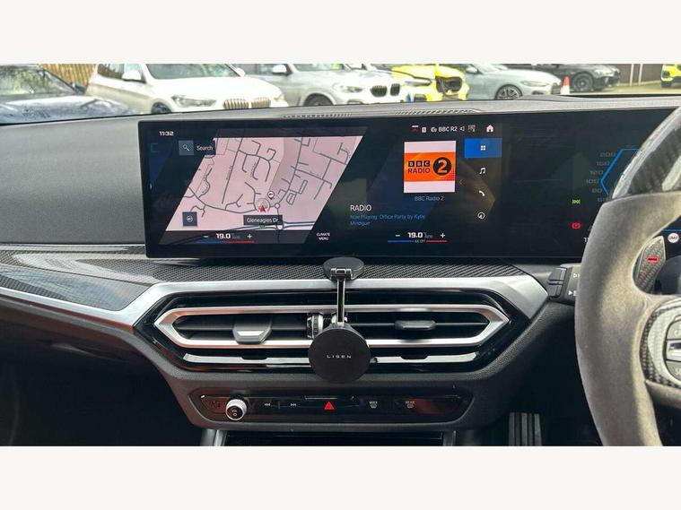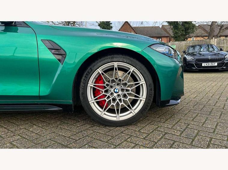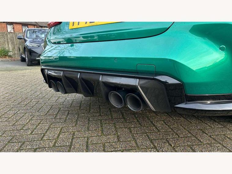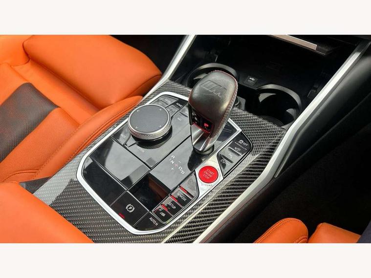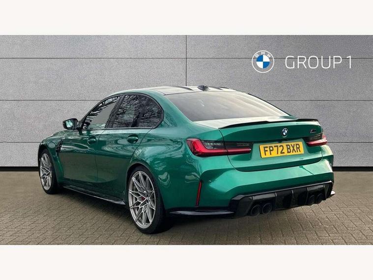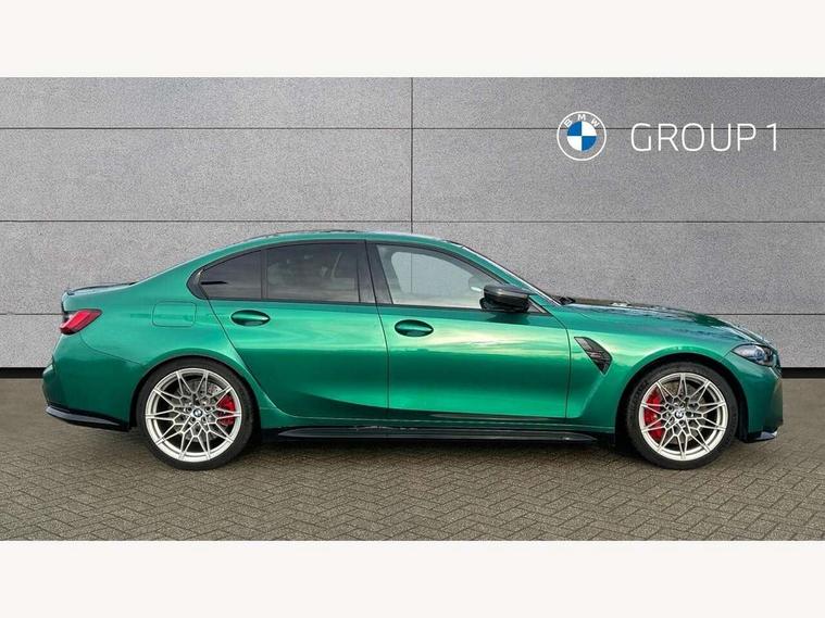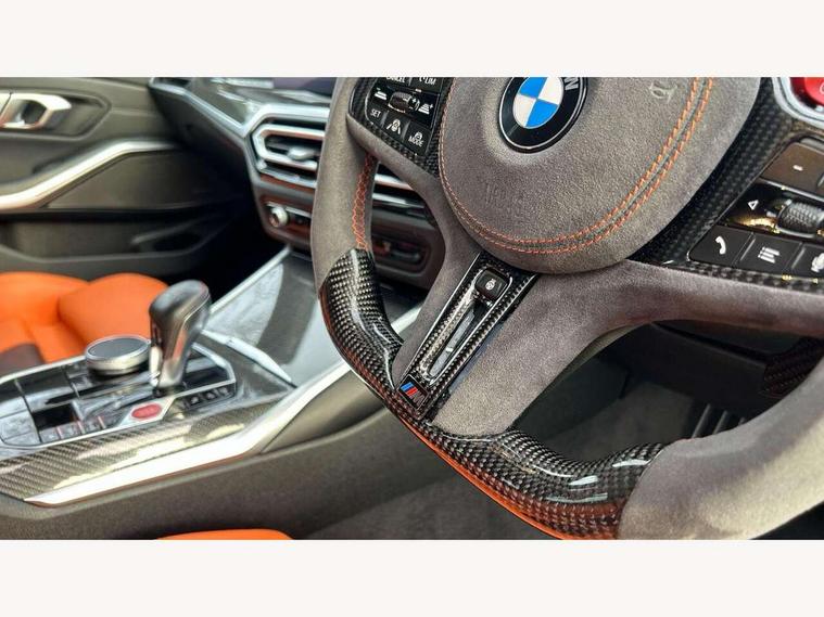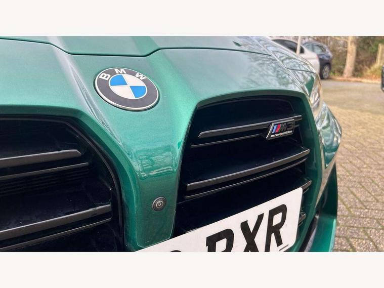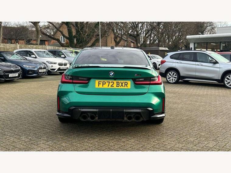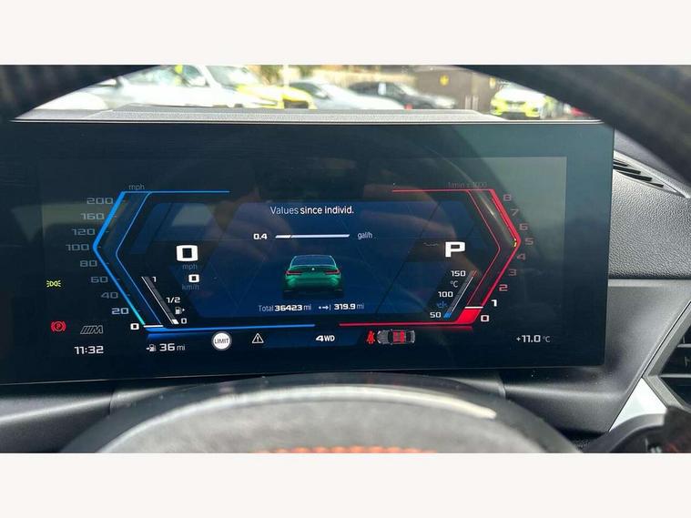 Active guard plus, Automatic start/stop system, Bluetooth functionality with Apple CarPlay/Android Auto, BMW iDrive controller on centre console, BMW legal emergency call, BMW Live Cockpit Professional sat nav system with 12.3" instrument display and high resolution control display, BMW Online services, BMW Teleservices, Brake pad wear indicator warning light, Condition based service, Connected drive services, Door/boot open warning light, Driving experience switch, Head up Display, Illuminated control elements, Instrument cluster with extended contents, Lights on warning, M drive buttons, Oil sensor for level and grade, warning by check control system, Oil temperature gauge, On board computer, On board diagnostics, Optimum shift indicator, Outside temperature display, Pull away assistant, Run flat indicator, Service interval indicator, Shifting point display, Speed limiter, Variable sport steering, Wi-Fi hotspot, Widescreen display, Adaptive M Sport suspension, Double joint spring strut front axle, M Drive Professional including track mode, laptimer, traction control & Drift analyser, M Sport differential, M steptronic sport transmission with drivelogic, Safety battery terminal clamp, 8 programmable favourite buttons, Auxiliary point for auxiliary devices, BMW professional radio/CD/MP3, DAB Digital radio, Harman/Kardon loudspeaker system, 3rd brake light, Acoustic glazing, Auto dimming driver's door mirror, Auto dimming rear view mirror, Automatic headlights + automatic windscreen wipers, Black chrome exhaust tailpipes, Black model designation badges, BMW emblem on engine compartment lid and tailgate, BMW high gloss shadow line with extended contents, BMW Individual shadowline lights, Body colour bumpers, Body colour door handles, Carbon fibre reinforced plastic (CFRP) roof with high gloss black roof aerial bulge and roof mouldings, Day time running light, Door mirror integrated indicators, Door sill finishers with aluminium inserts, Dynamic brake lights, Electric adjustable heated door mirrors, Electric folding door mirrors, Electric front and rear windows with one touch/convenient open/close function, Follow me home headlights, Front and rear apron plastic in body colour, Front and rear bumper system, Headlight beam throw control, Heat protection, sun protection glazing, Heated rear window with automatic switch off, Heated washer jets, High beam assistant, High gloss black frameless kidney grille with M badge, High gloss black lower bumper edges, side sills and diffuser edge binding, LED number plate light, LED tail lights with 3D L-shaped LED light design, M designation, M Sport entry door sill strips, Mirror glass aspheric on driver's side, convex on passenger side, Rear boot, Rear fog lights, Rear reflectors, Rear right M3 competition inscription, Rear side wing doors, Reversing light, Shark fin roof aerial, Strakes in front side panel, black matt/black high-gloss, with model badge, Visible VIN plate, Welcome lighting, 2 front cupholder in centre console with clamping elements and matt black inlay, 2 x 12 V Power sockets (luggage compartment and front centre console), 2 x USB Type C ports for charging and data transmission in front centre console, 2 x USB Type C ports for charging in rear centre console, 3 folding rear headrests, 3 seat bench in 2nd row, Ambient inside door handle light, Ambient lighting for instrument panel, Ambient lighting for storage compartment, Ambient lighting front and rear, Ambient lighting in door panels, Anthracite headlining, Battery in luggage compartment, Carbon fibre centre console incl. cover for cupholders and storage compartment, Carbon fibre decorative steering wheel finishers, Carbon fibre shift paddles, Carbon fibre strip in instrument panel on front passenger side, Centre console armrest with storage compartment, Compartment in front of cupholder, Driver/passenger sunvisors with illuminated vanity mirrors + covers, Dynamic ambient interior lighting, Electric front seats + driver memory, English handbook, Floor mats in velour, Folding rear centre armrest with 2 cupholders, Footwell lighting, Front and rear ambient footwell lighting, Front and rear door exit lights, Front door storage bins with bottle holder, Front interior light, Front isofix attachment + airbag deactivation, Front seat backrest width adjustment, Front seats lumbar support, Front/rear door armrests, Gearshift lever with embossed M badge, Heated front seats, Height adjustable front headrests, Interior mirror lighting, Isofix on 2nd row outer seats, Lockable/illuminated glovebox, Luggage compartment lighting, Manual 40:20:40 split folding rear seat with two tilt positions for backrest, Multifunction steering wheel, Rake/reach adjustable steering wheel, Single front passenger seat, Storage compartment in rear doors, Three zone automatic air conditioning, Through loading system, Toolkit located in luggage compartment, Wireless charging tray, Additional storage compartment pack - M3, Connected package professional - M3, High gloss shadowline exterior trim pack - M3, 3 point seatbelts on all seats, ABS/EBD, Automatic Stability Control (ASC), Brake energy regeneration, Brake fade compensation, Compound structure brake discs, Cornering brake control (CBC), Crash sensor, Driver/Front Passenger airbags, Dry braking, Dynamic brake control, Dynamic Stability Control with M Dynamic mode, Dynamic Traction Control - DTC, Electromechanical parking brake, Electronic differential lock control (EDLC), Front and rear head airbags, Front seat side impact airbags, Front seatbelt pretensioners + load limiters, Hill start assist, M Sport seat belts, Rear child proof door locks, Seatbelt warning, Side impact protection, Two tone horn, Tyre pressure sensor, Warning triangle and first aid kit, Centre lock switch, Closing system with central locking, Digital key, Electronic immobiliser, Thatcham cat 1 remote alarm, Vehicle Key with 4 buttons including the integrated key, Galvanic finish to control surroun