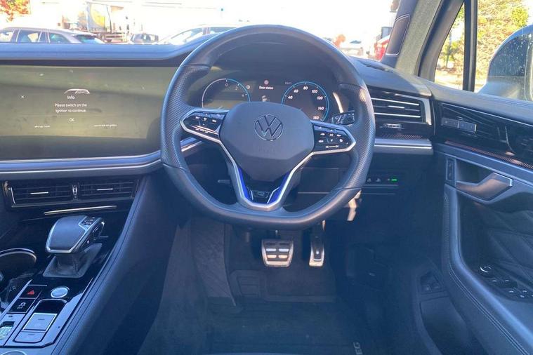 15" Screen Top infotainment system Premium (MIB3), Adaptive cruise control, Advanced driver attention and drowsiness monitor, Driver profile selection, Dynamic road sign display, E-Sim card for online connectivity, eCall emergency system, Innovision cockpit, Intelligent park assist, Mobile phone interface with inductive charging, Multi-colour Active Info display, Park Assist - Sensor controlled steering aid to assist parallel or bay parking, PAS, Warning signal and warning light for front and rear seatbelts not fastened, Wireless app connect, Adaptive chassis control, Air suspension, Charging cable - Mode 2 / 10-amp / 2.3 kW, Charging cable - Mode 3 / 32-amp / 7.2 kW, Standard electronic engine sound actuator, DAB Digital radio, Diversity antenna for AM/ FM reception, We Connect and We Connect Plus functionality, Automatic coming/leaving home lighting function, Automatic headlights, Black door mirrors, Black style comfort bumpers, Dynamic headlight range control with dynamic cornering light, Electric front tilt/slide panoramic sunroof and fixed rear sunroof, Electrically power adjustable, heated, folding, auto dimming, front passenger exterior door mirror lowering function, External USB type C socket and charging sockets, Gloss black roof rails, HD LED Matrix beam plus digital headlight projection with variable light distribution, Headlight washers, Heat insulating darkened glass in side and rear windows, Heated windscreen washer jets, Highway light, LED 3rd brake light, LED daytime running lights, LED rear combination lamp with variable lighting functions and special styling, Poor weather light, Rear exhaust tailpipe, Rear fog light with back up light on both sides, Rear light bar and illuminated logo, Rear side wing doors, Rear wiper, Stainless steel door sill protection, 12V socket in centre console, 3 rear headrests, 3 seat bench in 2nd row, 30 colours options interior ambient lighting, 4 zone climate control, Additional Interior Lighting, Airbag label on sun visor and B-pillar, Brushed stainless steel pedals, Door and side trim panel with Leather quilting, Double sun visors with illuminated vanity mirrors, Front + rear carpet mats, Front centre armrest, Illuminated scuff plates in door apertures, Leather wrapped multifunction sports steering wheel, heated, with touch control and shift paddles, Mechanical rear seat release, Power adjustable lumbar support in front, Power seats in front, right side with memory features and seat cushion depth adjustment, Puglia leather upholstery with "R" ergoComfort, Rear seat backrest and split folding with center armrest, Single front passenger seat, Extra acoustics pack - Touareg, Memory pack plus - Touareg, 3 point seatbelts, outer rear with ECE lable, ABS, Child locks on rear doors, Curtain airbags, Disc brakes in front blue with R-Logo, Disc brakes in rear blue, Driver and front passenger safety-optimised head restraints, Driver/Front Passenger airbags, Extended pedestrian protection measures, Front assist, Front seat side impact airbags, Generative braking with start and stop system, Height adjustable 3 point front seatbelts with pre tensioners, Passenger airbag deactivate switch, Three 3 point rear seatbelts, Two tone horn, Tyre pressure loss indicator, Warning triangle and first aid kit, Alarm system with interior protection, Easy open and close sensor controlled luggage compartment opening and closing with remote unlocking, Keyless Access Keyless locking and starting system with SAFELOCK, Aluminium decorative inserts, Black decorative trims, Gloss black decorative inserts in centre console, 285/35 R22 106Y XL Low rolling resistance tyres, Tool kit, Tyre mobility kit including compressor and sealing foam,