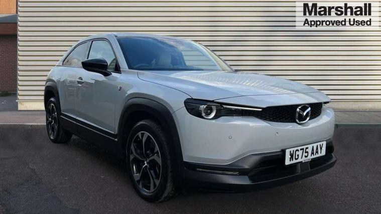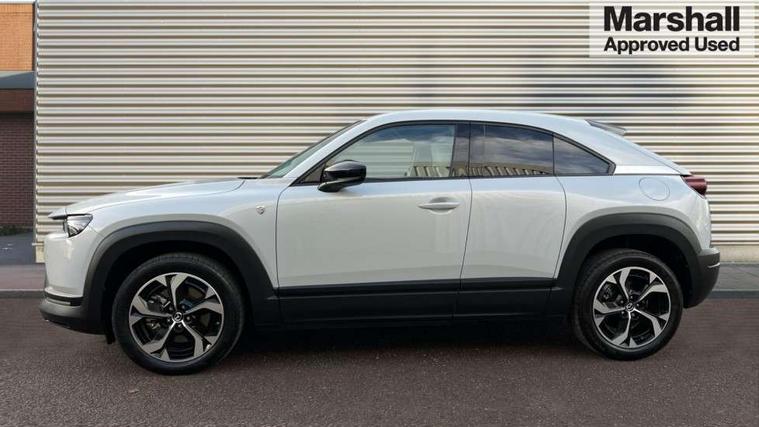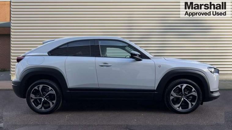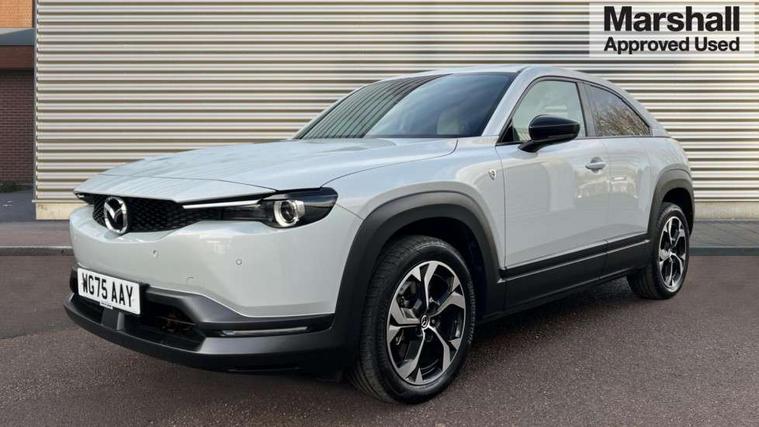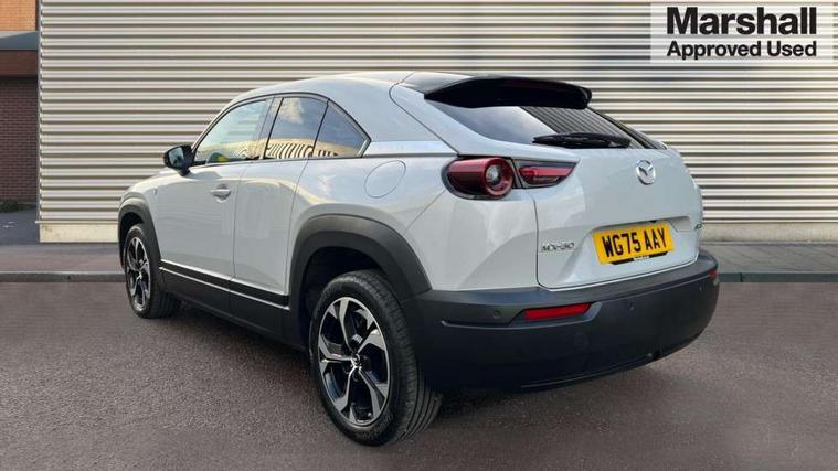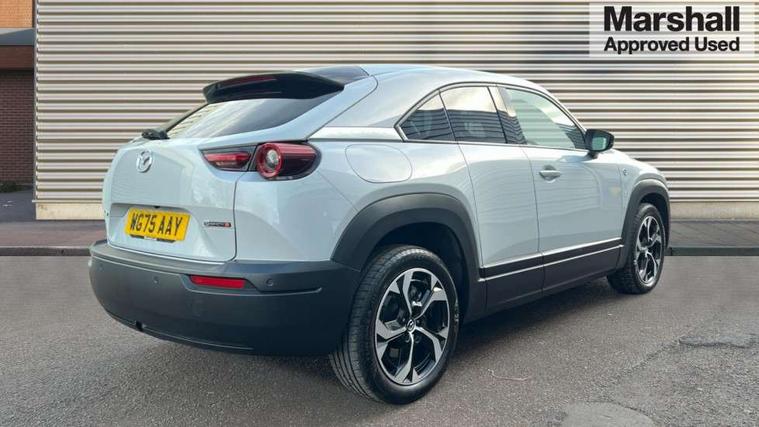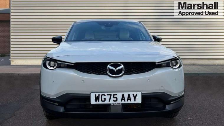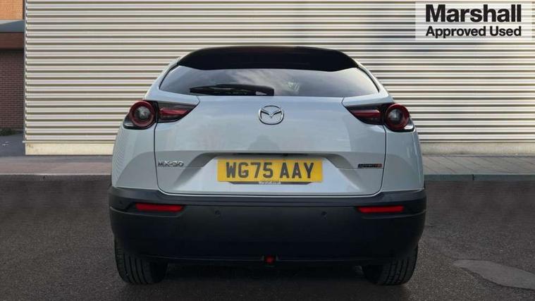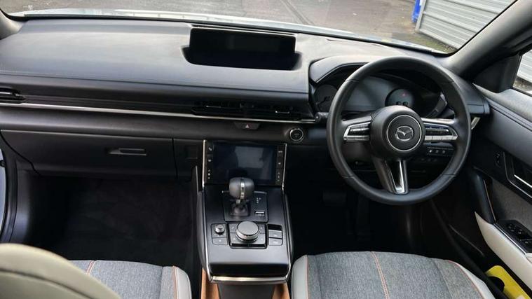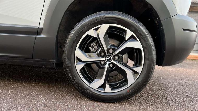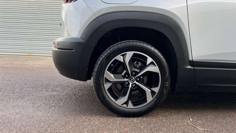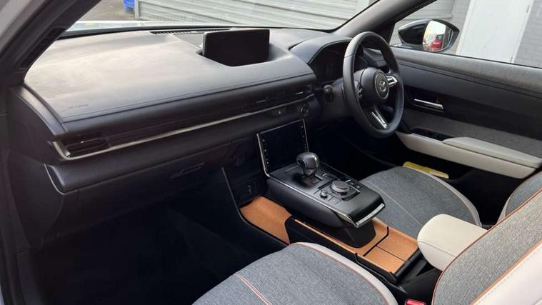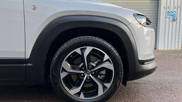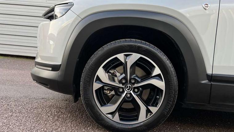 10.25" TFT colour centre display with Mazda Connect infotainment, 7" TFT Colour driver instrument panel display, Adaptive cruise control (Mazda radar cruise control) features stop and go, Apple car play/Android Auto, Blind spot monitoring with rear cross traffic alert, Drive mode switch, Driver attention alert system, E-call with GPS, Emergency lane keeping with blind spot assist and road keep assist, Emergency stop signalling system, Front and rear parking sensors, Integrated bluetooth, Integrated Mazda navigation system, Intelligent speed assist, Lane keep assist system (LAS) with Lane departure warning system (LDWS), PAS, Power start/stop button, Reversing camera, Service indicator, Trip computer, Windscreen projected colour active driving display (head up display) with traffic sign recognition, 11 kW triphase onboard charger, DC socket for rapid charging up to 40KW, Internal Combustion Engine Sound Emulator, Type 2 for mode 2 AC charging via 3-point plug, Type 2 for mode 3 AC charging via home or public charge points, 8 Speakers, DAB Digital radio, FM, Multimedia Commander including separate volume dial, Steering wheel mounted audio/bluetooth controls, Satin black - Lower bumper and wheel arch and side mouldings, Auto dimming driver's door mirror, Auto headlight levelling, B-pillar and C-pillar garnishes in gloss black finish, Black front grille, Body coloured bumpers, Coming/leaving home lights, Door mirrors with adjustable memory and tilt down function when in reverse, Dusk sensing headlights, Electric front windows with one touch auto up/down, Electrically adjustable door mirrors, Frameless auto dimming interior rear view mirror, Front, rain-sensing wipers with adjustable sensitivity and speed, Gloss black rear roof spoiler, Heated and auto power-folding door mirrors in black with integrated indicator lights, High beam control, Kodo turn signal, LED 3rd brake light, LED daytime running lights, LED Headlights, LED rear combination lights, Privacy glass (rear side windows and rear screen), Rear side wing doors, Rear wiper, Unique R-EV exterior badging, 12v electrical power outlet, 2x USB C and 12V Outlet, 3 seat bench in 2nd row, 60/40 split fold down rear seats, 8-way power adjustable driver seat with memory linked to door mirror and Active Driving Display, Black roof lining, Bright finish power button surround, Bright interior trim accents with steering wheel centre bezel, surround of engine start / stop button and glove box handle, Climate control air conditioning operated by the central 7" touchscreen control panel, Cloth/artificial leather upholstery, Door panel trim - cloth with artificial leather armrest and cork inserts around inner door handle, Driver and front passenger two rear grab handles with rear coat hooks, Driver, front passenger and two rear door pockets, Drivers and front passengers sun visors with vanity mirrors and driver's ticket holder, Front and rear LED lighting, Front centre armrest with storage and two cupholders, Front passenger seat manual slide, recline and height adjust, Heated front seats with 3 stage setting, Illuminated glovebox, ISOFIX child seat anchorage points attached on outer rear seats, Leather wrapped steering wheel and shift lever, Luggage compartment LED lighting, Mazda heritage cork accents on the console tray and cupholder lids, Power driver lumbar support, Rear centre armrest with two cup holders, Remote pre-heating/cooling, Roof mounted sunglasses holder, Seatback pocket at rear of the front passenger seat, Single front passenger seat, Steering wheel telescopic and tilt adjustment, Tonneau cover, Two front and three rear height-adjustable head restraints, 3 point ELR front seat belts x2 with pretensioners, 3x3 point rear seat belts, Anti-lock braking system (ABS), Collision avoidance braking, Driver central airbag, Drivers knee airbag, DSC - Dynamic Stability Control, Electric G-Vectoring control plus, Electronic parking brake with auto disengage function and auto hold function, Front and rear curtain airbags, Front dual stage driver and single stage front passenger airbags, Front passenger airbag cut-off switch, Front side airbags, Hill hold assist, Pre-crash safety system - Smart brake support (SBS) with turn-across traffic, Rear door child safety locks, Regenerative braking system (5 modes. Selected via paddle shift switches), Seatbelt reminder audible warning for driver, passenger and rear seats, Traction control system (TCS), Tyre pressure monitoring system (TPMS), Keyless Go, Remote central locking with deadlocking and automatic door lock when driving, Smart keyless entry, Thatcham accredited alarm and immobiliser, 18" Black diamond cut alloy wheels, Emergency tyre repair kit,