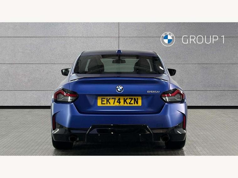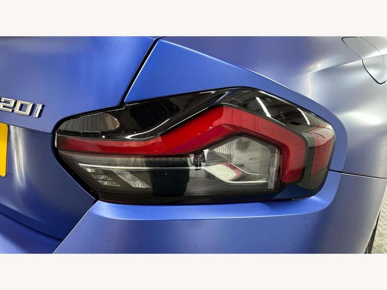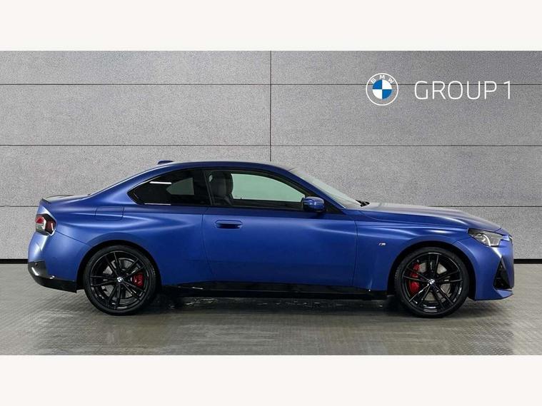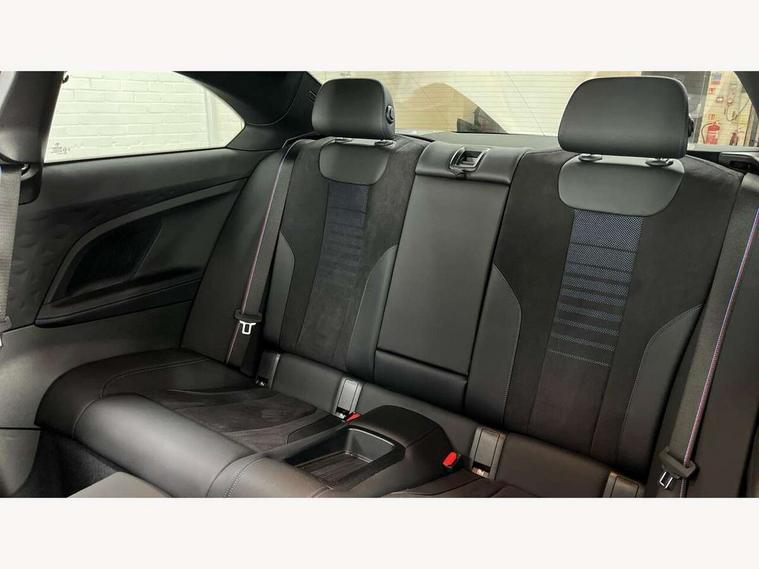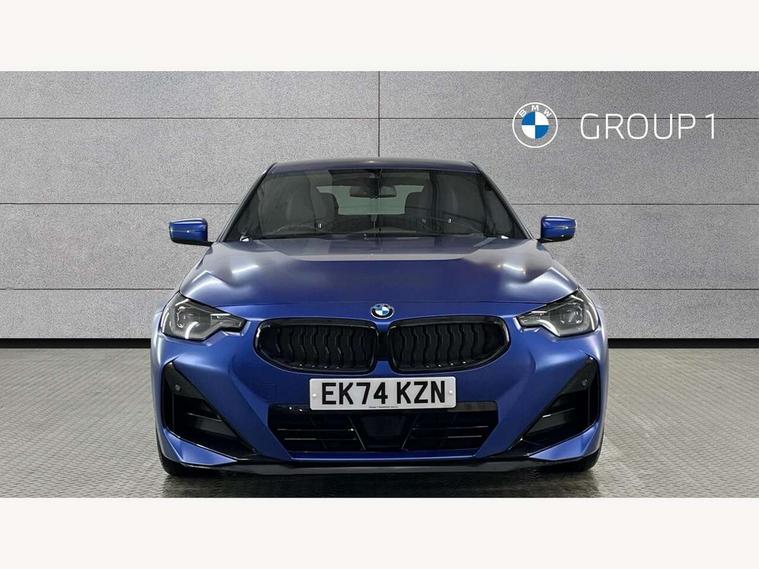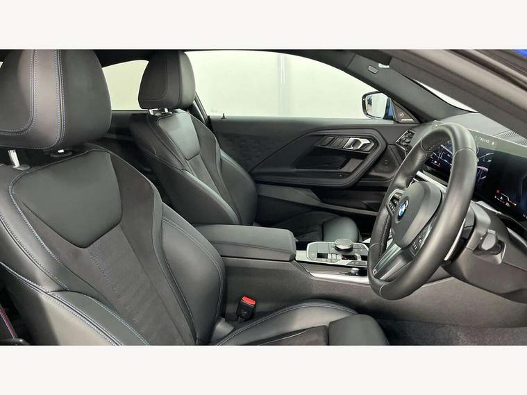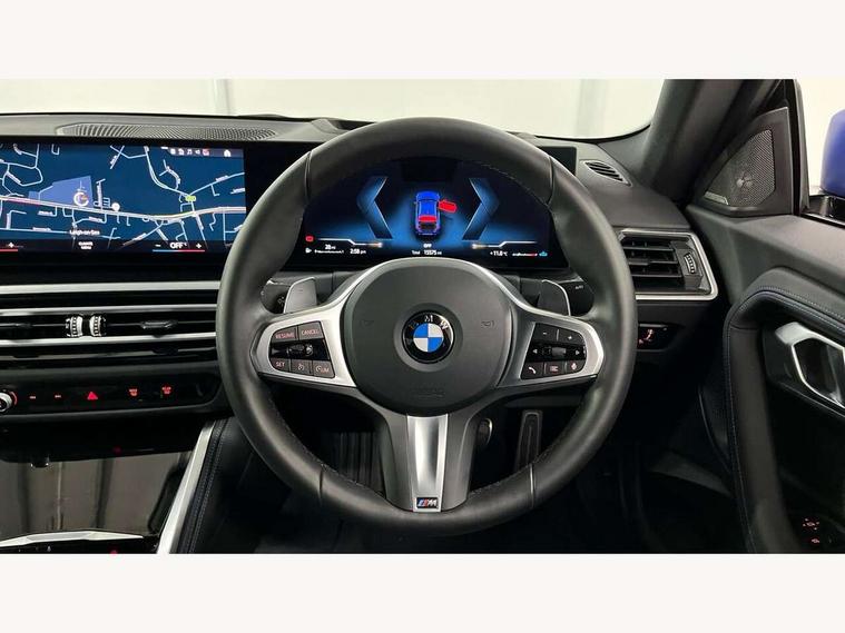 2 USB connections for charging and transferring data, Active guard plus, Attentiveness assist, Bluetooth with USB, BMW ConnectedDrive online services, BMW Intelligent Personal Assistant, BMW Live cockpit plus, BMW operating system 8 with variable, configurable widgets display information in real time, BMW Teleservices, Check Control warning system for monitoring of lights and door/luggage compartment open warning, Direct selection buttons, Drive off assistant, Eco pro mode, Electric power steering, eSim with 5G connectivity, Front and rear parking sensors, iDrive controller with turn and press function, Integrated owners handbook, Intelligent functions, Oil sensor for level and grade, Optimum shift indicator, Personal Profile, Touch operation on control display, Variable sport steering, Widescreen multi-media display, WiFi interface for wireless connection of mobile terminal devices, Aluminium lightweight construction, Balancer shaft, BMW TwinPower Turbo four-cylinder petrol engine, Double VANOS, Drive performance control with ECO PRO comfort + sport mode, Electronic differential lock, High precision injection, M sport suspension, Petrol Particulate Filter, Sport automatic steptronic transmission with gearshift paddles, manual gearshift time display, launch control, coasting idle ECO PRO/COMFORT modes, Twin scroll turbocharger with Valvetronic, DAB tuner, Acoustic windscreen wipers for reduced driving noise, Automatic windscreen wipers and automatic headlight, Body colour door handles flush with door surface, Body colour door mirrors, Body colour front and rear bumpers, Daytime running lights, Electric windows - front and rear, with open/close fingertip control and trap release, Exhaust tailpipes x2 - 90mm in left and right, Fading support, Front and rear bumper system with replaceable deformation elements, Front door sill finishers in black plastic with BMW designation, Front windscreen wipers with integrated washer jets, Green tinted heat protection glazing, High beam assistant, High gloss black sill, bumper trim sides and diffuser insert, High level third brake light, Indicators integrated int mirror housing, Interior rear-view mirror with automatic anti-dazzle function, LED registration plate light, LED technology rear tail lights, brake lights and turn indicators, Lightweight engineering, M high gloss shadowline, Model designation on right side of tailgate, One piece kidney grille with hight gloss chrome surround, Rear boot, Rear fog lights, Reversing light in rear light cluster, Shark fin antenna, Single part LED rear lights with smoked glass components, Trailer stabilisation logic, Visible VIN plate, 12V power socket in front centre console with blanking plug, 2 cupholders in front centre console, 2 zone automatic air conditioning, Ambient lighting, Compartment in front of cupholder, Conditioned based service, English handbook, Folding rear seat head rests, Front and rear side armrests integrated into door trim, Front armrest, Front door pockets, Front head restraints, Heated front seats, Illuminated glove compartment with separate small compartment, M headliner Anthracite, M sport leather steering wheel, Manually adjustment steering wheel column, Rear seat backrest with manual 40:20:40 split folding, Rear seat centre foldable armrest with integrated cup holder, Single front passenger seat, Storage compartment between rear seats, Storage tray and compartment with cover in centre console, Sun visors with vanity mirrors and insert tab, Through loading system with 40/20/40 split folding 2 rear seat in 2nd row, Velour floor mats, Additional storage compartment pack without USB - 2 Series Coupe, Connected pack professional - 2 Series Coupe, M Sport exterior styling aerodynamics pack - 2 Series Coupe, 2 tone horn, Anti lock braking system (ABS) with cornering brake control, Automatic Stability Control (ASC), BMW emergency call, Brake drying, Child seat ISOFIX attachment for the two outer rear seats, Crash sensor activating of airbags, Unlocking doors, hazard warning lights, interior light, safety battery terminal, Deactivation of fuel pump in the event of a crash, Driver and front passenger airbags, Driver and front passenger side airbags, integrated in the door side seat backrest bolsters for all seat variants, Dynamic brake control, Dynamic stability control + (DSC+), Dynamic Traction Control - DTC, Electrically operated hand brake including automatic hold function and automatic release when driving off, Front and rear disc brakes, Front centre airbag between driver and front passenger seats, Front passenger airbag deactivation, Head airbags for all 4 outer seats, PC iBrake (Post crash approach control warning with light braking function), Seat belt security check for driver and front passenger, Seatbelt warning, Side impact protection, Three point seat belts on 4 seats including front belt stopper, pyrotechnic belt tensioners and belt force limiters, Tyre pressure monitoring system, Warning triangle and first aid kit, Alarm system (Thatcham 1) with remote control and electronic engine immobiliser, Central locking switch for all doors, fuel filler cap and luggage compartment, Deadlocking function system to all doors, Drive away locking system on all doors and luggage compartment, Locking wheel bolts, Start/Stop button (illuminated) in centre console with keyless engine start and Auto Start-Stop deactivation button, Two remote control key with integrated key - one button for open and close doors/fuel flap/tailgate and separate button for unlock luggage compartment, Electrically powered 12V compressor, Reduced rolling resistance tyres, Tyre repair kit,