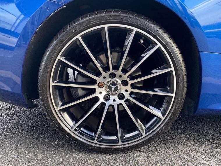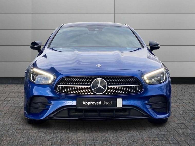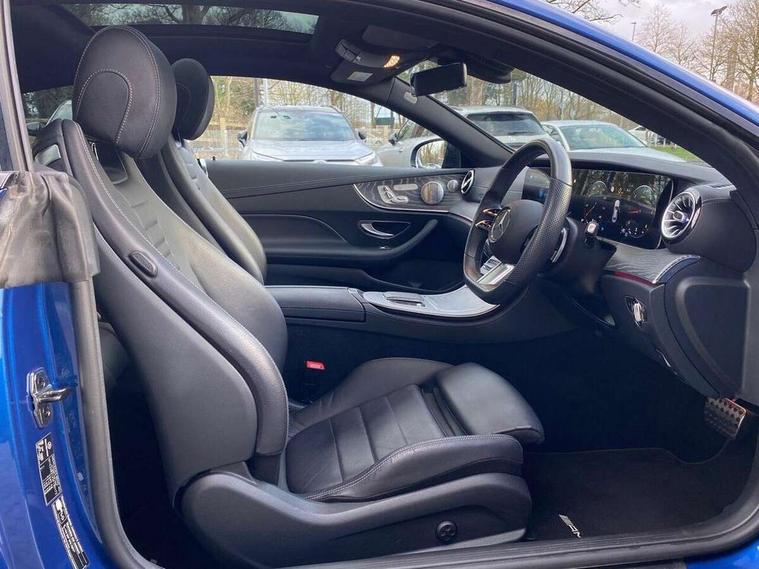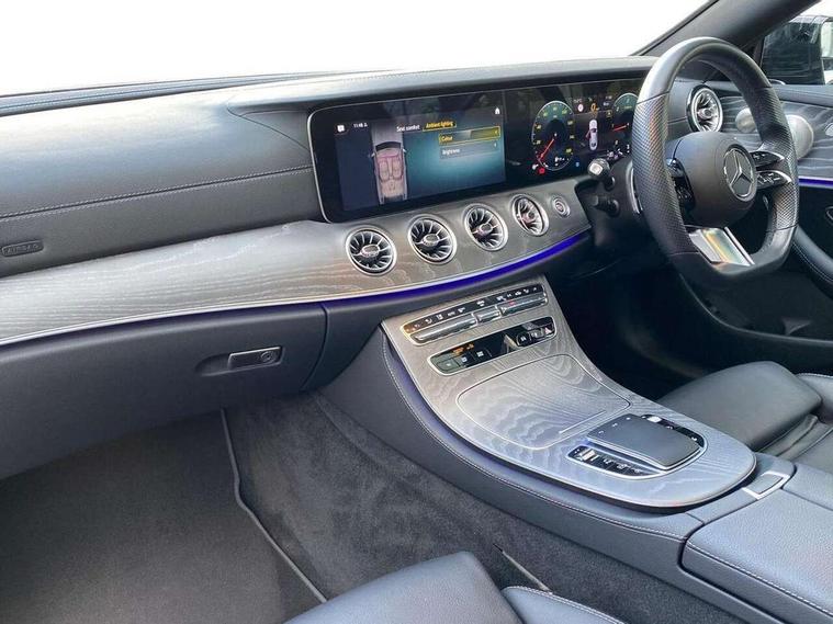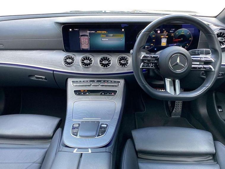 360 degree parking camera, Active parking assist including front and rear parking sensors, Analogue clock, Attention assist, Brake wear warning display, Cockpit display 12.3" widescreen digital instrument cluster, Collision prevention assist plus, Direct steer speed sensitive steering, DYNAMIC SELECT with a choice of driving modes (ECO, Comfort, Sport, Sport+ and Individual), E-call, ECO start/stop function, Hey Mercedes Voice activation, High resolution 12.3" multimedia colour display, Mercedes connect me, Outside temperature display, Pre-installation for Vehicle Monitoring, Pre-installation for Vehicle Setup, Remote boot release, Service indicator (ASSYST), Status display for rear seat belts in instrument cluster, Touchpad without controller, Traffic sign assist, Trip computer in multifunction display showing current fuel consumption, 25 litre AdBlue tank, 66 litre fuel tank, 9G TRONIC 9 speed automatic transmission, Agility control sports suspension with selective damping system, Diesel particulate filter, Incorrect fuelling protection, 2 USB ports in centre console, 2 USB ports in the rear, Burmester surround sound system with 13 speakers and a 9 channel amplifier with total output of 590 watts, MBUX multimedia system with DAB digital radio and touchpad including satellite navigation, Smartphone integration via Android Auto/Apple CarPlay, Media Interface, USB and Bluetooth interface and touchpad with control wheel, Adaptive brake lights, AMG bodystyling front and rear aprons in polished aluminium, AMG boot lid spoiler in body colour, Body colour door handles, Body coloured bumpers, Daytime running lights, Diamond radiator grille with integral star and single louvre in high gloss black, Electric windows with one touch opening/closing and obstruction sensors, Exterior mirrors heated and electronically adjustable, High gloss black exterior mirror housing, High gloss black front apron, High gloss black rear bumper with chrome trim, Illuminated front door sill panels with Mercedes-Benz lettering, LED high performance headlamps, Magic Vision Control heated windscreen wiper system, Panoramic electric glass sunroof, Pre-installation for roof rail systems, Privacy glass Includes rear side windows and rear windscreen, Radio aerial integrated into rear window, Rain sensing windscreen wipers, Rear boot, Rear LED lights, Third brake light, Top surround of side windows in polished aluminium, Visible twin pipe exhaust system integrated into bumper, Waistline strips in high gloss black, 2 seat bench in 2nd row, 3-spoke flat bottom multifunction AMG steering wheel with Touch Control buttons, trimmed in black nappa leather, 40:20:40 split folding rear seats, Artico man-made leather upper dashboard and beltlines with contrast stitching, Automatic child seat recognition sensor, Belt feeder driver and front passenger seat belt automatically positioned within easier reach, Black door pins, Black roof lining, Central stowage compartment with 12 V socket in centre console, Central stowage compartment with USB socket for use with Android Auto and Apple CarPlay, Centre armrest and door handle illumination, Centre console in grey open-pore ash wood, Floor mats with AMG lettering, Front and rear door pockets, Front centre armrest with stowage compartment, Front footwell lights, Glasses compartment in overhead control panel, Glove compartment - lockable, air conditioned and illuminated, Head restraints for driver and front passenger (four-way adjustability) and in rear (two-way), Heated front seats, Interior lighting - 64 colour Ambient lighting, Interior rear light/integral reading lights, Isofix rear child seat fastenings, Leather upholstery, Multi contour front sports seats, Seat occupancy sensor for front passenger seat, Single front passenger seat, Sports pedals in brushed stainless steel with black rubber studs, Steering column manually adjustable for height and reach, Steering wheel gearshift paddles, Sunvisors with illuminated vanity mirrors, THERMOTRONIC automatic climate control system with 3 climate zones, Memory pack - E Class, Mirror pack - E Class, Night package - E Class, Seat comfort pack - E Class, Stowage pack - E Class, 2 x 3-point rear seatbelts, Active bonnet pedestrian safety measure which detects an impact and raises bonnet, Adaptive brake system with HOLD function and brake drying in the wet, Adaptive driver and front passenger airbags, Airbags - sidebag for driver and front passenger with combined thorax/pelvis bag, Anti-lock braking system (ABS), Drivers knee airbag, Electric parking brake, Electronic Stability Programme, Front and rear window airbags, Head airbags, Hill hold function, Perforated front brake discs with "Mercedes-Benz" lettering, Seatbelt warning, Tyre pressure monitoring system, Warning triangle and first aid kit, Alarm system/interior protection/immobiliser, Central locking with interior switch, automatic locking and crash sensor with emergency opening function, Chrome surround in electric key, Keyless Go entry and starting function, Open-pore grey ash wood trim, 20" AMG multi spoke design alloy wheels painted in high gloss black with high sheen finish, Run flat tyres,