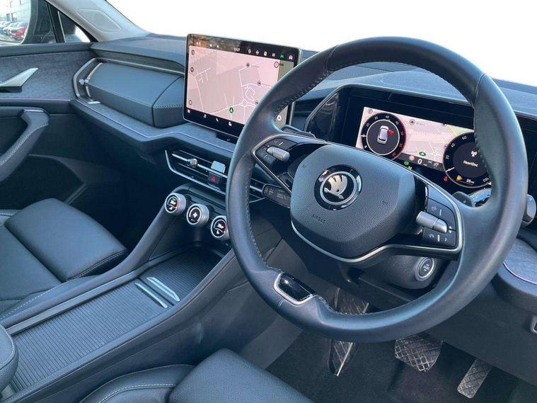 13" satellite navigation touchscreen display, Blind spot detection with door exit warning, Bluetooth system, Drive mode selector, Driver alert with fatigue sensor, Driver drowsiness alert system, Dry display cleaner, e call+, Front cross traffic assist, Lane assist, PAS, Rear traffic assist, Tailgate unlocking from outside, Traffic sign recognition, USB C Port x 2 in front centre console, Virtual Cockpit - 10.25" digital display, Voice control system, Wireless charging for two smartphones (15W) with cooling function, Wireless SmartLink for Apple CarPlay and Android Auto, Stop/start function, 2x USB-C in the rear, DAB Digital radio, Aero front windscreen wipers with intermittent function, Auto dimming rear view mirror, Black wheel arch surrounds, Body colour bumpers, Body colour door mirrors and handles, Cornering light and poor weather light, Electric folding /adjustable/separted heated/folding door mirrors, auto dimming with boarding sports and memory function, Electric front and rear windows, Heat insulating glass in windshield, Heated rear window, Ice scraper in fuel tank cap, Invisible tailpipe, LED daytime running lights, LED rear fog light, LED third brake light in rear spoiler, Light assistant with automatic headlight control and coming home feature, Logo projection in door mirrors, Privacy glass, Rear side wing doors, Rear spoiler, Rear window wiper, Safety reflectors on front and rear doors, Window control switches with black trim, Windscreen wipers with rain sensor, Without engine designation, 1.5l bottle holder points in all door, 12V socket in boot, 1x centre rear reading light, 2 seat bench in 3rd row, 3 configurable smart dials with 32mm coloured display, 3 seat bench in 2nd row, 4 foldable roof handles with rear coat hooks, Automatic gear selector on steering wheel, Chrome interior door handles, Driver/front passenger reading lights, Fabric headlining, Fixed bench 40:60:40 split folding backrests, Front and rear floor mats, Front centre armrest with jumbo box storage compartment, cup holder and 12V socket, Front courtesy lights, Height adjustable front headrests, Interior ambient lighting, Isofix child seat fittings in outer rear seats and front passenger with top tether, Manually adjustable steering column, Pollen filter, Rear centre armrest with cupholders, Rear seat boot backrest release, Retractable luggage compartment cover, Single front passenger seat, Sliding trunk cover, Small Bags on the inner sides of the front backrests, Storage pocket including mobile phone pockets on the backs of the front seats, Sunvisors with illuminated vanity mirrors, Three rear height adjustable headrests, Ticket holder on A Pillar, Tri zone climate control, Umbrella in door panel x1 made from sustainable materials, Upper and lower glovebox with card holder and coin compartment, USB C port by rear view mirror for charging only (15W), Exterior styling package - Kodiaq, Auto door release and activation of warning lights in the event of an accident, Driver and front passenger airbag with knee airbag and front passenger airbag deactivation, Electric child locks, Electronic parking brake, ESC (incl. ABS+EMD+MSR+ASR+EDL+HBA+DSR+RBS+ESBS+MCB+TSA+XDS), Front assist with braking reaction to vehicles, pedestrians and cyclists, Front disc brakes, Fuel cut off safety device, Height adjustable front 3 point seatbelts + pretensioners, Hill hold control, Junction assist with automatic emergency braking, Rear disc brakes, Safety vest holder in door, Seat belt reminder for all seats, Three point rear seat belts, Two tone horn, Tyre pressure monitor, Anti-theft wheel bolts, Immobiliser, Remote central locking with 2 keys, Black/grey fabric with green cross stitching on dashboard, Swan feathers grey dashboard and door decorative inserts, Breakdown kit,