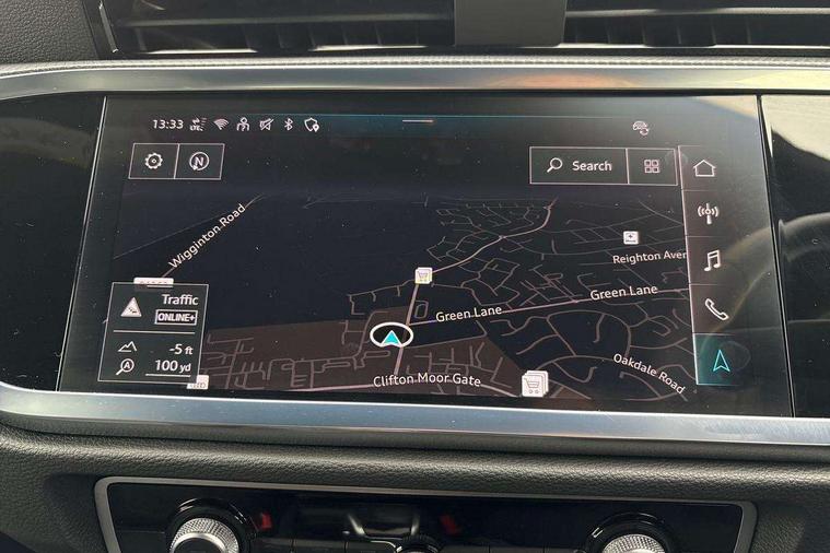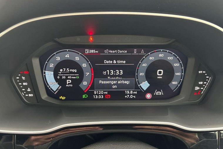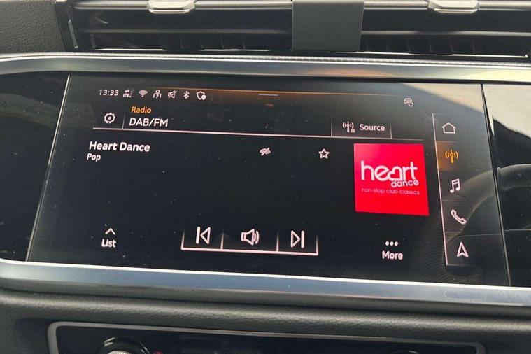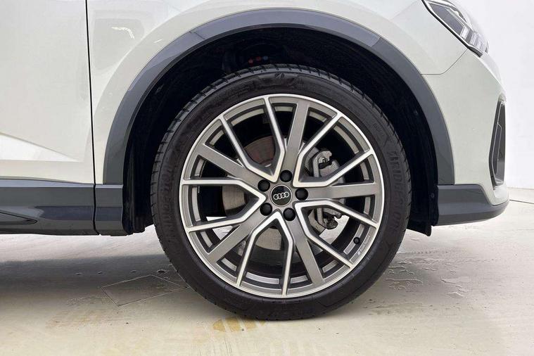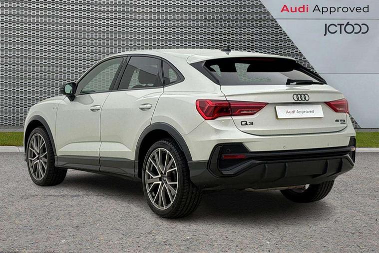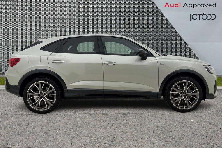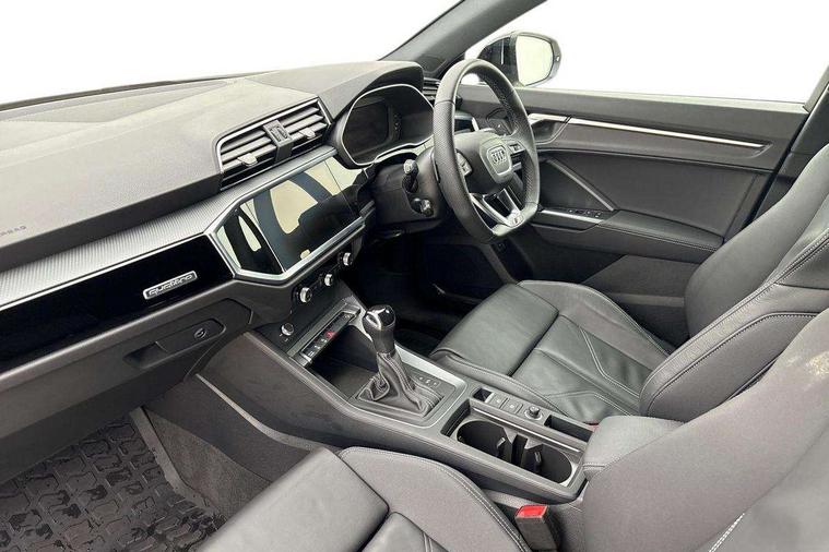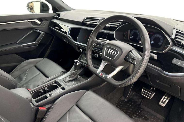 Audi connect safety and service, Audi drive select, Audi lane departure warning, Audi smartphone interface includes wireless Apple carplay/Android Auto, Audi Virtual Cockpit - 10.25" display, Bluetooth interface, Camera based traffic sign recognition, Distraction and Fatigue warning, Legal emergency call, MMI Navigation Plus with high resolution 10.1 inch touchscreen colour display, Power operated tailgate, Progressive steering, Service interval indicator, Start stop system with recuperation, Voice control system with natural language interaction, Sports suspension, 2 USB-C ports with charge and data functions, 6 passive loudspeakers, DAB digital radio module, Acoustic windscreen, Audi Beam uses LEDs to project the Audi logo onto the ground as you exit your Q3, Auto dimming door mirrors, Auto dimming frameless rear view mirror, Diffuser grille in grained matt black, Diffuser trim in selenite silver, Electrically folding, adjustable and heated door mirrors with integrated LED side indicators and kerb view function for passenger side, Front and rear electric windows, Front fog lights, Front underbody protection in manhattan grey paint finish, High gloss black finish B and C pillars, LED Dynamic rear indicators, LED headlights with LED daytime running lights, LED rear lights, LED third brake light, Privacy glass dark tinted rear and rear-side windows (from B-pillar backwards), Rain and light sensors, Rear side wing doors, Rear underbody protection in matt black, Rear wiper, S line front and rear bumpers and side skirts in contrasting Manhattan grey paint finish, Variable front intermittent wipers, 12V socket in rear centre console, 3 seat bench in 2nd row, 40:20:40 folding with manual adjustment for 60:40 forwards/backwards position and backrest angle, Adjustable rear seat bench/backrest with centre armrest and cupholder, Black cloth headlining, Dual zone electronic climate control, Electric lumbar support, Front and rear black floor mats with contrast stitching, Front and rear headrests, Front centre armrest, Height and reach adjustable steering wheel, Illuminated door sill trims with S logo, ISOFIX child seat mounting for front passenger with airbag deactivation and outer rear seat including top tether attachment point for outer rear seats, Luggage compartment sill protection in stainless steel, Manual front seats with height adjustment, Perforated leather gearknob, Single front passenger seat, Stainless steel pedals, Twin leather upholstery with front sport seats + S embossing, Black styling pack - Q3, Non smoking pack - Q3, 3x3 point rear seatbelts, 6 airbags - Driver, front passenger, curtain and side windows, Audi pre-sense front with pedestrain and cyclist recognition, Electrically operated child locks on rear doors, Electromechanical parking brake, Electronic stabilisation control including ABS, ASR and EDL, Front seatbelt reminder, Hill descent control, Hill hold assist, Pre sense basic, Seatbelt monitoring, Tyre pressure warning, Warning triangle and first aid kit, Anti theft alarm, Anti theft wheel bolts, Immobiliser, Remote central locking, Aluminium look interior elements, Detail dashboard around MMI touch colour display in glass look, black with surround in aluminium look, Leatherette door armrest, Piano black inlay,