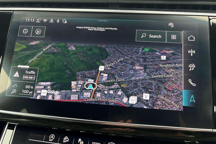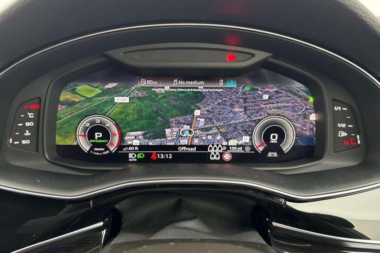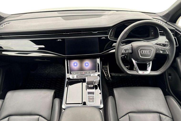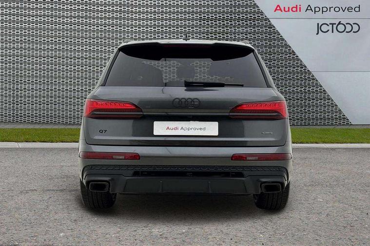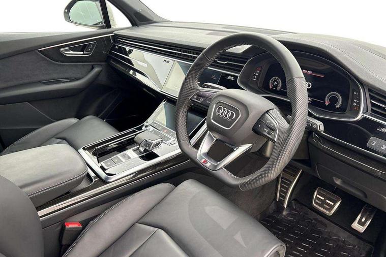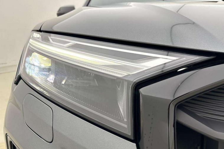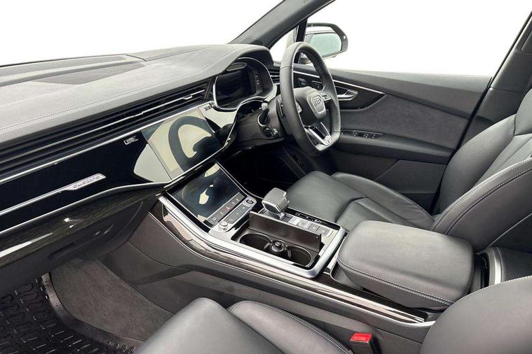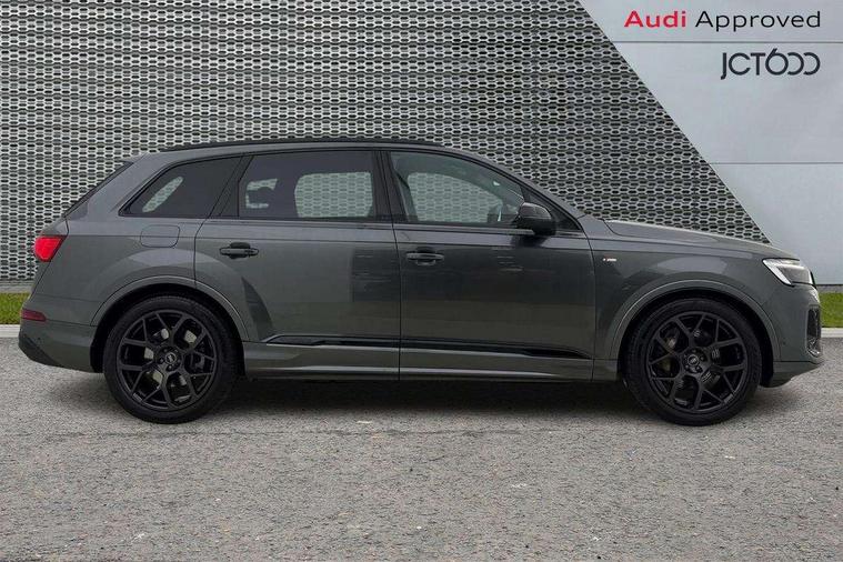 Audi connect safety and service (e-call), Audi connect with Amazon Alexa Integration, Audi drive select (Auto, Comfort, Dynamic, Efficiency, Individual, Off-road and All road), Audi phone box light with wireless charging, Audi virtual cockpit - 12.3" high-resolution LCD display with fully customisable instrument cluster, Bluetooth interface, Camera based traffic sign recognition, Electromechanical power steering, MMI navigation plus with MMI touch screens includes 10.1" and 8.6" screens with haptic feedback, Natural voice recognition, Operating buttons in Matte black, Parking system plus with 360 degree display (front, rear and side sensors) - acoustic and visual park assist system, Power operated tailgate, Rear view camera, Smartphone interface includes wireless Apple carplay/Android Auto, Start/stop system, 48V Mild hybrid technology, Adaptive air sports suspension, Quattro all wheel drive with self locking centre differential, Audi music interface - front 2 USB-C ports with charger and data functions, Audi sound system with 6 channel amplifier, 180 watt amplifying capacity and 10 loudspeakers including subwoofer, DAB digital radio module, Aluminium window trim, Audi Beam uses LEDs to project S emblem with red rhombus onto the ground when opening the side doors (front/rear), Auto dimming frameless rear view mirror, Black exhausts, Black roof rails, Electrically adj heated/folding + automatically dimming exterior mirrors with memory + automatic kerb side function for passenger side exterior mirror, Heat insulating glass in windshield, Integrated LED indications in door mirrors, LED 3rd brake light, LED daytime running lights, LED rear tail lights, Loading edge protection in stainless steel, Matrix LED headlights with dynamic front and rear indicators, Privacy glass - dark tinted rear and rear side windows from B-pillar backwards, Rear side wing doors, Rear wiper, 2 seat bench in 3rd row, 2 zone automatic climate control, 3 seat bench in 2nd row, 7 seat layout with ISOFIX points for the front passenger seat and rear passenger seat, Black carpets, Black cloth headlining, Comfort front centre armrest, Electric adjustable front seat with 4 way lumbar support, driver memory functionality, Folding rear seats, Front head restraints, Front/rear floor mats, Heated front seats, Illuminated door sill trims with S logo, ISOFIX child seat mounting for front passenger seat and 2 outer rear seats with top tether child seat mounting for all 3 rear seats, LED interior ambient lighting, Luggage compartment cover, Luggage compartment sill protection in stainless steel, Rear head restraints, Rear seat bench plus for the second row, with forwards/backwards sliding adjustment and backrest angle adjustment, Single front passenger seat, Stainless steel pedals, Sunvisors with illuminated vanity mirrors, Black styling pack plus - Q7, 3 point seatbelts on all rear seats, Audi pre sense basic, Audi pre sense front, Child locks on rear doors, Convenience key with safelock and gesture tailgate, Driver and front passenger, front side and curtain airbags, Electromechanical parking brake, Electronic Stabilisation Control (ESC) including ABS, ASR and EDL, Extended pedestrian protection measures, Hill hold assist, Seatbelt reminder, Tyre pressure loss indicator, Warning triangle and first aid kit, Anti theft alarm with tow away protection, Anti-theft wheel bolts and wheel loosening detection, Keyless Go, Remote central locking, Black dashboard, Polished oak trim with grey finish inlay, Tool kit, Tyre repair kit,