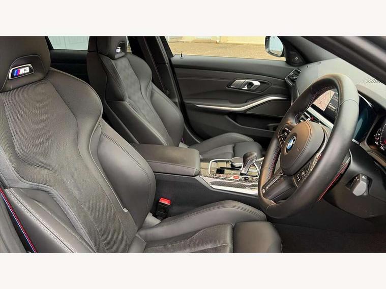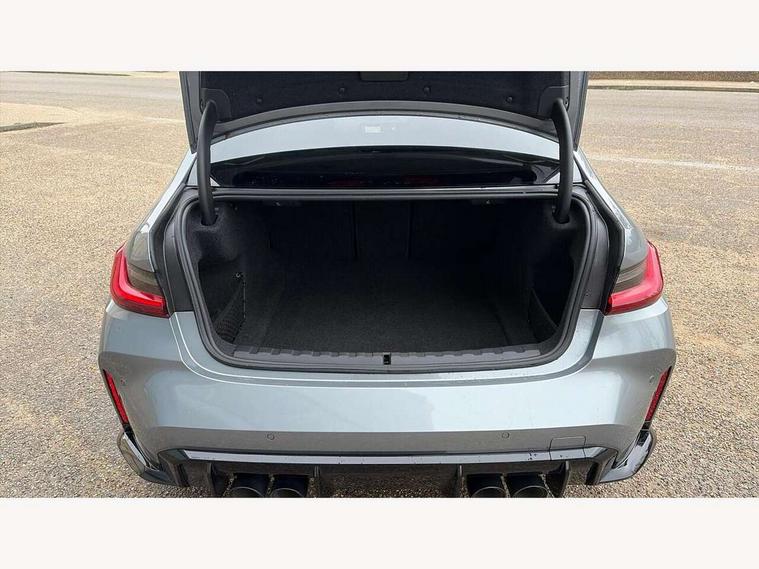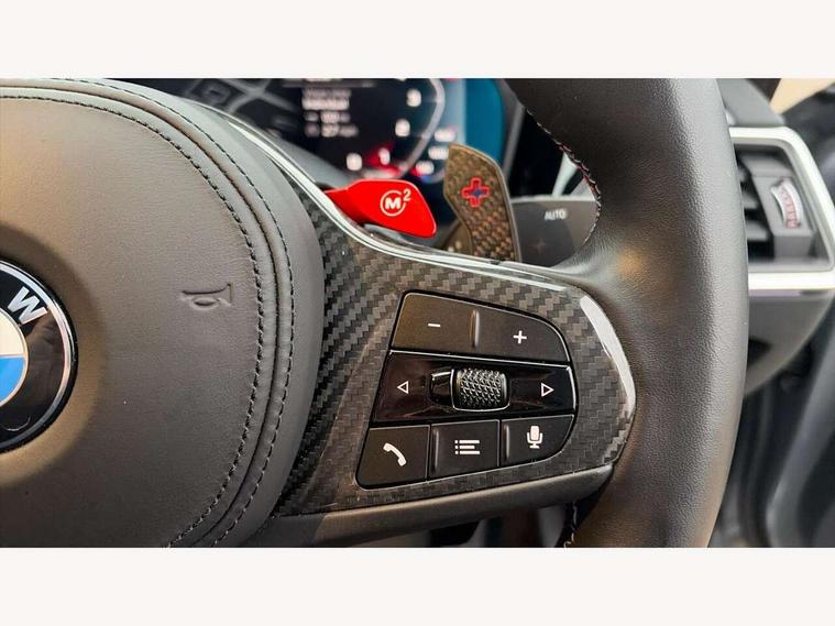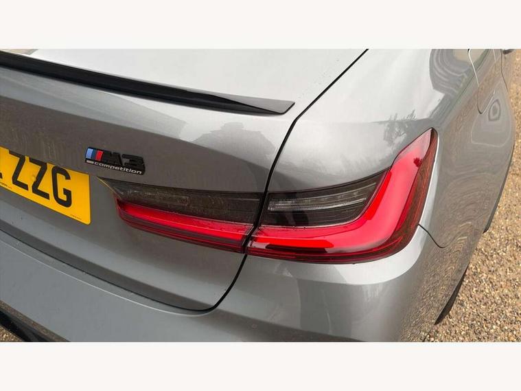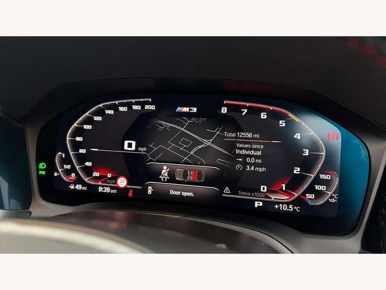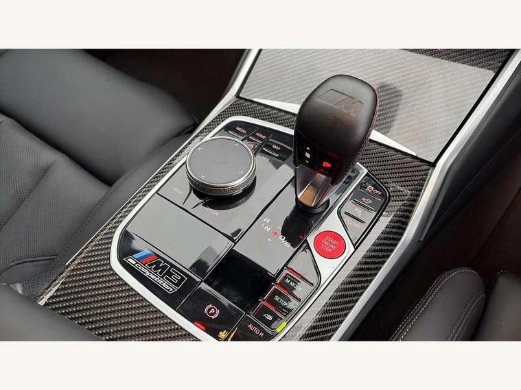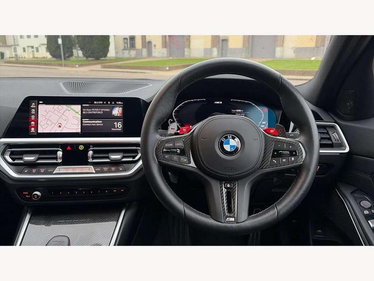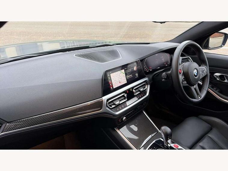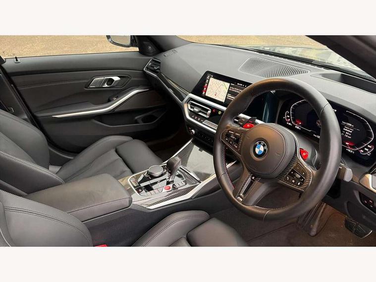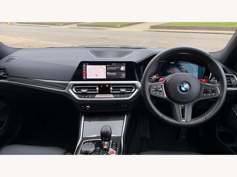 Active guard plus, Automatic start/stop system, Bluetooth functionality with Apple CarPlay/Android Auto, BMW iDrive controller on centre console, BMW legal emergency call, BMW Live Cockpit Professional sat nav system with 12.3" instrument display and high resolution control display, BMW Online services, BMW Teleservices, Brake pad wear indicator warning light, Condition based service, Connected drive services, Door/boot open warning light, Driving experience switch, Electric Power Steering (EPS) with Servotronic, Instrument cluster with extended contents, Lights on warning, M drive buttons, Oil sensor for level and grade, warning by check control system, Oil temperature gauge, On board computer, On board diagnostics, Optimum shift indicator, Outside temperature display, Pull away assistant, Run flat indicator, Service interval indicator, Speed limiter, Widescreen display, Adaptive M Sport suspension, Double joint spring strut front axle, M Drive Professional including track mode, laptimer, traction control & Drift analyser, M Sport differential, M steptronic sport transmission with drivelogic, Safety battery terminal clamp, 8 programmable favourite buttons, Auxiliary point for auxiliary devices, BMW professional radio/CD/MP3, DAB Digital radio, Harman/Kardon loudspeaker system, 3rd brake light, Acoustic glazing, Auto dimming driver's door mirror, Auto dimming rear view mirror, Automatic headlights + automatic windscreen wipers, Black chrome exhaust tailpipes, Black model designation badges, BMW emblem on engine compartment lid and tailgate, BMW high gloss shadow line with extended contents, BMW Individual shadowline lights, Body colour bumpers, Body colour door handles, Carbon fibre reinforced plastic (CFRP) roof, Day time running light, Door mirror integrated indicators, Door sill finishers with aluminium inserts, Dynamic brake lights, Electric adjustable heated door mirrors, Electric folding door mirrors, Electric front and rear windows with one touch/convenient open/close function, Follow me home headlights, Front and rear apron plastic in body colour, Front and rear bumper system, Headlight beam throw control, Heat protection, sun protection glazing, Heated rear window with automatic switch off, High beam assistant, High gloss black frameless kidney grille with M badge, LED number plate light, LED tail lights with 3D L-shaped LED light design, M designation, Mirror glass aspheric on driver's side, convex on passenger side, Rear boot, Rear fog lights, Rear reflectors, Rear right M3 competition inscription, Rear side wing doors, Reversing light, Shark fin roof aerial, Strakes in front side panel, black matt/black high-gloss, with model badge, Visible VIN plate, Welcome lighting, Windscreen wipers with integrated washing jets, 2 cupholders in front centre console, 2 x 12 V Power sockets (luggage compartment and front centre console), 2 x USB Type C ports for charging and data transmission in front centre console, 2 x USB Type C ports for charging in rear centre console, 3 folding rear headrests, 3 seat bench in 2nd row, Ambient lighting, Anthracite headlining, Battery in luggage compartment, Carbon fibre centre console incl. cover for cupholders, Carbon fibre decorative steering wheel finishers, Carbon fibre shift paddles, Carbon fibre strip in instrument panel on front passenger side, Centre console armrest with storage compartment, Compartment in front of cupholder, Driver/passenger sunvisors with illuminated vanity mirrors + covers, Electric front seats + driver memory, English handbook, Floor mats in velour, Footwell lighting, Front and rear door exit lights, Front door storage bins with bottle holder, Front interior light, Front isofix attachment + airbag deactivation, Front seat backrest width adjustment, Front seats lumbar support, Front/rear door armrests, Gearshift lever with embossed M badge, Heated front seats, Height adjustable front headrests, Interior mirror lighting, Isofix on 2nd row outer seats, Lockable/illuminated glovebox, Luggage compartment lighting, Manual 40:20:40 split folding rear seat with two tilt positions for backrest, Rake/reach adjustable steering wheel, Single front passenger seat, Storage compartment in rear doors, Storage tray and compartment with cover in centre console, Three zone automatic air conditioning, Through loading system, Toolkit located in luggage compartment, Wireless charging tray, Additional storage compartment pack - M3, Connected package professional - M3, High gloss shadowline exterior trim pack - M3, 3 point seatbelts on all seats, ABS/EBD, Automatic Stability Control (ASC), Brake energy regeneration, Brake fade compensation, Compound structure brake discs, Cornering brake control (CBC), Crash sensor, Driver/Front Passenger airbags, Dry braking, Dynamic brake control, Dynamic Stability Control with M Dynamic mode, Dynamic Traction Control - DTC, Electromechanical parking brake, Electronic differential lock control (EDLC), Front and rear head airbags, Front seat side impact airbags, Front seatbelt pretensioners + load limiters, Hill start assist, M Sport seat belts, Rear child proof door locks, Seatbelt warning, Side impact protection, Two tone horn, Tyre pressure sensor, Warning triangle and first aid kit, Digital key, Electronic immobiliser, Remote central locking, Thatcham cat 1 remote alarm, Vehicle Key with 4 buttons including the integrated key, Galvanic finish to control surrounds, High gloss black interior trim, Tyre repair kit,