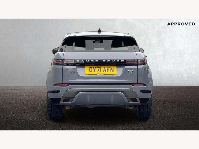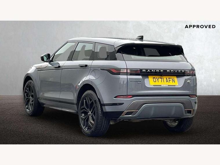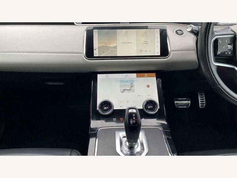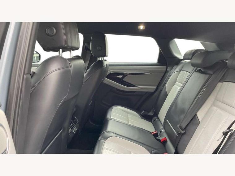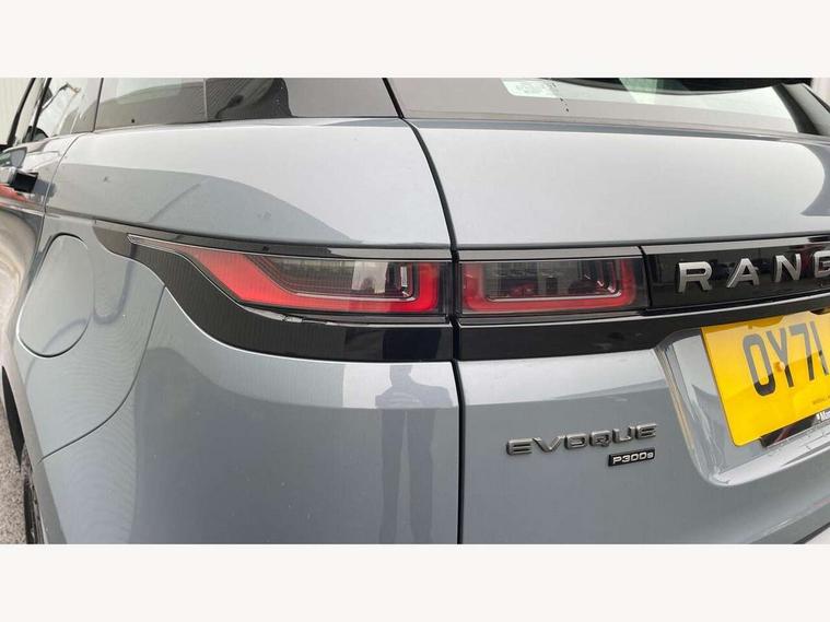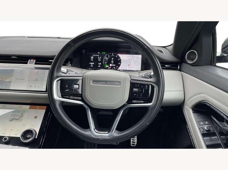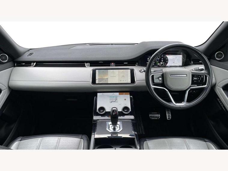 10" deployable touchscreen with lower touchscreen, Adaptive cruise control, Android Auto, Apple car play, Blind spot assist, Bluetooth connectivity, Brake pad wear indicator warning light, Clear exit monitor, Driver condition monitor, Electronic power assisted steering (EPAS), Front and rear parking aid, InControl remote, Interactive Driver display instrument cluster, Land Rover InControl apps, Lane keep assist, Pivi pro connected includes upgraded infotainment, connected navigation pro, Nuance speech licence, Push button starter, Rear collision monitor, Rear traffic monitor, Traffic sign recognition with adaptive speed limiter, Voice control system, 7 kW onboard charger, All terrain progress control, Configurable dynamics, Electric rear axle drive, Large fuel tank, Passive suspension, Public charging cable, Terrain Response 2 Auto, Digital Audio Broadcast radio-DAB, Steering wheel mounted controls, Automatic headlight levelling, Electric windows with one touch open/close and anti trap, Evoque and R-Dynamic badge, Flush deployable exterior door handles, Heated rear window with timer, Heated washer jets, Heated windscreen, Matrix LED headlights with signature DRL, intelligent high beam assist, signature Hi-Line tail lights and animated directional indicators, P300e badge, Power fold, auto-dimming, heated door mirrors with approach lights and auto dimming driver side, Rain sensing windscreen wipers, Rear fog lights, Tailgate spoiler, 40:20:40 split folding rear seats with centre headrest and armrest, Ambient interior lighting, Bright metal pedals, Heated steering wheel, Isofix system on outer rear seats, Overhead lighting console, Overhead stowage for sunglasses, Passive front head restraints, Perforated full leather steering wheel, Rear air vents, Rear centre headrest, Satin chrome gearshift paddles, Sunvisors with illuminated vanity mirrors, Twin sliding front centre armrest, 3 rear 3 point seatbelts, Anti-lock braking system (ABS), Customer configurable autolock, DSC - Dynamic Stability Control, Electronic brake force distribution, Electronic parking brake, Electronic traction control, Emergency braking, Front and rear seatbelt reminder, Hill descent control, Hill launch assist, Low traction launch, Power operated child locks, Roll stability control, Six airbags - Driver and passenger airbags/driver knee airbag/front side airbag and curtain airbags, Torque vectoring brake, Tyre pressure monitoring system, Alarm, Immobiliser, Intrusion sensor, Keyless entry, Locking wheel nuts,