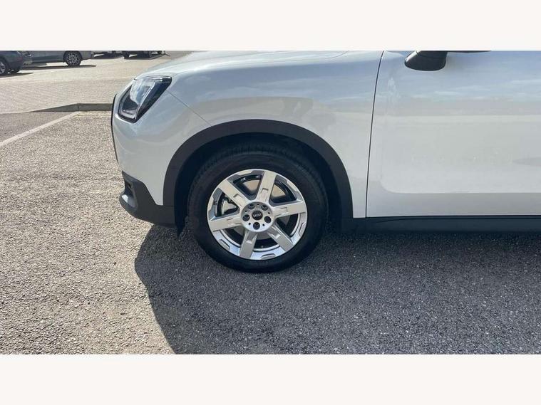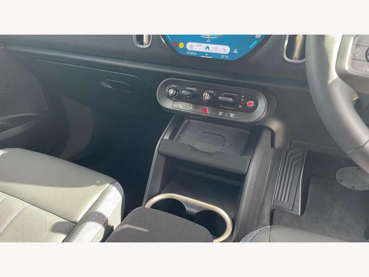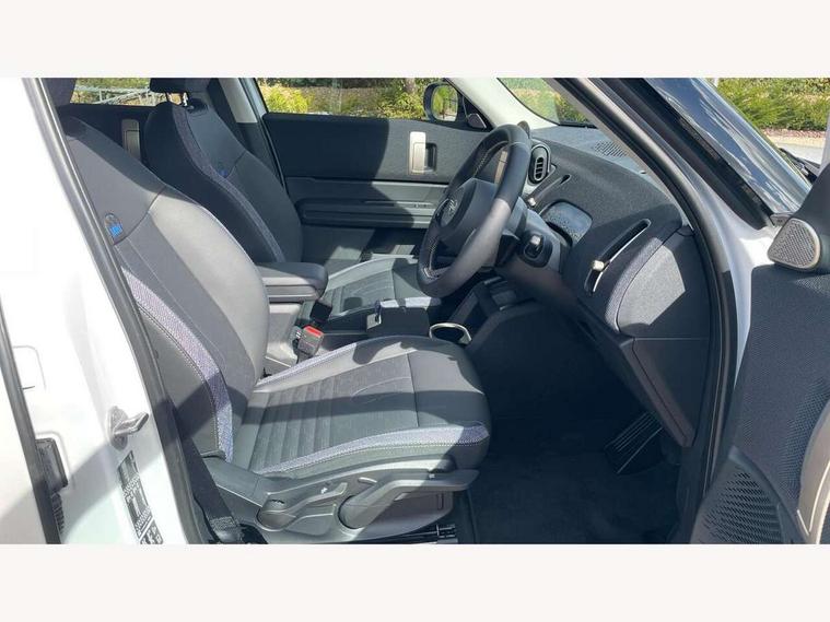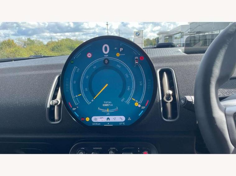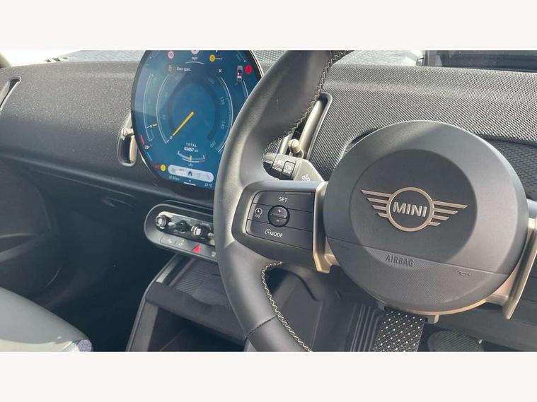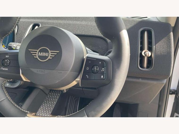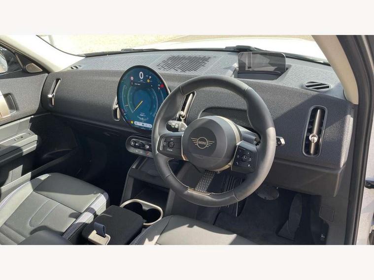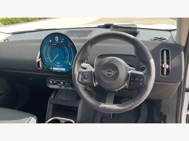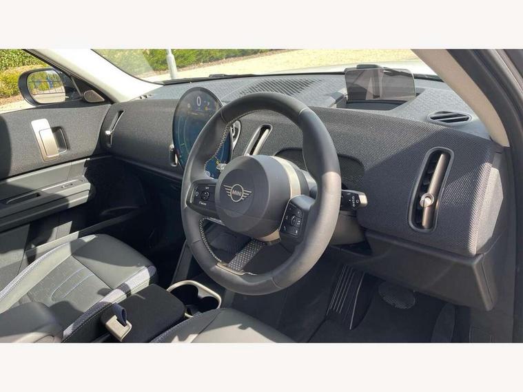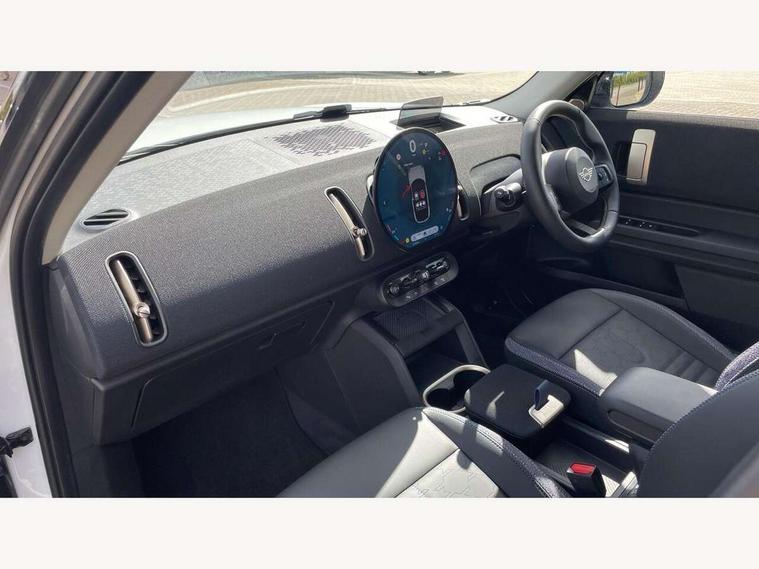 Bluetooth connection, Circular OLED Screen, Compatible mobile phone bluetooth with audio streaming, Cruise Control (DCC), Digital dashboard display, Driving assistant, Driving Assistant Plus Preparation, E-call, Electro-mechanical speed dependant steering assistance, MINI Experience Modes, MINI Head up display, Mini navigation system, MINI TeleServices, Parking assistant in camera and ultrasound based assistance system, rear view camera, parking aid and distance control, Auto transmission with Paddles, Larger capacity fuel tank, 6 speakers, DAB Digital radio, Personal eSim, Auto tailgate, Electric adjustable heated door mirrors, Front and rear electric windows, Heated rear window, High beam assistant, Interior rear-view mirror with automatic anti-dazzle function, LED daytime running lights, LED headlights with extended contents including Adaptable light signatures, LED rear lights, LED third brake light, Rain sensor with auto headlights, Rear side wing doors, Rear window wiper, Roof rails, 3 Seat sliding rear bench in 2nd row, 60/40 split rear bench seat, Auto air conditioning, Driver and front passenger seat heating, Floor mats, Front armrest, Front headrests, Heated steering wheel, Height and length steering column adjustment, Light headliner, Luggage compartment separating net, Rear headrests, Seat adjustment for rear seats, Single front passenger seat, Sport Vescin Steering Wheel, Sunvisors with vanity mirrors, Vescin/Cloth upholstery, Wireless charging tray, Interior and exterior mirror package - Mini Countryman, 3x3 point rear seat belts, 6 Airbags - front, side, head and seat belt tensioners, ABS, DSC - Dynamic Stability Control, Electronic handbrake, Electronic Stability Programme (ESP), Front ISOFIX (iSize), Hill descent control, Hill hold assist, Hill start assist, Manual rear child locks, Traction control, Tyre pressure monitoring system, Warning triangle, Alarm system with tilt sensor, monitoring doors, bonnet interior and tailgate, Auto drive away locking, Comfort access system, Deadlocking function, Electronic vehicle immobiliser, Locking wheel bolts, Remote control locking, Start/stop toggle with keyless go, Black/Blue dashboard knit, MINI Mobility Kit,