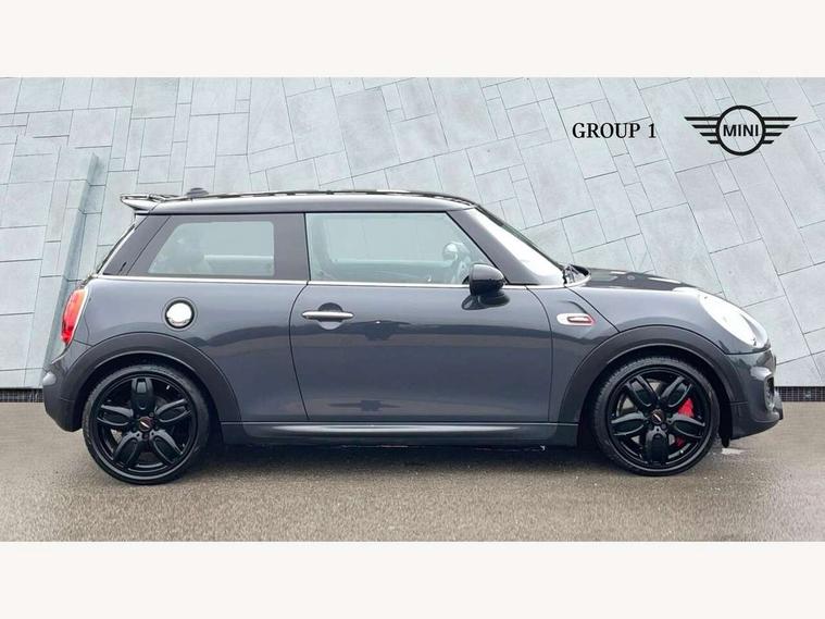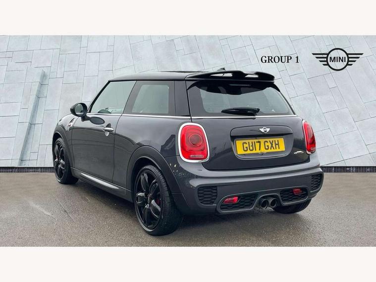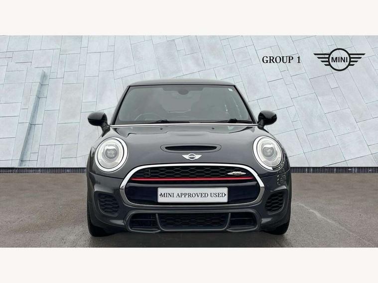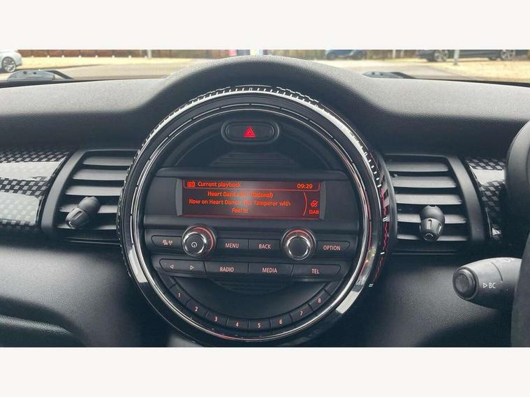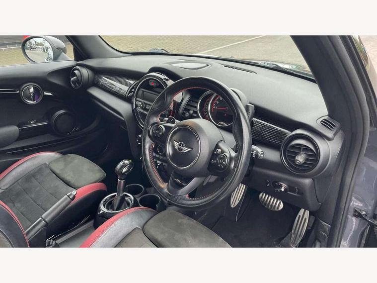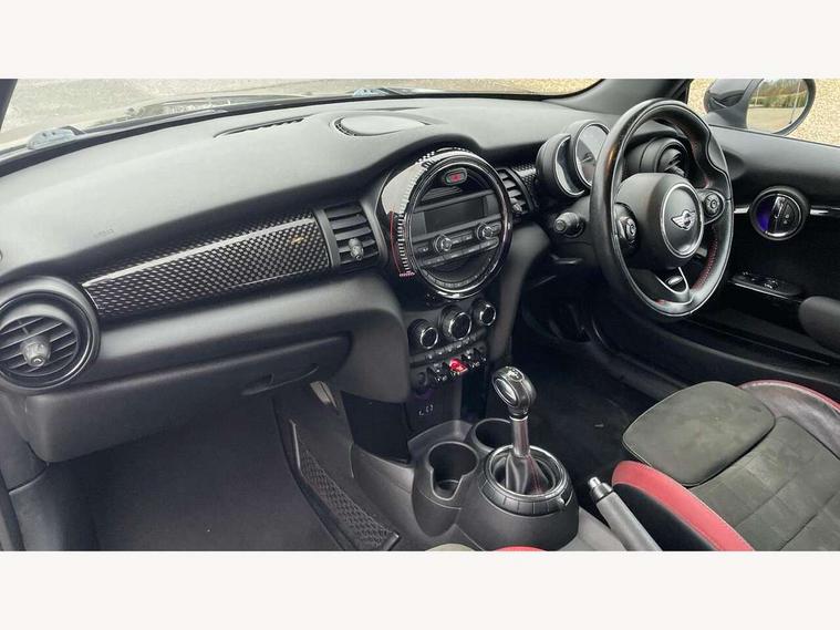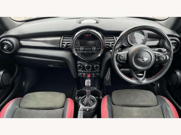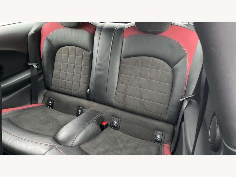 Acoustic seat-belt warning, Brake fluid level warning light, Brake pad wear indicator warning light, DTC - Dynamic traction control, Exterior temperature gauge, Intelligent emergency call, MINI Driving Modes - centre toggle switch to control driving setting (sport, mid and green), MINI TeleServices, Oil level indicator, On board computer, Push button starter, Service interval indicator, Servotronic PAS, Electronic differential lock, Performance Control, Auxiliary input socket, DAB digital radio module, 2 speed wipers+intermittent wipe, Anti dazzle mirror, Anti trapping/one touch open close front windows, Body colour scoop integrated into engine- compartment lid, Body coloured bumpers, Chili red grille bar, Chrome bezels around rear lights and headlights, Chrome door handles, Chrome plated fuel cap, Chrome plated trim on bottom edge of window, Chrome strip on lower grille, Electric front windows, Electrically adjustable door mirrors, Extended wheel arches, Follow me home headlights, Green tinted heat insulating glass, Heated door mirrors/heated windscreen washers, Heated rear window with auto timer, High gloss black tailgate, Honeycomb radiator grille, John Cooper Works roof spoiler, Metal look door sill finishers, Rear wiper, Side scuttles, Twin chromed exhaust pipes, White indicator lights, 2 rear head restraints, 4 boot load lashing points, 6 way manually adjustable passenger seat, 6-way manually adjustable driver's seat, Active carbon filter, Air recirculation system, Anthracite headlining, Auxiliary socket in centre console storage compartment, Centre console storage, Driver's seat height adjuster, Driver/passenger sunvisors, Easy entry seats, Front and rear cupholders, Front head restraints, Front interior light, Front passenger grab handle, Front seat backrest storage nets, Front sports seats, Gear/selector and handbrake in artificial leather, Internal chrome door handles, Isofix child seat preparation, Luggage compartment lighting, Multifunction steering wheel, Passenger seat height adjuster, Reach + rake adjustable steering column, Rear grab handles, Rear storage trays, Split folding rear seats, Storage compartments in doors, Toolkit in luggage compartment, Vanity mirrors, 3 point seatbelts, ABS/EBD, ASC+T, Brake calipers in red, Cornering brake control (CBC), Crash Sensor - activates hazard/interior lighting + unlocks doors, Driver and passenger airbags, Driver/front passenger side airbags, DSC - Dynamic Stability Control, Fuel cut off safety device, Head airbags, Hill start assist, Manual passenger airbag deactivation function, Seatbelt pretensioners, Tyre pressure warning, Ventilated front disc brakes, Drive away door locking, Locking wheel bolts, Remote central locking/doors+fuel cap+tailgate, Second remote key, Thatcham category 1 alarm + immobiliser,