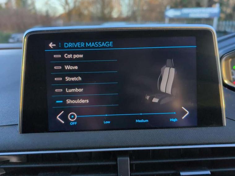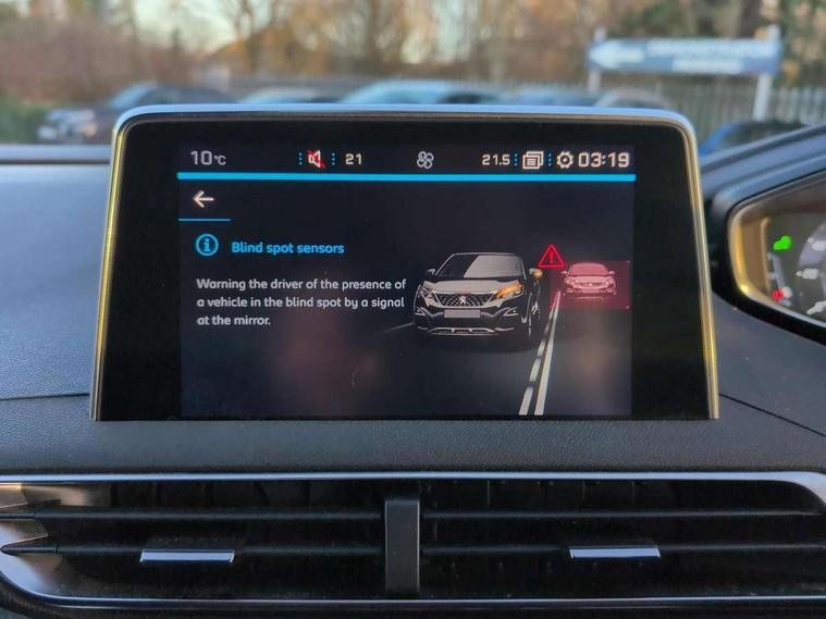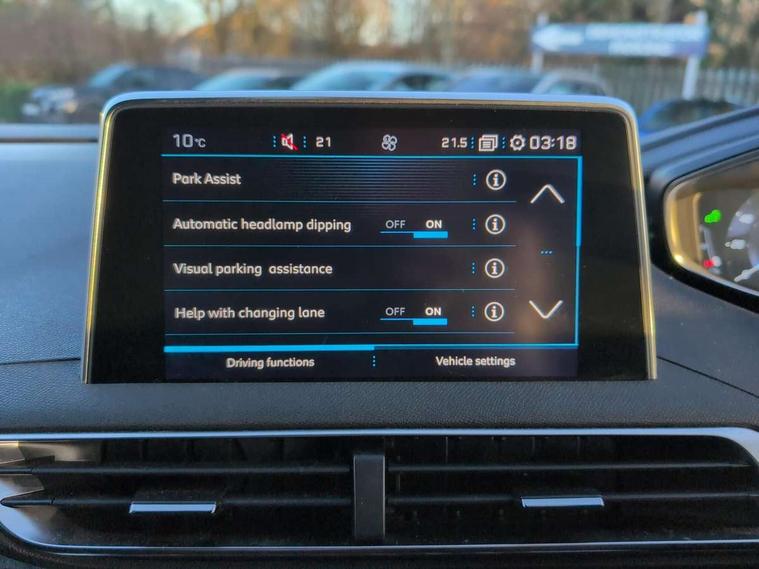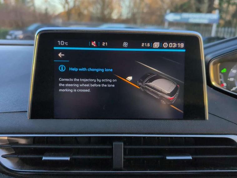 Brumeo fabric interior trim, Satin chrome dash trim, Satin chrome instrument dial surrounds, Visibility pack - 3008, 19" Washington diamond cut alloy wheels, Space saver spare wheel, Anti theft alarm, Automatic door lock/re-lock after 30 seconds, Central locking button on dash, Child lock control of rear doors and windows, Deadlocks, Electric tailgate with Peugeot open & go system, Locking wheel bolts, Remote control central locking with two plip keys, Rolling code transponder immobiliser, DAB Digital radio, Peugeot connect with USB and bluetooth, Radio/MP3 player, Steering column mounted multifunction controls, 3 point front seat belts, 3 point seatbelts on all rear seats, ABS + EBD + EBA, Auto city emergency braking, Driver SMART airbag, Electronic parking brake, ESP with ASR, Front and rear curtain airbags, Front and rear pre-tensioning and force limiting seatbelts, Front passenger SMART airbag with deactivate switch, Height adjustable front seatbelts, Hill start assist, Seatbelt warning lamp and buzzer, Side airbags x 2, Tyre pressure sensor, Aluminium roof rails, Automatic activation of hazard warning lights, Automatic headlamp levelling, Body colour door handles, Body colour rear spoiler, Body coloured bumpers, Chrome bumper inserts, Chrome front fog light surround, Chrome radiator grille and surround, Chrome side window trim, Dark tinted rear windows, Electric folding door mirrors with courtesy approach lighting, Electric operated/heated door mirrors, Heated rear windscreen, LED daytime running lights, LED headlights with LED front fog light and static cornering light, LED rear lights, Lion grey front bumper scuff plate, Nera black door mirrors, One touch electric front/rear windows, Panoramic glass sunroof/electric blind, Peugeot smart beam assist, Rear wiper, Sports front bumper, Twin exhaust tailpipe, 1/3 to 2/3 split folding rear seats, 2 cupholders in front centre console, 230V socket on rear centre console, 3 x 12V power sockets, 4 Lashing eyes in boot, Blue ambient lighting, Centre front armrest with illuminated cool compartment, Cupholders - 2 in rear centre armrest, Dual zone automatic climate control, Fold flat front passenger seat with picnic table, Footwell illumination, Front door pockets, Front headrests, Front reading lights, Front seat back map pockets, Gear shift indicator, Grab handles, Height adjustable headrests, Height adjustable passenger seat, Height/reach adjust steering wheel, Illuminated cupholders, Illuminated glovebox, Illuminated storage compartment, Illuminated vanity mirrors, Instrument panel light dimmer, ISOFIX on front passenger and rear outer seats, LED interior illumination, LED light in luggage compartment, Mistral floor mats, Mistral full grain perforated leather steering wheel with aikinite stitch, Rear centre armrest/ski flap, Rear coat hooks, Rear headrests, Rear reading lights, Reclining front seats, Roof lining - Mistral black, Satin chrome gear lever, Satin chrome interior door handles, Stainless Steel Scuff Plates, Variable boot floor, 'Lights On' Reminder warning buzzer, 3D connected navigation + voice control + Peugeot connect SOS and assistance, Advanced Driver Attention Alert, Android Auto, Blind spot monitoring, Digital clock, Exterior temperature gauge, Lane departure warning system, Lane keep assist, Mirror screen with mirror link and car play, Multi function trip computer, Peugeot i-cockpit with amplify configurable interior ambiences, headup display with distance alert, touch screen, Programmable cruise control and speed limiter, Rear parking aid, Smartphone cradle, Speed limit recognition, Speed sensitive power steering, Diesel particulate filter, Dynamic stability control, Sport mode,