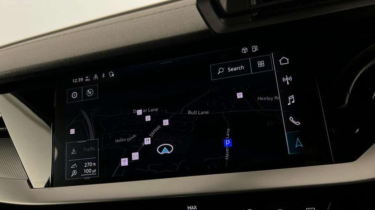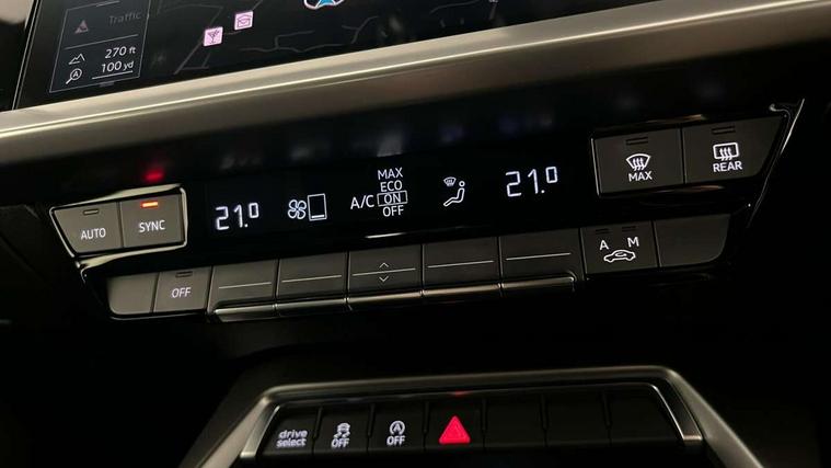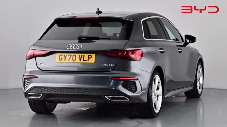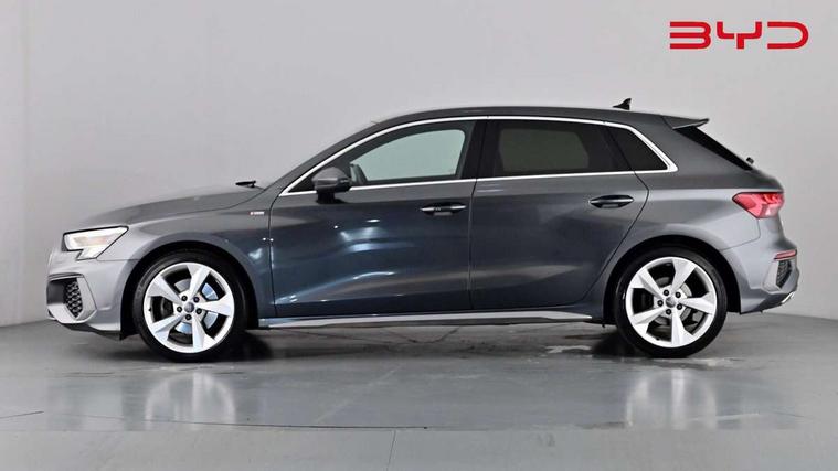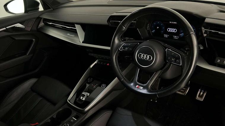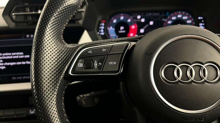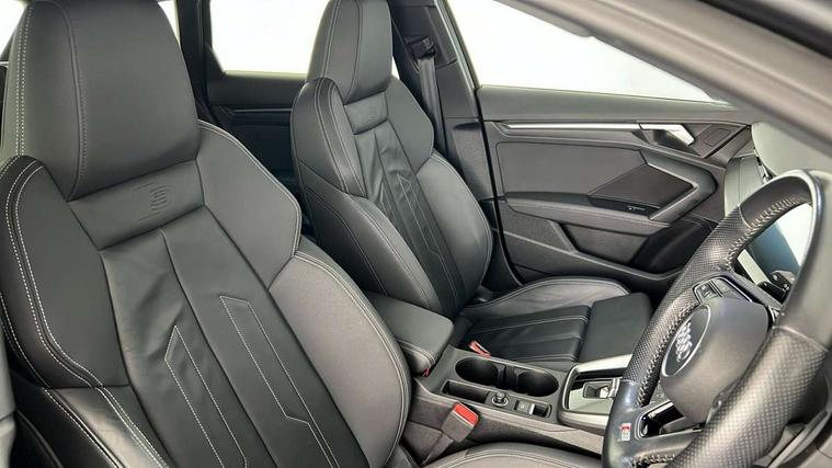 Audi connect emergency call and service, Audi drive select (Auto, Comfort, Dynamic, Efficiency and Individual), Audi smartphone interface, Audi Virtual Cockpit - 10.25" digital and colour instrument cluster, Automatic start/stop system with recuperation, Bluetooth interface, Collision avoidance assistant, Electromechanical power speed sensitive steering, Lane departure warning system, MMI Navigation Plus with high resolution 10.1" colour touch screen display, Service indicator, Trip computer, Voice control system with natural language interaction, 1xUSB-A and 1xUSB-C connection, 6 passive loudspeakers, DAB Digital radio, Acoustic glass windscreen, Aluminium window trim, Auto dimming frameless rear view mirror, Body colour exterior mirrors, Electrically adjustable/heated/folding/dimming door mirrors with kerb view includes integrated LED indications + kerb view function for passenger side, Front electric windows, Illuminated aluminium inserts front door sills with S logo, LED daytime running lights, Light and rain sensors, Privacy glass - dark tinted rear window, rear door and side windows, Rear electric windows, Rear side air outlets in grained matt black, Rear wiper, S line bumpers, S roof spoiler, 12V socket and storage compartment in front centre console, 40/20/40 split folding rear seat bench with cupholder, Black cloth headlining, Dual zone electronic climate control, Front and rear centre armrest in leather, Front and rear headrests, Front/rear floor mats, Height and reach adjustable steering wheel, Interior lighting - glove compartment light and right hand side, Luggage compartment floor covering, Manual boot compartment lid, Manually adjustable front seats, Seat side bolsters, Stainless steel pedals and front footrest, Twin leather upholstery with front sports seats S embossed logo, Aluminium interior elements pack - A3 Sportback, S line styling pack - A3 Sportback, 3x3 point rear seat belts, Driver and front passenger airbag with passenger airbag deactivation, Electronic Stabilisation Control (ESC) including ABS, ASR and EDL, First aid kit with warning triangle and 2 safety vests, Hill hold assist, Pre-sense front with pedestrian and cyclist detection, Seatbelt monitoring, Tyre pressure loss indicator, Anti theft alarm, Anti-theft wheel bolts, Electronically operated child lock, Immobiliser, Remote control central locking, Accent surfaces in the dashboard and centre console in platinum grey silk effect paint finish, Dark spectrum aluminium inlays,
