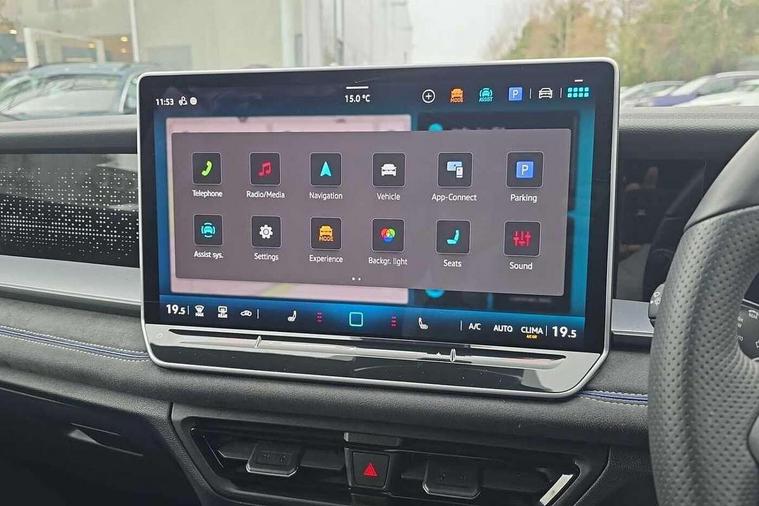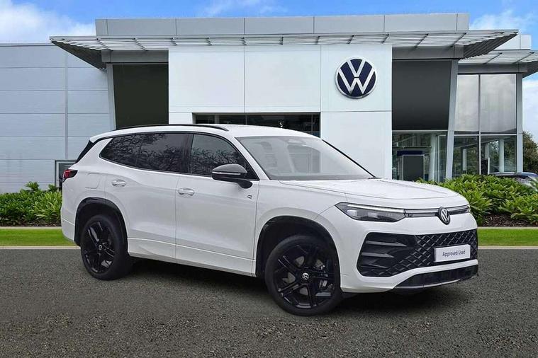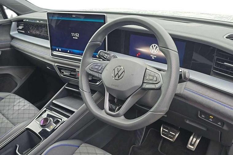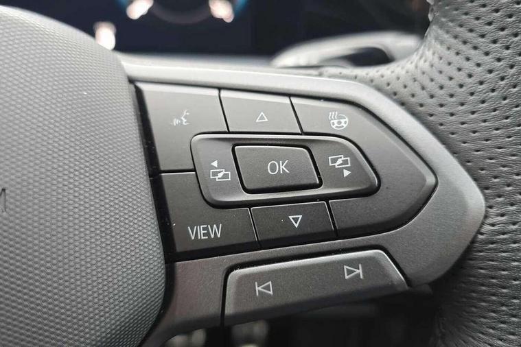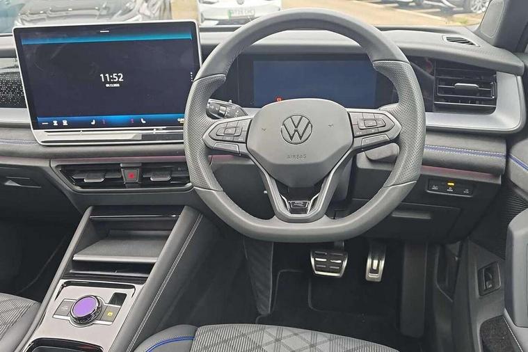 Adaptive cruise control (ACC), Digital Cockpit Pro - 10.25" high resolution dash display screen with customisable menus and information, Driver alert system, Driver attention monitoring system, Dynamic road sign display, E-Sim card for online connectivity, eCall emergency call system, Lane change system, Side assist, Rear traffic alert and Exit warning system, Multifunction front facing camera, Oncoming vehicle braking when turning including swerve support, Start/stop system with regenerative braking, Voice activation spoken voice commands for telephone and navigation system, Warning signal and warning light for front and rear seatbelts not fastened, Wireless App-Connect, Front wheel drive, Digital radio reception (DAB), Diversity antenna for FM reception, Air intake with Chrome trim, Auto dimming interior rear view mirror, Automatic headlight control system, Body colour door handles, Chrome moldings on the side windows, Coming/leaving home lighting function, Dynamic headlight range control with dynamic cornering light, Exterior mirrors convex on the left and aspherical on the right, Heat insulating glass in side and rear windows, Illuminated Volkswagen logo rear with animation, Laminated safety glass winshield, heat insulating, LED 3rd brake light, LED separate signature day time running light, Puddle lights, Rain sensor windscreen wipers, Rear fog light on one side, reversing light on both sides, Rear side wing doors, Rear wiper, Reverse activated passenger's door mirror, Surround lighting with welcome light, Volkswagen logo in front, illuminated lighting animation with wake up/goodbye scenario and illuminated door handles, 10 colour interior ambient lighting, 12V outlet in center console rear and in luggage compartment, 3 rear headrests, 3 rear seat bench in 2nd row, backrest split folding with centre armrest and 2 seats in 3rd row of seats, Black roof lining, Brushed stainless steel pedals, Carpet mats, front and rear, Centre console with illuminated storage compartment with sliding cover and two drinks holders, Chrome elements on the mirror switch and power window switches and door pulls, Door and side trim panel insert in Art velour, Flat luggage compartment floor, Front centre armrest, Front scuff plates in alumium, ISOFIX anchors for child seats on outer rear seats and front passenger seat compatible with i-Size, Mechanical rear seat release, Power adjustable lumbar support in front, Single front passenger seat, Sports comfort seats in front, Sun visors with illuminated vanity mirrors, 3 Point seat belts in front with pretensioners, 3 point seatbelts in outer rear with ECE label, Autonomous emergency braking front assist with pedestrian and cyclist monitoring, Driver and front passenger airbag with front passenger airbag deactivation, Electronic parking brake with auto hold, First aid kit with warning triangle and safety vest, Front and rear curtain airbags, Front and rear side airbags, Front centre airbag, Front disc brakes, Hill start assist, Rear disc brakes, Two tone horn, Decorative material set R-Line, Interior door handle in matte chrome,