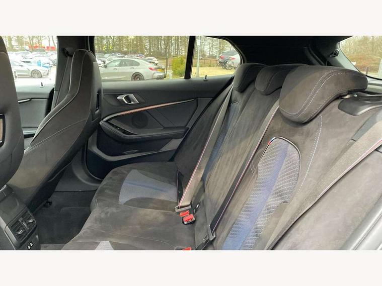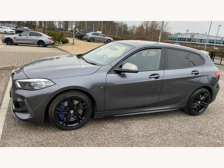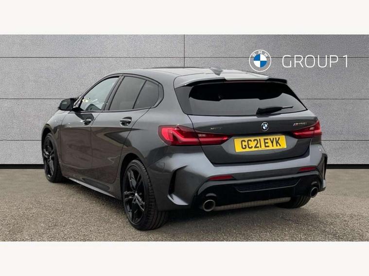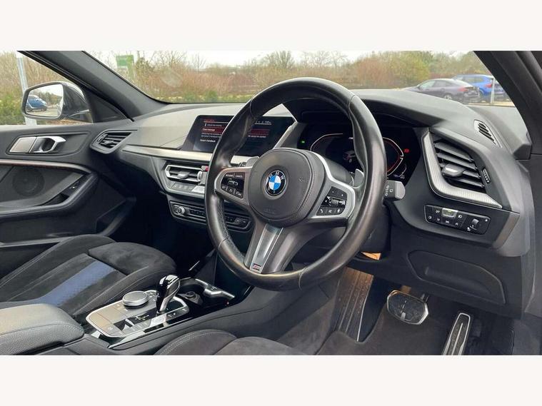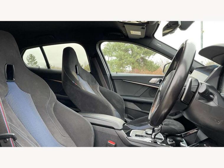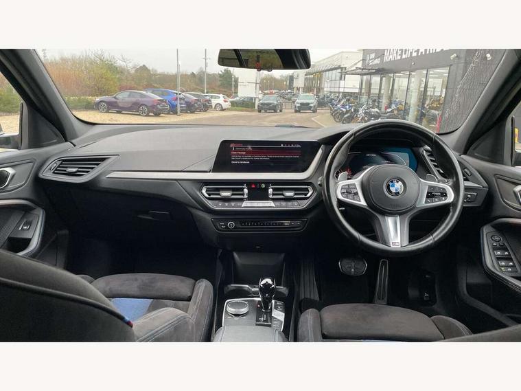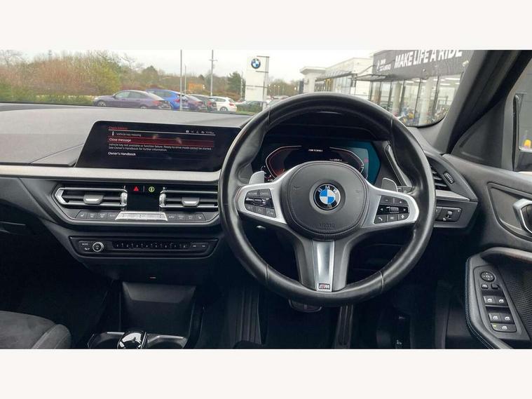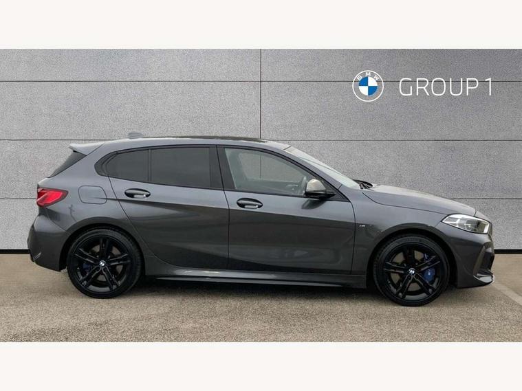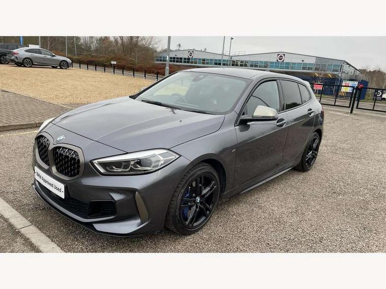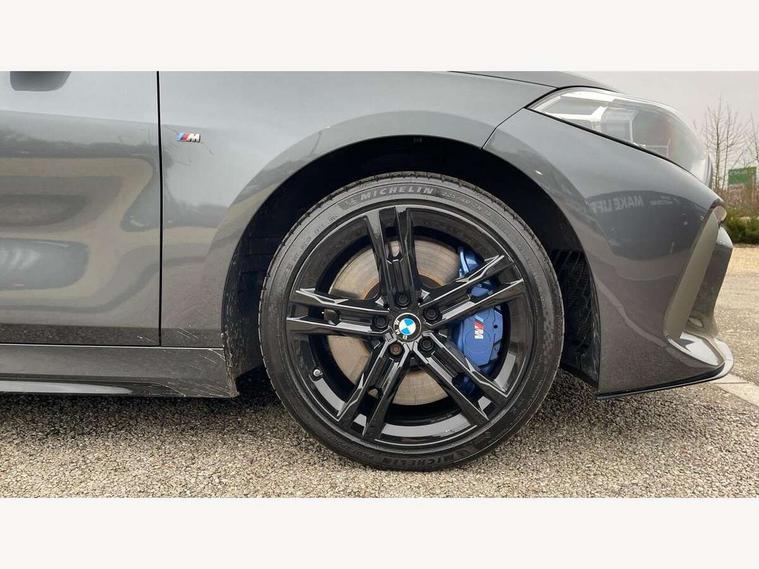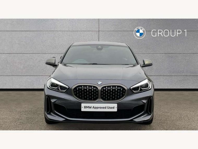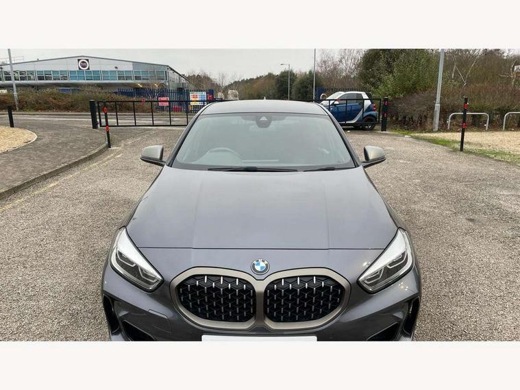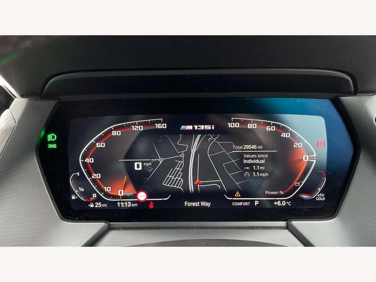 Active guard plus, Attentiveness assist, Bluetooth / WiFi interface for wireless connection of mobile terminal devices and audio streaming, BMW ConnectedDrive online services, BMW Teleservices, Check Control warning system for monitoring of lights and door/luggage compartment open warning, Eco pro mode, Electro hydraulically controlled multi-plate clutch transfers drive to rear axle and with power take-off device located on the front differential., Energy efficient operating strategy, Front axle single joint with specific axle kinematics to minimise drive influences on steering + provide increased rigidity agile driving behaviour, Gearshift time display in manual mode, Integrated owners handbook, M Sports steering with M135i xDrive specific settings, Oil sensor for level and grade, On board computer, Optimum shift indicator, Personal Profile, Pull away assistant, Rigidly mounted rear subframe - Multi link construction with separate spring / damper configuration and excellent driving characteristics, Speed limit Info including no-overtaking indicator, Speed limiter, Sporty fast gear shifting in sport mode, Aluminium lightweight construction, Anti roll bar front and rear, Balancer shaft, Double VANOS, Drive Performance Control, Eight speed sport automatic transmission with gearshift paddle switches, Electronic differential lock, Electronic selector lever, Engine cover with M performance designation, High precision injection, Larger fuel tank capacity (50 litres), Launch control, M135i specific heavily de-throttled engine intake air guide, M135i specific high-performance cooling package, M135i specific larger turbocharger with integrated divert-air valve, Petrol Particulate Filter, Twin tube gas filled shock absorbers with degressive characteristic curve, VALVETRONIC engine management, Variable, stepless and infinitely adjustable distribution of drive torque between the front and rear axles, xDrive intelligent all wheel drive with M135i specific reinforced components, DAB Digital radio, Stereo speaker system with 2 mid range speakers in the front door trims and rear parcel shelf + 2 central bass speakers underneath the front seats, Auto dimming rear view mirror, Automatic headlight beam throw control, Automatic windscreen wipers and automatic headlight, Body colour door handles, Body colour roof trims, Cerium grey exterior mirror caps, Direction indicator side lights in exterior mirrors, Exhaust tailpipe, Cerium Grey with bevelled finish - twin, round 100mm, left and right split, Fading support, Folding side mirrors with auto dimming/folding wing mirrors with auto dimming, Follow me home headlights, Front and rear bumper system with replaceable deformation elements, Front and rear electric windows with open and close fingertip control, anti trap facility and comfort closing, Front door sill finishers with M135i designation, Green tinted heat protection glazing, Heated, electrically adjustable exterior mirror aspheric on driver side, convex on passenger side, High gloss shadowline window frame, Recess cover mirror frames and B/C pillar embelisher trim, High level third brake light, Integrated front windscreen with washer jets, Kidney grille frame in Cerium Grey with Mesh design, LED daytime running lights, LED eyebrow turn indicators, LED front fog lights, Lightweight engineering, M logo designation side in cerium grey, M Performance exhaust system with valve control and minimised exhaust back pressure, M Performance specific setup, M Sport spoiler, Matt black air guide grilles, Matt black wheel arch trim, Model designation on electric bootlid includes xDrive designation for M135i xDrive, Nearside reverse light in rear light cluster, Preparation for high beam assistant, Rear fog lights, Rear window wiper, Reinforced crank drive, new pistons and adapted con rods, Shark fin antenna, Trailer stabilisation logic, Visible VIN plate, Welcome lighting, 12V power socket in front centre console with blanking plug, 3 rear seat head restraints, 3 spoke sports leather steering wheel with black leather and stitching, pearl chrome decorative finish, specific M Badge, Ambient interior lighting, Anthracite headlining, Child seat ISOFIX attachment for two outer rear seats and front passenger seat with anchorage points, Conditioned based service, Driver and front passenger seat heating, Floor mats in anthracite velour with contrasting colour seam to match contrast stitching on instrument panel, Folding rear clothes hook, Four grab handles integrated in roof lining, Front and rear door pockets with bottle holders, Front and rear side armrest integrated into door trim, Front armrest, Front M sports seats, Glove compartment, Height adjustable front head restraints, Luggage compartment for bag hooks on left and right, foldable luggage compartment liner and two lashing eyelets, Manual adjust steering wheel, Multi-function controls for steering wheel, Storage compartment in centre console, Sun visors with vanity mirrors and insert tab, Two front centre console cupholders, Two zone automatic air conditioning, Additional interior lighting pack - 1 Series M135i, Additional storage compartment pack with code 493 -1 series, BMW live cockpit professional pack- 1 Series, Connected pack professional - 1 Series, Interior lights pack - 1 Series, M Sport exterior styling aerodynamics pack - 1 Series 135i, 2 tone horn, 3 point seatbelts on all seats, front pyrotechnic belt tensioners, stopper and belt force limiters, rear coded belt buckles, Airbags - Front driver/passenger, front and rear curtain head protection, front side, manual deactivation of front passenger airbag, Anti lock braking system (ABS) with brake assist, BMW emergency call, Brake drying, Braking readiness, Child proof locking system in rear door, Comfort modes, Cornering brake control, Crash sensor activating central locking release, hazard warning lights, fuel cut off, interior lighting + activation of safety battery terminal clamp, Driver and front passenger