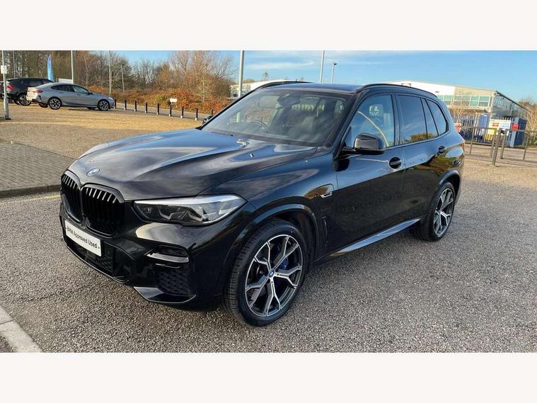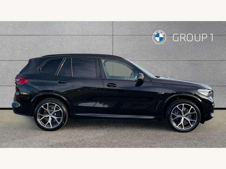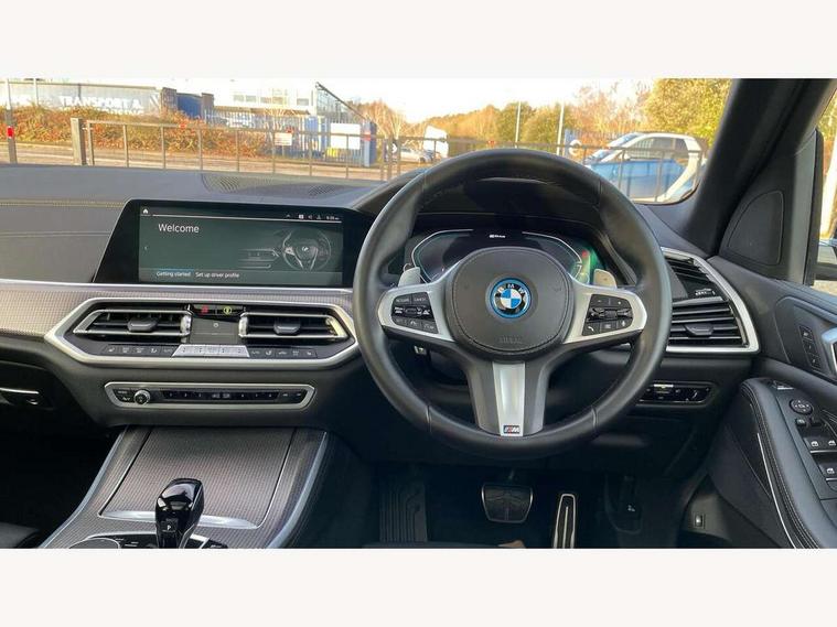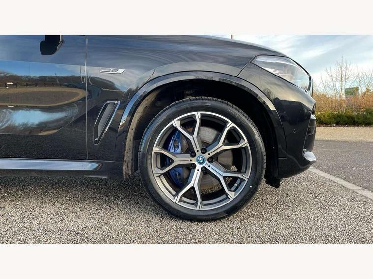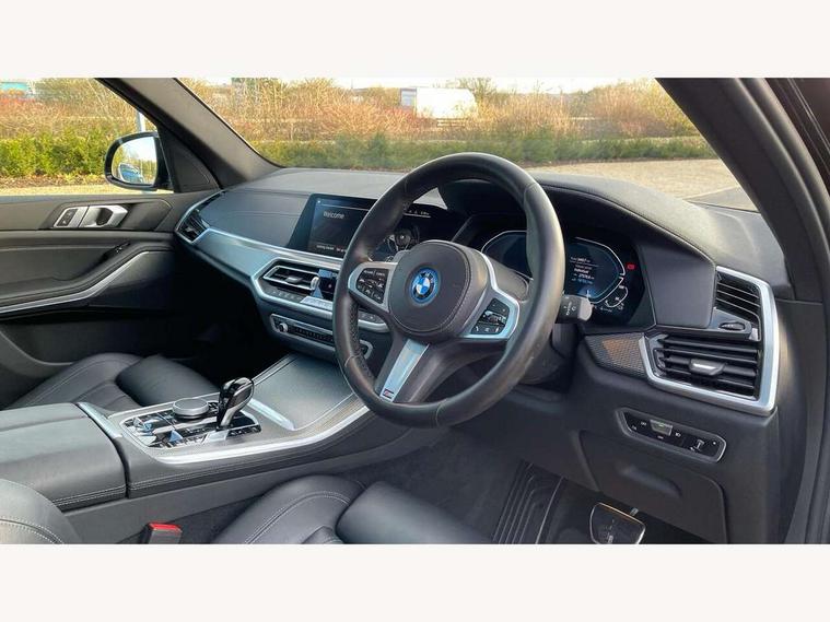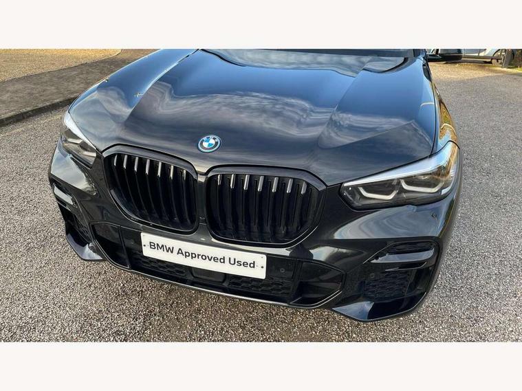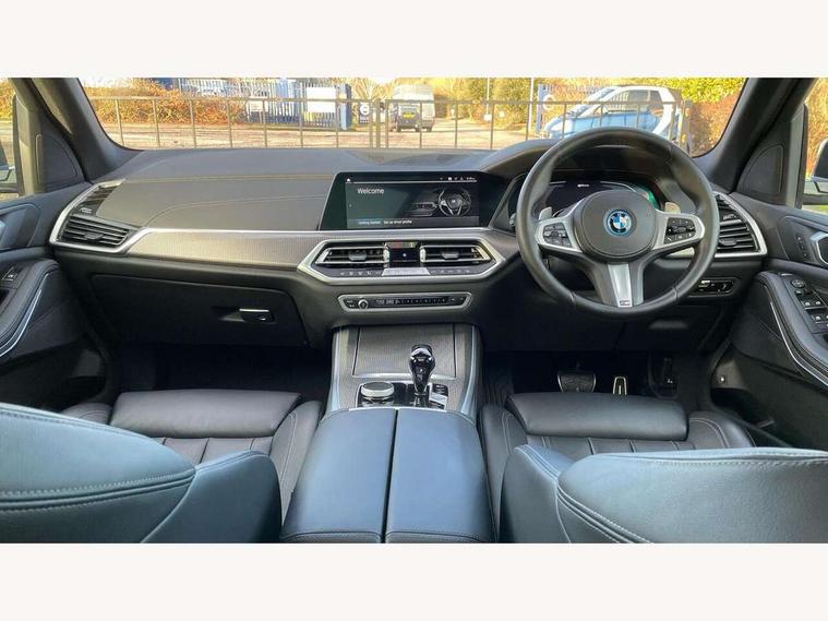 20GB hard disc drive (HDD) memory, Active guard plus, Attentiveness assist, Automatic tailgate with top hinged section open and manual bottom hinged section, BMW ConnectedDrive online services, BMW digital live cockpit professional - 12.3" digital instrument panel and 12.3" CID, with touch/voice command, BMW legal emergency call, BMW Teleservices, Brake force display, Brake pad wear indicator warning light, Cruise control with brake assist, eDrive button to select between AUTO eDrive, MAX eDrive and SAVE Battery settings, Front/rear park distance control, Lights on warning, Oil sensor for level and grade, On board computer inc. average speed, fuel consumption, liquid crystal Info display, journey computer, outside temperature display, personal profile, Service interval indicator, Speed limit info display, Speed limiting function, 5 metre AC Fast charge cable, Adaptive 2-axle air suspension, Double VANOS, Double wishbone front axle, Drive performance control with ECO PRO comfort + sport mode, eDrive exterior sound, Eight speed steptronic sport automatic transmission and gearshift paddles on the steering wheel, High precision injection, Petrol Particulate Filter, Safety battery terminal clamp, Standard Charging cable (Mode 2) for home socket, Twin scroll turbocharger with Valvetronic, DAB Tuner enables digital radio reception, Favourite buttons, USB connection, USB type A 1.5A in cupholder, USB Type C 3A in centre armrest, Active Air Stream kidney grille with high-gloss chrome, Adaptive air flap control bar in high-gloss black, Automatically dimming rear view mirror, BMW Individual high gloss black shadow line roof rails, Body colour bumpers, Body colour door handles, Dynamic brake lights with LED technology, Exhaust tailpipes - single, left and right with Chrome finisher, Follow me home headlight function, Front and rear electric windows with open and close fingertip control, anti trap facility and comfort closing, Heated windscreen washer jets, High beam assistant, High gloss black outer and central air intakes on front bumper with pearlescent chrome finish, High gloss black Side elements, LED daytime running lights, LED rear lights, Left charging flap on the front side, M aerodynamic body styling, M designation on left and right front side panels, Pearlescent chrome front grille bars, Rain sensor with automatic headlight activation and windscreen wiper control, Rear side wing doors, Satin aluminium side window graphic, Third brake light in rear spoiler, Variable intermittent rear wash/wipe, Welcome light carpet, X5 on left tailgate, xDrive designation on right tailgate, 12V - Power sockets with 2x centre console and 1x luggage compartment, 3 seat bench in 2nd row, 40:20:40 split folding rear seats, Ambient interior lighting with 6 pre-designed selectable lights including dynamic function, Centre and rear interior light, Child seat ISOFIX attachment with rear outer seats includes top tether, Compartment in front of cupholder, Electric front seat adjustment with driver and front passenger memory function, Electrical steering column with adjustable height and length with activation and control on the steering column, Foldable rear centre armrest with 2 cupholders and storage compartment, Front and rear cupholders x 2, Front and rear door pockets, Front and rear door sill inlays with illuminated BMW M designation, Front and rear side armrest integrated into door trim, Front footwell lights, Front reading lights, Light inside glove compartment, Lockable glove compartment, Luggage compartment floor panel with integral storage tray, Luggage compartment lighting, M leather steering wheel, M specific key, M specific pedals, M specific steering wheel, M specific velour floor mats, Make-up mirror lights, Multifunction controls for leather steering wheel, Multifunctional hooks, Rear head restraints, Seat back with flap pocket, Securing rings in luggage compartment, Storage bins on all doors, Storage tray and compartment with cover in centre console, Sunvisors with illuminated vanity mirrors, Toolkit located in luggage compartment, Connected Package Professional - X5 xDrive45e, Expanded exterior mirror pack - X5/X5 M, Non-smokers pack - X5, Airbags - driver/front passenger, rear and side, first and second row seats head airbags, front passenger seat airbag deactivation + knee airbag, Anti-lock braking system (ABS), Automatic Stability Control (ASC), Brake drying, Brake energy regeneration, Brake fade compensation, Braking pre-tensioning, Child proof locking system in rear door, Cornering brake control (CBC), Crash sensor activating central locking release, hazard warning lights, fuel cut off, interior lighting + activation of safety battery terminal clamp, Deformation zones - front and rear with door reinforcements and bumpers up to 2.5 mph, DSC - Dynamic Stability Control, Dynamic brake control, Dynamic Traction Control - DTC, Electromechanical parking brake with automatic drive away release and auto hold function, Electronic brake force distribution, Front and rear seatbelts with seatbelt stopper, seatbelt tensioner for front and outer rear seats and belt force limiter, Front head restraints with anti-whiplash, Height adjustable front seatbelts, Hill start assistant, Integrated brake system, M Sport braking system in blue high gloss + blue painted brake calipers with M designation, Mechanical child proof lock on rear doors, Passive protection for pedestrians, Seat occupancy detection for driver and passenger side, Side impact protection, Three 3 point inertia reel seatbelts, Two tone horn, Tyre pressure monitoring system, Ventilated front and rear disc brakes, Warning triangle and first aid kit, Closing system with central locking, Driver and front passenger door centre lock switch, Locking wheel bolts, Thatcham 1 alarm system with remote control and engine immobiliser, Start/stop toggle diamond shaped trim finisher in pearl chrome,