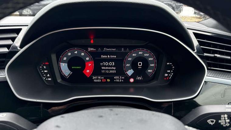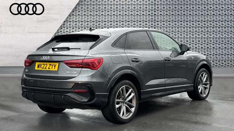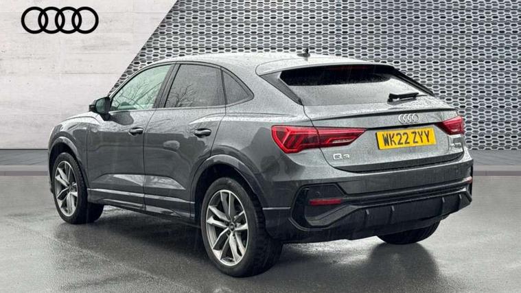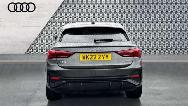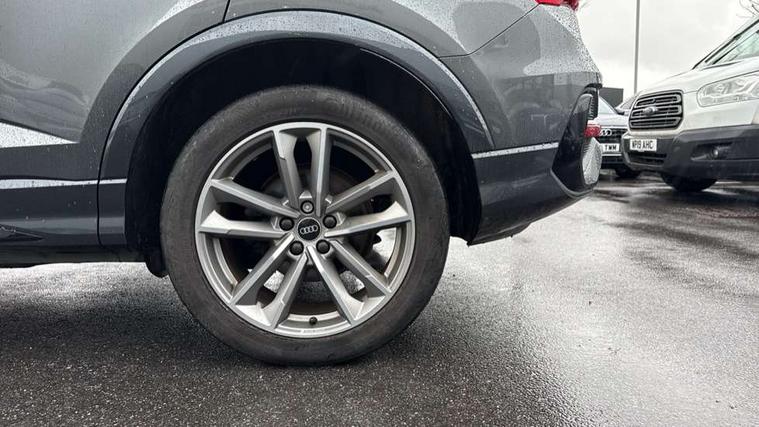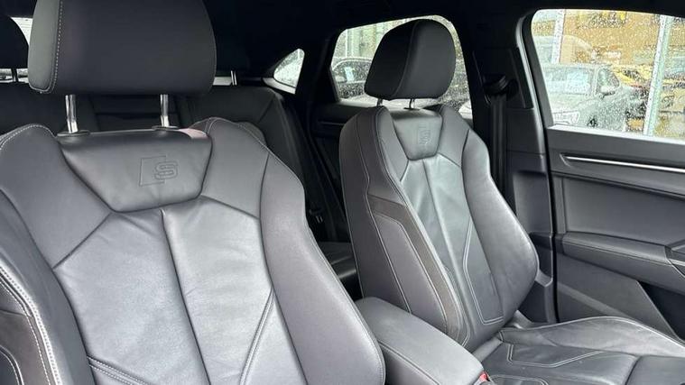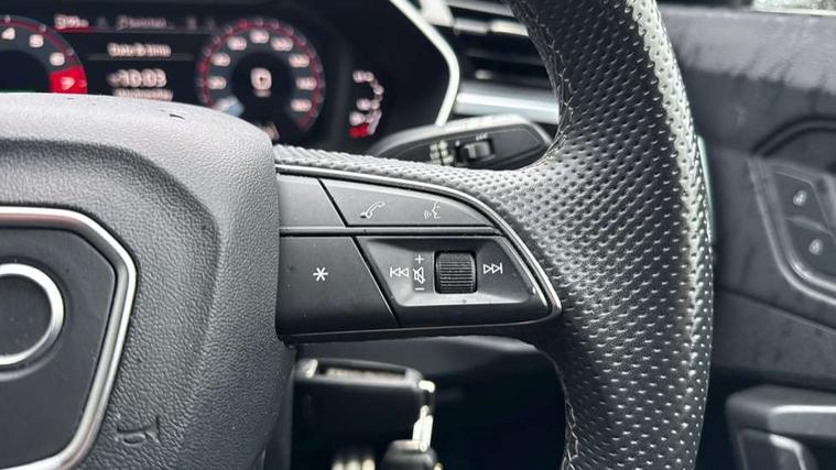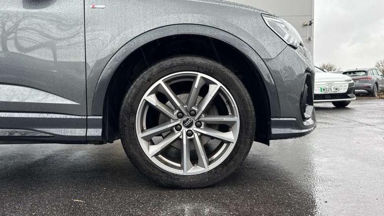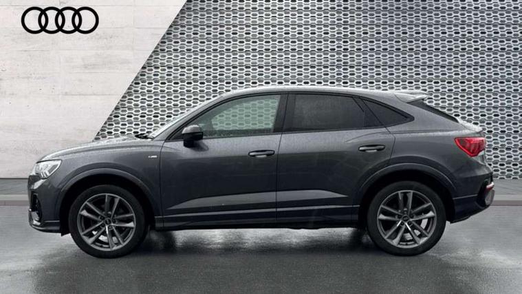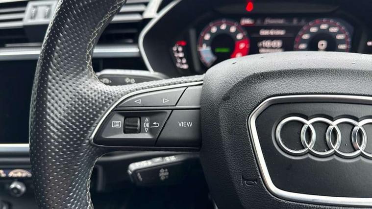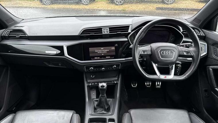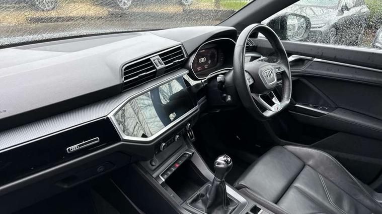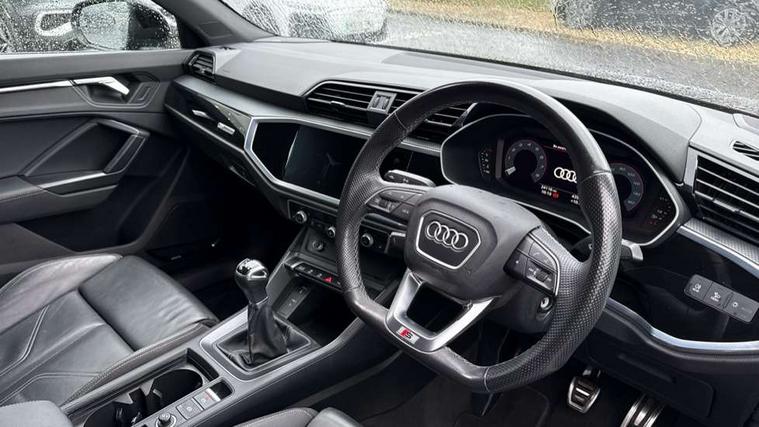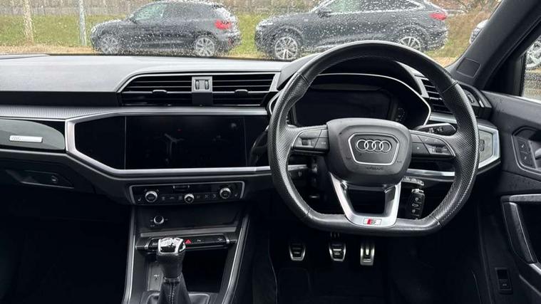 Audi connect safety and service, Audi drive select, Audi lane departure warning, Audi Virtual Cockpit - 10.25" display, Bluetooth interface, Camera based traffic sign recognition, Cruise control + speed limiter, Distraction and Fatigue warning, Legal emergency call, MMI Navigation Plus with high resolution 10.1 inch touchscreen colour display, Parking system plus, Phonebox light with wireless charging, Power operated tailgate, Progressive steering, Reversing camera, Service interval indicator, Smartphone interface includes wireless Apple carplay/Android Auto, Start stop system with recuperation, Voice control system with natural language interaction, Sports suspension, 2 USB-C ports with charge and data functions, DAB digital radio module, SONOS premium sound system, Acoustic windscreen, Audi Beam uses LEDs to project the Audi logo onto the ground as you exit your Q3, Auto dimming door mirrors, Auto dimming frameless rear view mirror, Electrically folding, adjustable and heated door mirrors with integrated LED side indicators and kerb view function for passenger side, Front and rear electric windows, Front fog lights, Front underbody protection in manhattan grey paint finish, High gloss black finish B and C pillars, Honeycomb design radiator grille in matt anthracite black, LED Dynamic rear indicators, LED headlights with LED daytime running lights, LED rear lights, LED third brake light, Privacy glass dark tinted rear and rear-side windows (from B-pillar backwards), Rain and light sensors, Rear diffuser grille in grained matt black, Rear diffuser strip in matt anthracite black, Rear side wing doors, Rear underbody protection in matt black, Rear wiper, S line front and rear bumpers and side skirts in contrasting Manhattan grey paint finish, Variable front intermittent wipers, 12V socket in rear centre console, 3 seat bench in 2nd row, 3 spoke flat bottomed multi-function leather sport steering wheel, 40:20:40 folding with manual adjustment for 60:40 forwards/backwards position and backrest angle, Adjustable rear seat bench/backrest with centre armrest and cupholder, Black carpet mats, Black cloth headlining, Dual zone electronic climate control, Electric lumbar support, Front and rear black floor mats with contrast stitching in rock grey, Front and rear headrests, Front centre armrest, Heated front seats, Height and reach adjustable steering wheel, Illuminated door sill trims with S logo, ISOFIX child seat mounting for front passenger with airbag deactivation and outer rear seat including top tether attachment point for outer rear seats, Luggage compartment sill protection in stainless steel, Manual front seats with height adjustment, Perforated leather gearknob, Single front passenger seat, Stainless steel pedals, Twin leather upholstery with front sport seats + S embossing, Black styling pack - Q3, Non smoking pack - Q3, 3x3 point rear seatbelts, 6 airbags - Driver, front passenger, curtain and side windows, Audi pre-sense front with pedestrain and cyclist recognition, Electrically operated child locks on rear doors, Electromechanical parking brake, Electronic stabilisation control including ABS, ASR and EDL, Front seatbelt reminder, Hill descent control, Hill hold assist, Pre sense basic, Seatbelt monitoring, Tyre pressure warning, Warning triangle and first aid kit, Anti theft wheel bolts, Immobiliser, Remote central locking, Thatcham approved category 1 anti theft alarm, Aluminium look interior elements, Detail dashboard around MMI touch colour display in glass look, black with surround in aluminium look, Leatherette door armrest, Piano black inlay,