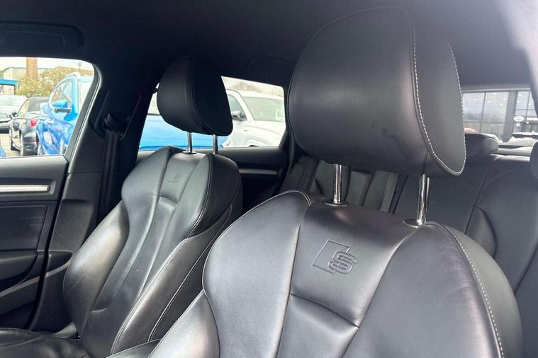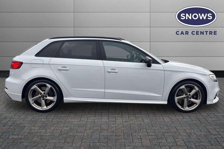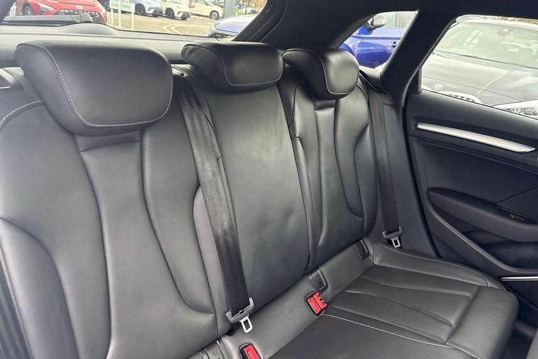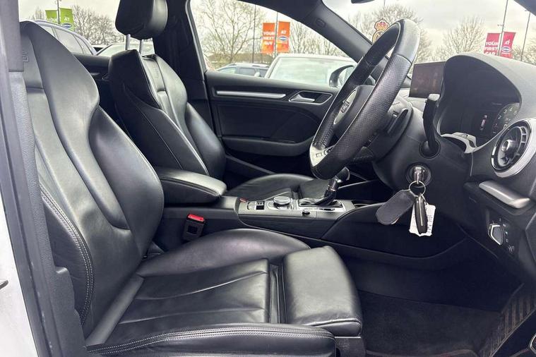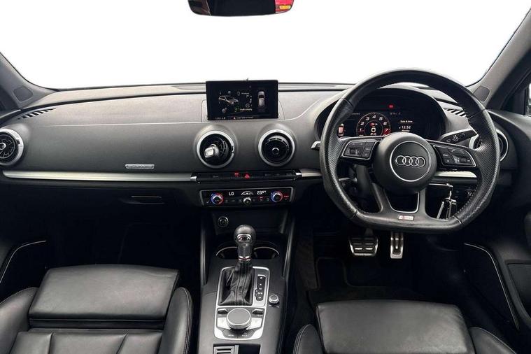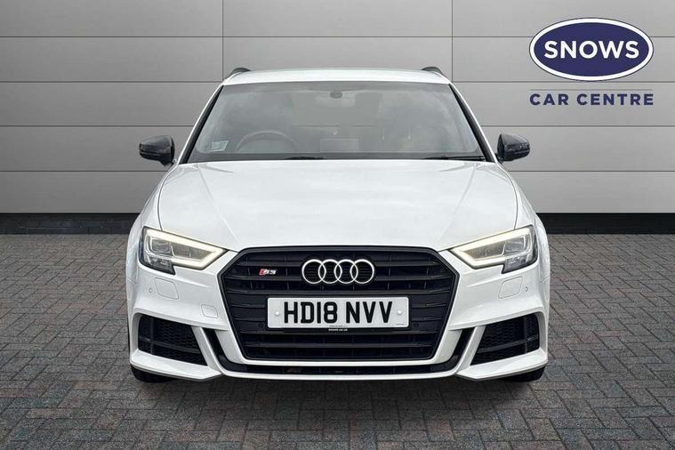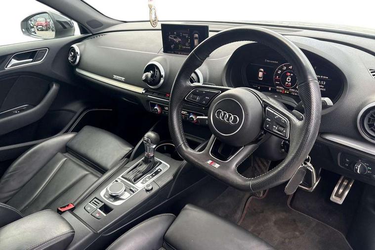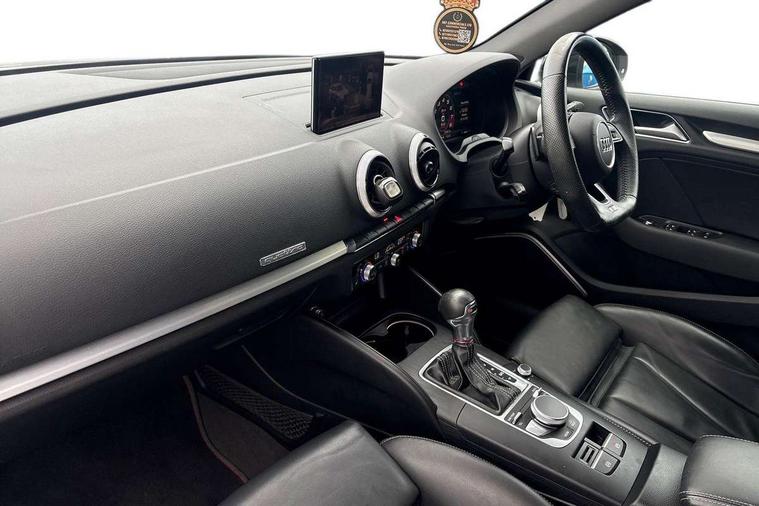Audi connect, Audi drive select, Audi smartphone interface, Colour driver's information system display, HDD satellite navigation system radio single CD/DVD player MMI control system, Mobile telephone preparation - bluetooth interface, Progressive power assisted steering, Service interval indicator, Speed limit display, Voice control system, S sports suspension, 2 USB ports, Audi music interface, Auxiliary input socket, Bang + Olufsen advanced sound system, CD player, DAB Digital radio, MMI radio plus with 7" colour MMI screen and MMI controller, Auto dimming rear view mirror with light and rain sensors, Black door mirrors, Black window surrounds, Body colour bumpers with black insert, Body colour roof spoiler, Electric front windows, Electric operated/heated door mirrors, Electric rear windows, Headlight washers, Heated windscreen washer jets, LED daytime running lights, Matt black radiator grille, Platinum grey radiator grille with double chrome bars, Privacy glass, Rear wiper, S body styling, Twin oval chrome trimmed exhaust tailpipes, 3 adjustable rear headrests, 3 spoke flat bottomed multi-function leather steering wheel, 4 lashing points to secure luggage, Adjustable front armrest, Dual zone electronic climate control, Front and rear interior lights with delay, Front passenger seat isofix location point, Front/rear floor mats, Heated front seats, Height/depth adjustable steering column, Illuminated glovebox, ISOFIX child seat preparation+airbag deactivation, Jack and tool kit, Rock grey headlining, Stainless steel pedals, Steering wheel gearshift paddles, Storage compartment in centre console, Storage compartment under front seats, Storage compartments in doors, Black styling pack - A3/S3, LED interior light pack - A3/RS3, Non smoking pack - A3, Storage and luggage pack - A3/RS3, 3 point seatbelts on all seats, ABS/EBD, Active bonnet, Active front headrests, ASR, Curtain airbags, Driver and passenger side airbags, Driver/Front Passenger airbags, Drivers knee airbag, EDL, Electromechanical parking brake, ESC - Electronic Stability Control + traction control, Front passenger airbag deactivation, Hill hold assist, Manual rear child locks, Multi-Collision braking, Seatbelt warning, Tyre pressure warning, Warning triangle and first aid kit, Anti theft alarm, Anti-theft wheel bolts, Remote control central locking, Thatcham category 1 alarm + immobiliser, Aluminium air vent surrounds, Aluminium trim elements, Matt brushed aluminium inlays, Space saver spare wheel,