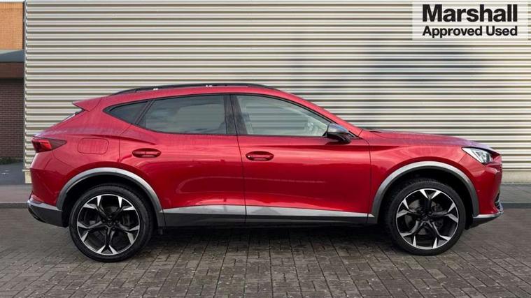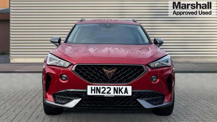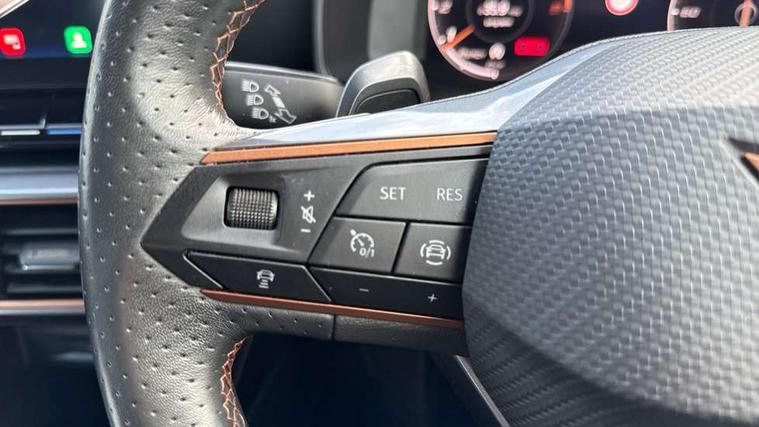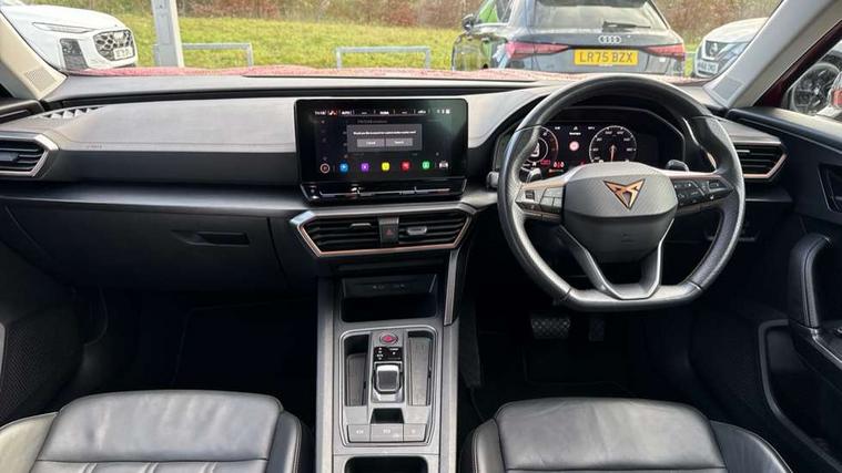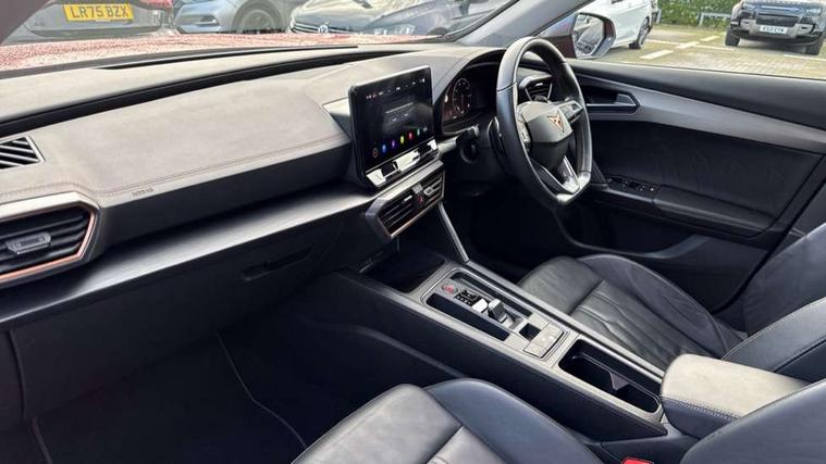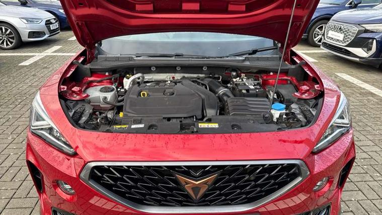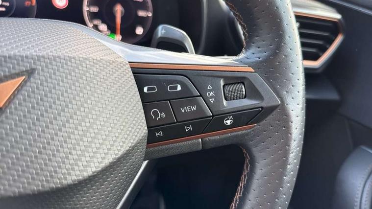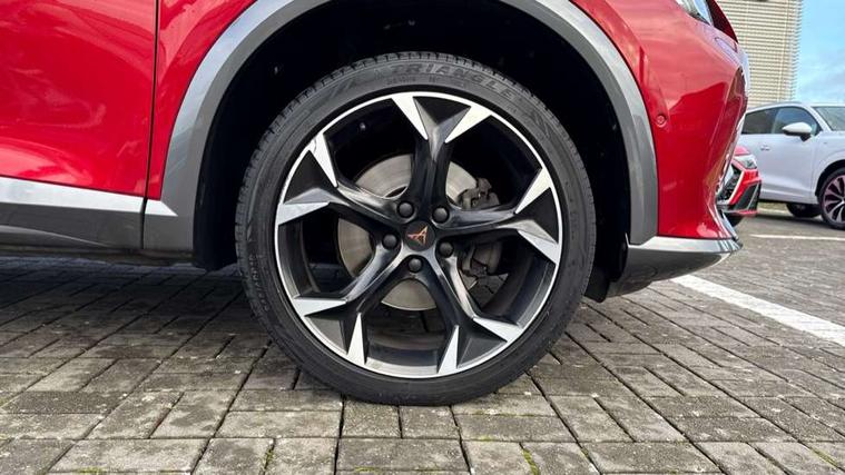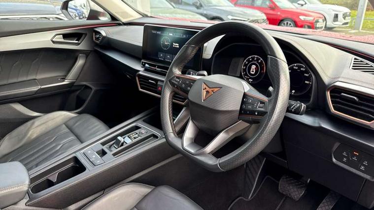 Digital cockpit and configurable dashboard, Driver alert system, Driving profile selection, E-call, Forward collision warning with automatic braking, Lane assist, Park assist (inc front/rear parking sensors), PAS, Predictive adaptive cruise control with speed limiter, Rear view camera, RPM, trip computer, outside temp gauge, instrument light brightness, low fuel warning light, lights on reminder, gearshift indicator, Service interval indicator, Start/stop system with regenerative braking, Wireless apple carplay, Wireless phone charger, Electronic locking differential and dynamic traction support, Standard suspension, 2 front and 2 rear USB type C sockets, Auxiliary input socket, DAB radio, Auto dimming rear view mirror, Body colour door handles, Body coloured bumpers, Dark grey wing mirror, Daytime running light with automatic headlight control and coming home feature, Dynamic headlight range control, Electric front/rear windows, Electrically adjustable heated and folding door mirrors with memory function, Front fog lamps with cornering function, Gloss black roof rails and window surrounds, LED Headlights, LED Taillights with dynamic indicator, Rain sensing wipers, Rear diffuser with black simulated exhaust pipes, Rear side wing doors, Rear wash/wipe, Third brake light, Tinted rear windows, Welcome lights, 12v power supply in centre console, 12V socket, 12v socket in loadspace, 2 front and 2 rear reading lights, 230V socket, 3 seat bench in 2nd row, 60/40 split rear bench seat with armrest and mechanical seat release, Dust/pollen filter, Front and rear head restraints, Front centre armrest, Height/reach adjust steering wheel, Illuminated interior front door sills, Illuminated sunvisor with mirror, Isofix, Leather multi function heated steering wheel with gear shift paddles, Luggage tie-down hooks, Single front passenger seat, Three zone climate control with control panel in rear, Variable luggage/load compartment floor, Wraparound lighting, Genuine Nappa leather Pack - Cupra, Navigation system pack with 10" navigation system - Formentor, 3 point seatbelts on all rear seats, ABS, Brake control system - ESC and brake booster, Child proof door locks, Driver and front passenger airbags with front passenger airbag de-activation, Electronic parking brake, Front and rear disc brakes, Front side curtain airbags, Hill hold control, Seat belt reminder for front and rear seats, Tyre pressure monitoring system, Anti theft alarm system, Keyless entry and start system (KESSY), Locking wheel bolts, Copper and aluminium interior detailing, 19" 'Exclusive' machined sport matte black and silver alloy wheels,
