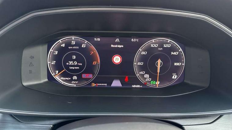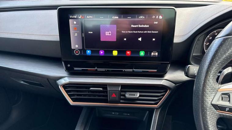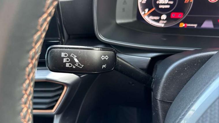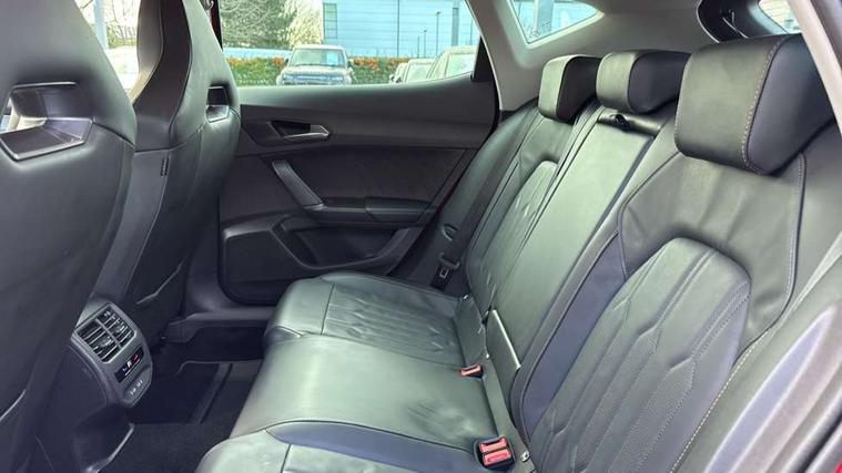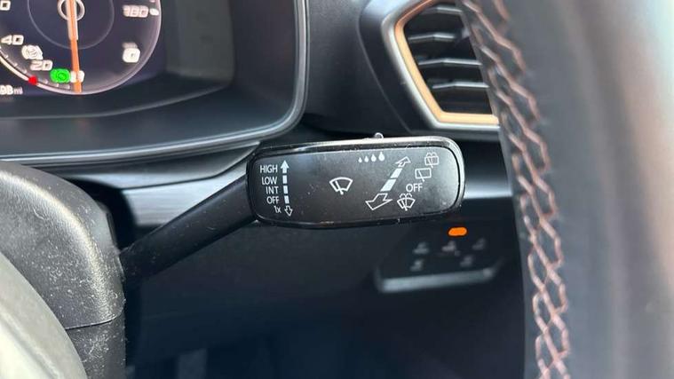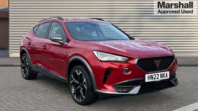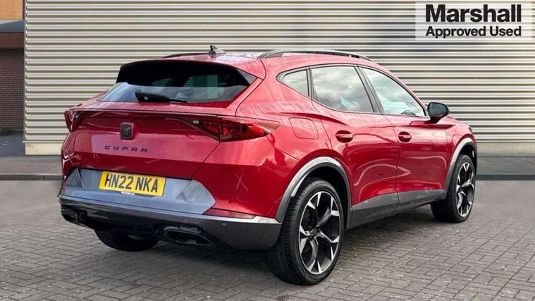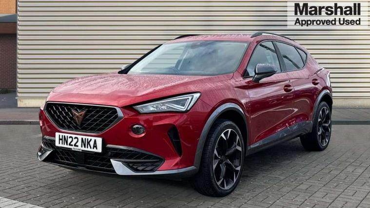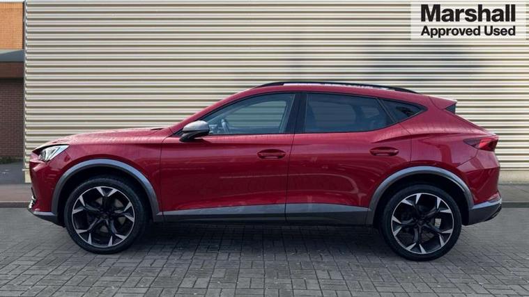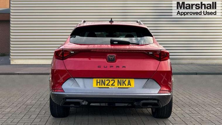 Digital cockpit and configurable dashboard, Driver alert system, Driving profile selection, E-call, Forward collision warning with automatic braking, Lane assist, Park assist (inc front/rear parking sensors), PAS, Predictive adaptive cruise control with speed limiter, Rear view camera, RPM, trip computer, outside temp gauge, instrument light brightness, low fuel warning light, lights on reminder, gearshift indicator, Service interval indicator, Start/stop system with regenerative braking, Wireless apple carplay, Wireless phone charger, Electronic locking differential and dynamic traction support, Standard suspension, 2 front and 2 rear USB type C sockets, Auxiliary input socket, DAB radio, Auto dimming rear view mirror, Body colour door handles, Body coloured bumpers, Dark grey wing mirror, Daytime running light with automatic headlight control and coming home feature, Dynamic headlight range control, Electric front/rear windows, Electrically adjustable heated and folding door mirrors with memory function, Front fog lamps with cornering function, Gloss black roof rails and window surrounds, LED Headlights, LED Taillights with dynamic indicator, Rain sensing wipers, Rear diffuser with black simulated exhaust pipes, Rear side wing doors, Rear wash/wipe, Third brake light, Tinted rear windows, Welcome lights, 12v power supply in centre console, 12V socket, 12v socket in loadspace, 2 front and 2 rear reading lights, 230V socket, 3 seat bench in 2nd row, 60/40 split rear bench seat with armrest and mechanical seat release, Dust/pollen filter, Front and rear head restraints, Front centre armrest, Height/reach adjust steering wheel, Illuminated interior front door sills, Illuminated sunvisor with mirror, Isofix, Leather multi function heated steering wheel with gear shift paddles, Luggage tie-down hooks, Single front passenger seat, Three zone climate control with control panel in rear, Variable luggage/load compartment floor, Wraparound lighting, Genuine Nappa leather Pack - Cupra, Navigation system pack with 10" navigation system - Formentor, 3 point seatbelts on all rear seats, ABS, Brake control system - ESC and brake booster, Child proof door locks, Driver and front passenger airbags with front passenger airbag de-activation, Electronic parking brake, Front and rear disc brakes, Front side curtain airbags, Hill hold control, Seat belt reminder for front and rear seats, Tyre pressure monitoring system, Anti theft alarm system, Keyless entry and start system (KESSY), Locking wheel bolts, Copper and aluminium interior detailing, 19" 'Exclusive' machined sport matte black and silver alloy wheels,