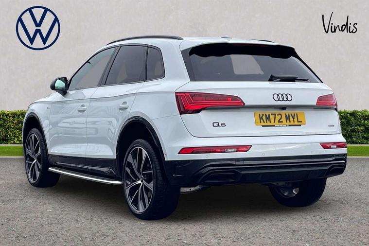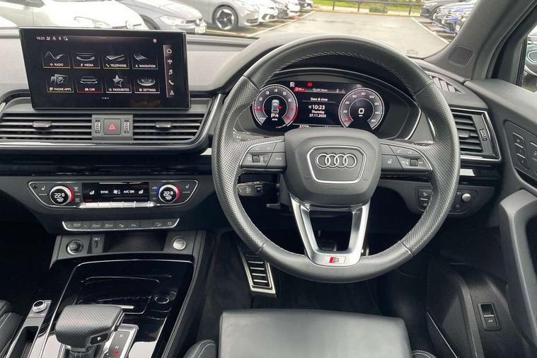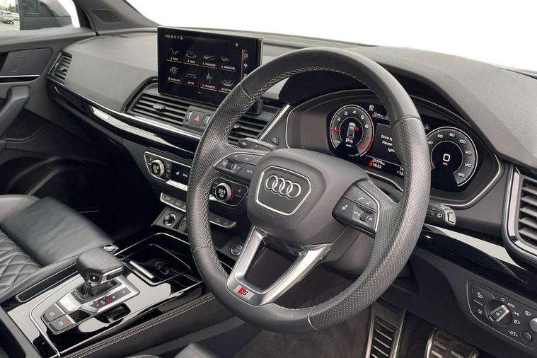 360 degree camera with top view, Advanced key with electric hands free boot opening system, Audi connect safety and service (e-call), Audi connect with Amazon Alexa Integration, Audi drive select, Audi Phone Box with wireless charging - Qi enabled compatible phone and additional bluetooth interface, Audi virtual cockpit plus with 12.3" screen and three different layout designs, Audi wireless smartphone interface, Automatic start-stop system with coasting functionality and efficiency programme, Electro - mechanical power assisted steering, Head up Display, MMI navigation plus with 10.1" touch screen, Mobile telephone preparation - bluetooth interface, Park assist with parking aid plus, Power tailgate, Service interval indicator, Voice control system with Audi hotword activation "Hey Audi", Adaptive air suspension, Quattro on demand, Bang + Olufsen sound system, DAB Digital radio, 3rd brake light, Acoustic windscreen, Audi beam with 'Vorsprung' logo, Audi matrix LED headlights with OLED rear lights + dynamic front and rear indicators, Auto dimming door mirrors, Auto dimming rear view mirror, Automatic headlight adjustment, Automatic headlights and windscreen wipers, Black roof rails, Body colour bumpers, Body colour underbody protection, Chrome plated exhaust trims, Daytime running lights, Door sills in Selenite silver, Electric adjustable/heated/folding door mirrors, Front air inlet surrounds in titanium black, Front and rear electric windows, Gloss black finish for Audi rings and Q5 logos without engine badging, Headlight washers, High gloss black B pillar trims and triangular rear door trim, Lower bumpers painted in contrast Manhattan grey, Matrix LED headlights with dynamic front and rear indicators, Panoramic sunroof, Rear chrome trim strip below lights, Rear privacy glass and rear side windows, Rear side wing doors, Rear wiper, Roof bars, Running boards, S Line rear spoiler, 2 x USB charging port with aux input socket, 3 rear headrests, 3 spoke heated leather multi-function steering wheel, 4 way electric lumbar support for driver and front passenger, 40:20:40 split folding 3 rear bench seat in 2nd row with rear centre armrest, Black cloth headlining, Comfort front centre armrest, Contrast stitching on seats, steering wheel and gear lever gaiter, Deluxe 3 zone electronic climate control, Electrically adjustable front seats with driver memory, Fine Nappa leather upholstery with diamond pattern contrast stitching + front sport seats with S embossed logo, Front/rear floor mats, Gear lever in black leather, Heated front and outer rear seats, Height adjustable front head restraints, Illuminated door sill trims with aluminium inlays, ISOFIX child seat mounting and top tether, Luggage compartment cover, Massage function for front seats, Rear seat bench plus, Removable luggage compartment floor, Single front passenger seat, Stainless steel pedals, Sunvisors with vanity mirrors, Tool kit, Black styling package - Q5, City Assist pack - Q5, Extended interior upholstery pack - Q5, Extended LED Interior multi coloured Lighting Pack - Q5, Tour pack - Q5, 3 point seatbelts on all seats, 6 airbags - Driver, front passenger, curtain and side airbags, Electrically operated child locks on rear doors, Electromechanical parking brake, Electronic stabilisation control including ABS, ASR and EDL, Front passenger airbag deactivation, Hill descent control, Hill hold assist, Multi collision brake assist, Pop-up bonnet for pedestrian protection, Pre sense city, Seat belt force limiter, Seatbelt monitoring, Tyre pressure warning, Warning triangle and first aid kit, Anti theft alarm, Anti-theft wheel bolts, Keyless Go access/ignition system, Remote central locking, Piano black finish inlay, Tyre repair kit,