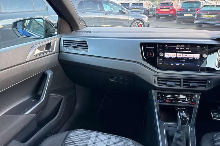 Adaptive cruise control with follow-to-stop and speed limiter, Advanced driver attention and drowsiness monitor, Bluetooth mobile phone interface, Digital Cockpit Pro with 10.25" Display, Dynamic road sign display, Emergency call service, Multifunction camera, Power assisted speed sensitive steering, Preparation for We connect and We connect plus, Speedo and rev counter, electronic odometer, trip, service interval display and fuel gauge, Standard rear axle, Travel Assist - Lane keeping system and traffic jam assist, Travel assist including emergency assist, Trip computer, Warning signal and warning light for front and rear seatbelts not fastened, Washer fluid level indicator, Wireless app connect, Front wheel drive, Rear shock absorpion, Start-stop system with battery regeneration (recuperation - energy recovery during braking), DAB Digital radio, Diversity antenna for FM reception, Front and rear 6 speakers, Body colour bumpers, Body colour door handles, Electric front windows, Front scuff plates with Black edition logo, Heat insulating glass windscreen, Power folding adjustable/heated exterior mirrors and front passenger exterior mirror lowering function, Rear electric windows, Rear fog light, Rear side wing doors, Rear windscreen washer and wiper with interval delay, Third brake light, 12V power socket in centre console, 2 USB-C ports in the front, 2 USB-C charging sockets on the center console in the rear, 3 rear head restraints, 60/40 split folding rear seat and rear seat bench not split, Air care climatronic air conditoning system with active combination filter and 2-zone temperature control, Black roof lining, Carpet mats, front and rear, Chrome plated radiator grille inserts, air vent surrounds and light switch surrounds, Door and side trim panel, Driver and front passenger seat height adjustment, Driver/passenger sunvisors with illuminated vanity mirrors, Front centre armrest, Front footwell illumination, Front seat backrest storage pockets, Front sports comfort seats, Handbrake lever handle in leather, Headliner in recycled material, Heated front seats, Isofix child seat preparation easy-fit (for two outer rear seats, and front passenger seat) compatible with I-size, Karoso artvelours cloth upholstery, Leather trimmed gear knob, LED interior light with switch off delay and dimmer, 2 reading lights front and rear, Luggage compartment cover, Luggage compartment floor, Luggage compartment lighting, Lumbar adjustment for front seats, Single front passenger seat, Stainless steel pedals, Standard pedal cluster, Three spoke leather wrapped multifunction steering wheel with shifting paddles, Black roof pack - Polo, IQ LED matrix headlights pack - Polo, Light and sight pack - Polo R-Line/Black Edition, 3 point height adj front seatbelts + pretensioners, 3x3 point rear seatbelts, ABS, Driver and front passenger airbag with front passenger airbag deactivation, Drivers and front passengers safety optimised head restraints, ESC (Electronic stability control) + EDL (Electronic Differntial lock) and ASR (Traction control), Extended and predictive pedestrian/ cyclist protection, Front curtain and side airbags with center airbag, Front/rear disc brakes, Hill hold control, Manual child lock in rear doors, Single tone horn, Tyre pressure loss indicator, Alarm with interior protection, Anti-theft alarm system with interior monitoring, backup horn, and towing protection, Anti-theft wheel bolts, Electronic engine immobiliser, Black dashboard, Chrome applications on rotary light, mirror adjustment, window regulator switches, outlet with frame in black, Dark grey anodised matt decorative inserts in dash and front door panels, 17" York alloy wheels, Low rolling resistance tyres,