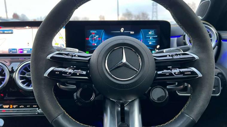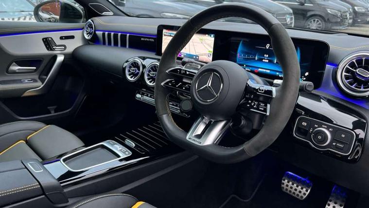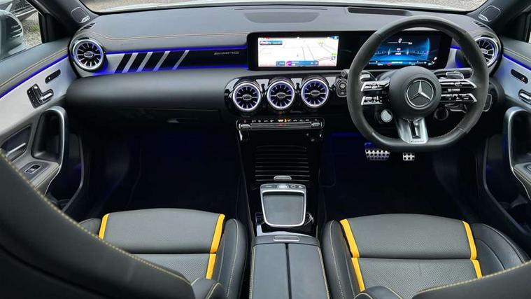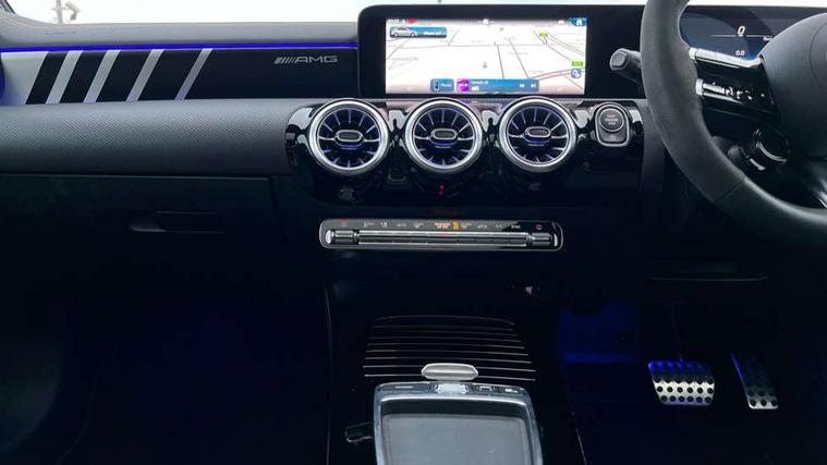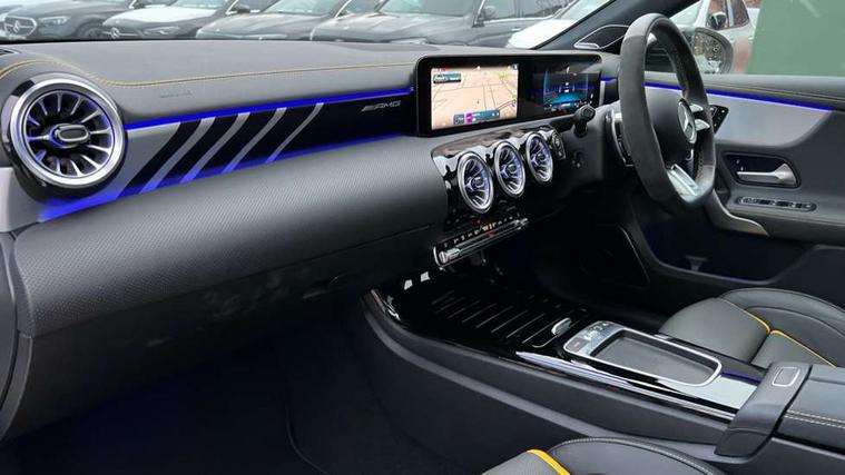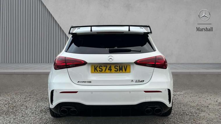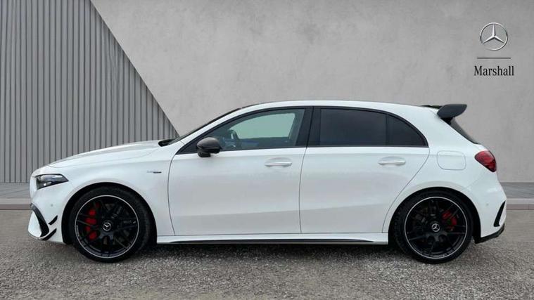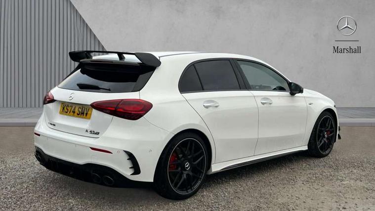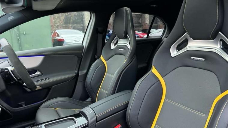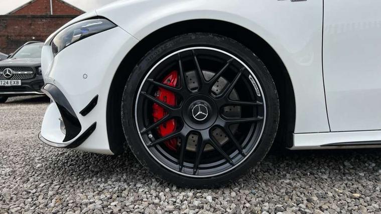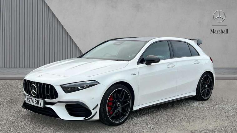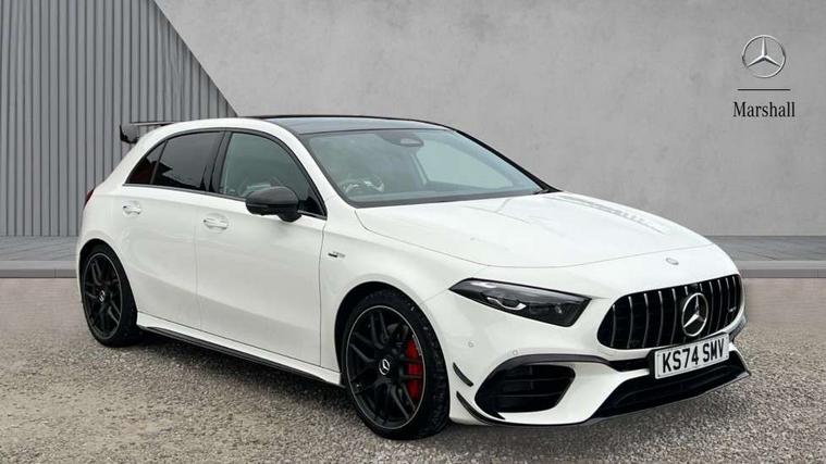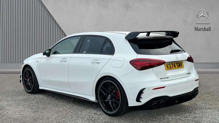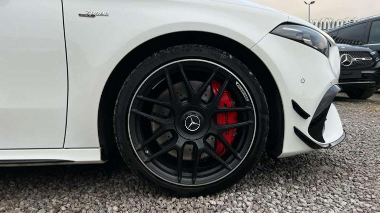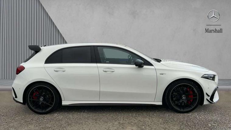 10.25 inch touchscreen central media display with AMG specific, AMG start up logo, visualisation of the AMG drive programs, vehicle and engine data, 10.25" Digital instrument cluster display screen, AMG DYNAMIC SELECT with drive modes(Slippery, Comfort, Sport, Sport+, Individual and Race) incl drift mode via steering wheel shift paddles+Race Start, AMG menu with sporty additional information - Gear indicator with yellow M symbol manual mode, Warm Up menu and Set Up menu, AMG speed sensitive steering with two sets of steering characteristics, Attention assist, Brake pad wear indicator warning light, Car wash mode, Direct steering, Dual bluetooth interfaces, ECO start/stop function, Engine start/stop button, Fingerprint scanner, Fluid level warning indicator for fuel, oil, coolant and washer fluid, Fluorescent jacket for driver, Hard-disk navigation, Head up Display, Hey Mercedes Voice activation, Lamp failure indicator, MBUX augmented reality for navigation, MBUX Interior assistant, Mercedes me connect including emergency call system, accident recovery, breakdown and maintenance management, Mercedes me remote services, Outside temperature gauge, Owners manual in English, Pre-installation of private car share, Preinstallation for Mercedes Benz link, Remote boot closing, Service indicator (ASSYST), Smartphone integration with Apple CarPlay and Android auto, Speed sensitive power steering, Tailgate, Traffic sign assist, Trip computer in multifunction display with current consumption indicator, Wireless charging, AMG performance 4MATIC+ with torque control, AMG suspension including AMG specific axles and sporty spring/damper setup, Suspension with adaptive damping system, Burmester surround sound system (590W) with Dolby atmos, speakers - 1 center+4 doors+2 in C pillars, tweeter, subwoofer, DSP amp, burmester lettering, DAB Digital radio, MBUX multimedia system, 4 Electric Front and Rear windows, Adaptive brake lights, AMG A45 S bodystyling -rear apron, four vertical fins, side sill panels, roof spoiler lip, specific front apron, diffuser look and S label on boot lid, AMG real performance exhaust sound system, AMG specific radiator grille in high gloss chrome with AMG lettering, Beltline strips in High gloss Black, Body colour bumpers, Body colour door handles with chrome inserts, Body colour side skirt, Electric adjustable and heated door mirrors with integrated LED side indicators, Headlamp assist automatic headlamp activation, Heat insulating dark tinted rear and rear side windows, Heated glass rear windscreen + timer control, LED daytime running lights, LED High level third brake light, LED tail lamp, Multibeam LED headlamps with adaptive highbeam assist and cornering function, Panoramic sliding sunroof, Privacy glass, Radio aerial, Rain sensing windscreen wipers with two sensitivity settings, Rear fog lights, Rear side wing doors, Rear windscreen wiper, Surround lighting with logo projection, Two round twin tailpipe trim elements each measuring 90 mm in diameter and AMG lettering plus ribbing on the inside of the pipe, Valve control dependent on drive program, Wider wheel arches for AMG wheels, Window line trim strip in black, 3 seat bench in 2nd row, 3 Spoke flattened lower section sporty design AMG Performance steering wheel in nappa leather/microcut microfibre, 40:20:40 split folding rear seats, Air conditioning - Two zone thermotronic luxury automatic climate control with display, AMG brushed stainless steel sports pedals with rubber studs, AMG centre console finished with trim in silver chrome, AMG floor mats, AMG performance seats, AMG sporty centre console with raised front section and integral control switched for manual transmission mode, AMG steering wheel buttons, Automatic child seat recognition sensor, Black air vents with surround in silver chrome, Black roof lining, Electrically adjustable front memory seats including lumbar support and backrest inclination, Front centre armrest with stowage, Front seat head restraints, Height/reach adjustable steering column, Illuminated AMG front door sills with changeable cover, Interior lighting - 64 colour Ambient lighting, Interior mirror with reading lamps in black and frameless, Rear armrest with 2 cupholders, Rear head restraints, Seat occupancy sensor for front passenger seat, Silver coloured aluminium gear shift paddles on steering wheel, Single front passenger seat, Stowage compartment in centre console with retractable cover, Sunvisors with illuminated vanity mirrors, Twin front cupholders, Aerodynamic pack - A Class, AMG Driver's pack - A Class, AMG night pack - A Class, AMG performance high-end seat pack - A Class, Light and sight package - A Class, Mirror package - A Class, Multi-contour seat pack - A Class, Parking pack with 360 degree camera - A Class, Seat comfort pack - A Class, USB pack plus - A Class, Winter pack - A Class, 3 rear 3 point seatbelts, 3 stage electronic stability programme, ABS with Brake Assist, Active bonnet, Adaptive brake assist with hold function and hill start assist, AMG high performance brake system with red painted brake callipers and black AMG lettering at the front, ventilated and perforated brake discs, Black seatbelts, Bonnet with power domes, Childproof locks manually operated for rear doors and electrically operated for rear power windows, Crash responsive emergency lighting, Driver and passenger head and side airbags, Drivers knee airbag, Dual stage driver/passenger airbags, Electronic parking brake, ESP curve dynamic assist, ESP with ASR, Exit warning, Front and rear seatbelt reminder, ISOFIX and top tether child seat fixing points in two outer rear seats, Tyre pressure monitoring system, Warning triangle and first aid kit, Window airbags, Alarm system/interior protection/immobiliser, Guard 360 degree vehicle protection, Keyless entry lock/unlock, Keyless Go, Remote central locking and crash sensor with emergency opening function, Aluminium AMG design black/silver interior trim, 19" AMG