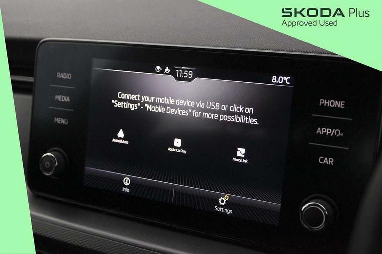 Bluetooth system, E-call, Front assist system, PAS, Service indicator, Speed limiter, Wireless Smartlink for Apple CarPlay (wired for Android Auto), 8 Speakers, Auxiliary input socket, DAB Digital radio, Body colour bumpers, Body colour door mirrors and handles, Chrome grille surround, Dimming rear view mirror with black surround, Electrically adjustable and heated door mirrors, Front and rear electric windows, Headlight range control, Heated rear window, LED rear lights - low functionality, LED third brake light, Light sensors, Rain sensor, Rear fog lights, Rear side wing doors, Rear wiper, 12V Accessory socket in centre console, 3 seat bench in 2nd row, Chrome inner door handles, Cloth upholstery, Front head restraints, Glove compartment with illumination, Ice scraper, Isofix child seat fittings on outer rear seats, ISOFIX on front passenger seat, Manual lumbar support for front seats, Rake/reach adjustable steering wheel, Reading lights, Single front passenger seat, Sun visors with illumination on front passenger, Textile floor mats, Third rear headrest, Top tether for front passenger seat, Umbrella in driver's door, 3x3 point rear seatbelts, Airbags - driver and front passenger, ESP, Front passenger airbag deactivation switch, Front side airbags with curtain airbags, Hill hold control, Manual parking brake, Manual rear child locks, One tone horn, Rear disc brakes, Seatbelt reminder for driver an co-driver, Traction control, Tyre pressure monitor, Anti-theft alarm system with interior monitoring, backup horn, towing protection and remote central locking with SAFE system, Anti-theft wheel bolts, Electronic engine immobilizer,