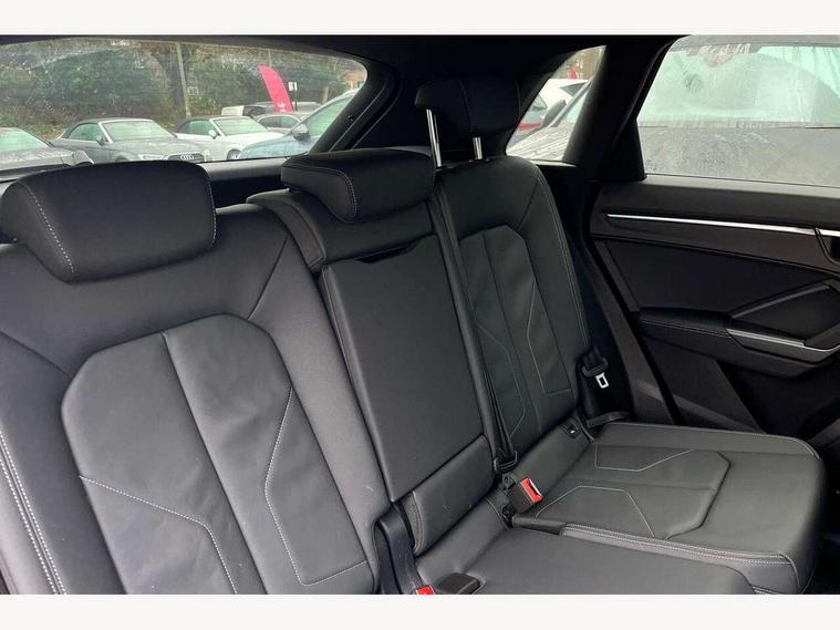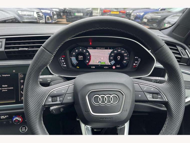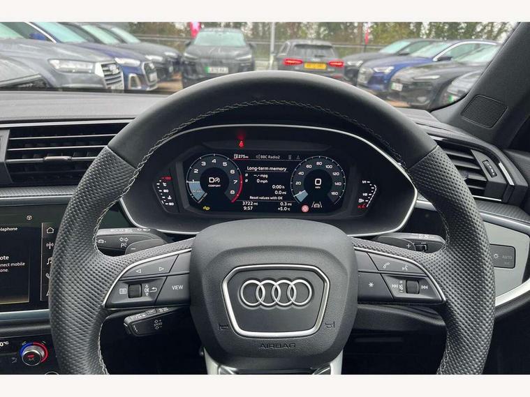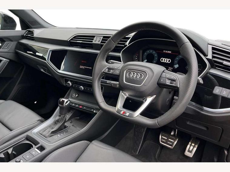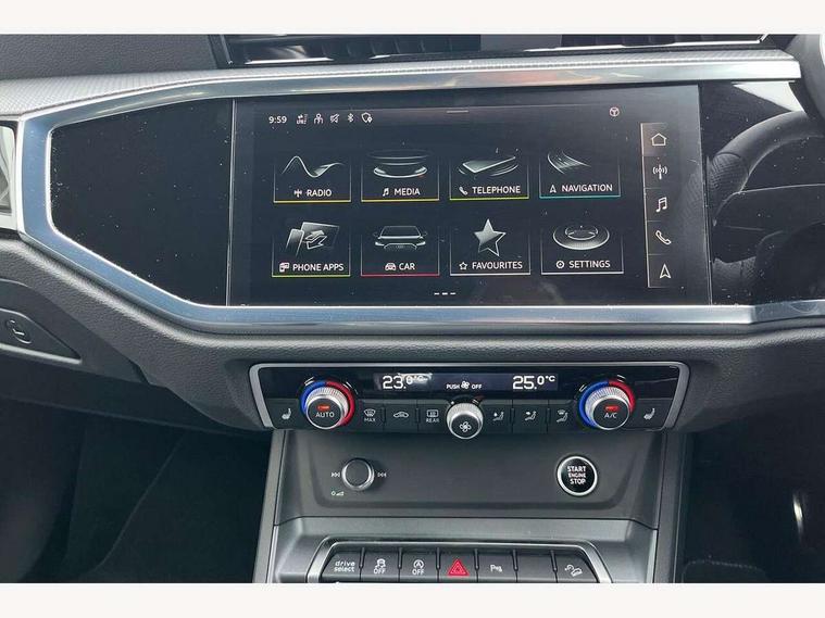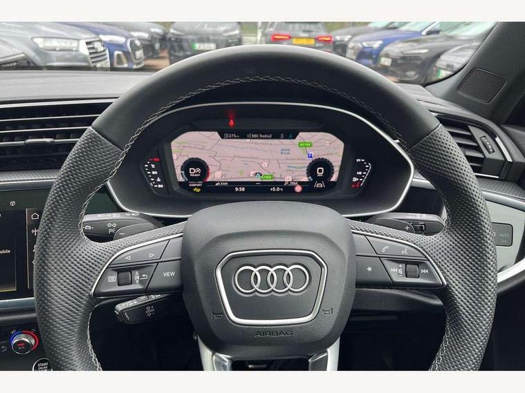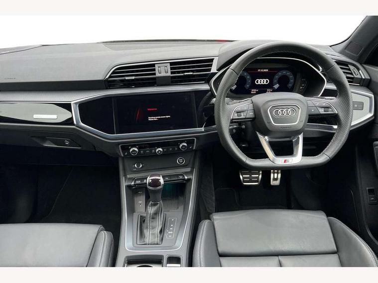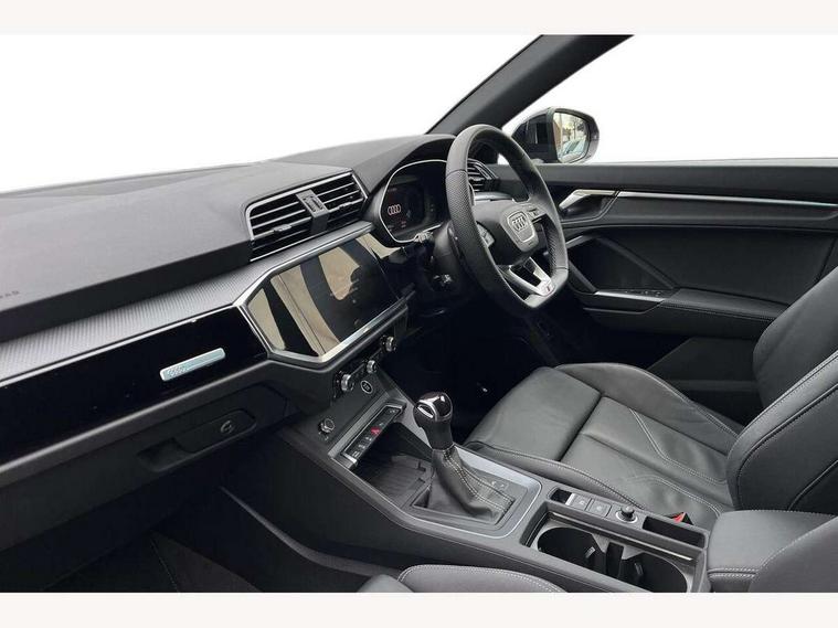Amazon alexa Integration, Audi connect safety and service, Audi drive select, Audi lane departure warning, Audi Virtual Cockpit - 10.25" display, Bluetooth interface, Camera based traffic sign recognition, Distraction and Fatigue warning, Legal emergency call, MMI Navigation Plus with high resolution 10.1 inch touchscreen colour display, Power operated tailgate, Progressive steering, Service interval indicator, Smartphone interface includes wireless Apple carplay/Android Auto, Start stop system with recuperation, Voice control system with natural language interaction, Sports suspension, 2 USB-C ports with charge and data functions, 6 passive loudspeakers, DAB digital radio module, Acoustic windscreen, Audi Beam uses LEDs to project the Audi logo onto the ground as you exit your Q3, Auto dimming door mirrors, Auto dimming frameless rear view mirror, Black roof rails, Electrically folding, adjustable and heated door mirrors with integrated LED side indicators and kerb view function for passenger side, Front and rear electric windows, Front fog lights, Grille vertical bars in aluminium silver/Matt, High gloss black finish B and C pillars, LED Dynamic rear indicators, LED headlights with LED daytime running lights, LED rear lights, LED third brake light, Privacy glass dark tinted rear and rear-side windows (from B-pillar backwards), Rain and light sensors, Rear diffuser grille in grained matt black, Rear diffuser strip in matt anthracite black, Rear side wing doors, Rear wiper, S line bumpers in contrasting Manhattan grey, Variable front intermittent wipers, 12V socket in rear centre console, 3 seat bench in 2nd row, 40:20:40 folding with manual adjustment for 60:40 forwards/backwards position and backrest angle, Adjustable rear seat bench/backrest with centre armrest and cupholder, Black cloth headlining, Dual zone electronic climate control, Electric lumbar support, Front and rear black floor mats with contrast stitching in rock grey, Front and rear headrests, Front centre armrest, Height and reach adjustable steering wheel, Illuminated door sill trims with S logo, ISOFIX child seat mounting for front passenger with airbag deactivation and outer rear seat including top tether attachment point for outer rear seats, Manual front seats with height adjustment, Perforated leather gearknob, Single front passenger seat, Stainless steel luggage compartment sill finisher, Stainless steel pedals, Twin leather upholstery with front sport seats + S embossing, Black styling pack - Q3, Non smoking pack - Q3, 3x3 point rear seatbelts, 6 airbags - Driver, front passenger, curtain and side windows, Audi pre-sense front with pedestrain and cyclist recognition, Electrically operated child locks on rear doors, Electromechanical parking brake, Electronic stabilisation control including ABS, ASR and EDL, Front seatbelt reminder, Hill descent control, Hill hold assist, Pre sense basic, Seatbelt monitoring, Tyre pressure warning, Warning triangle and first aid kit, Anti theft wheel bolts, Immobiliser, Remote central locking, Thatcham approved category 1 anti theft alarm, Aluminium look interior elements, Detail dashboard around MMI touch colour display in glass look, black with surround in aluminium look, Leatherette door armrest, Piano black inlay,