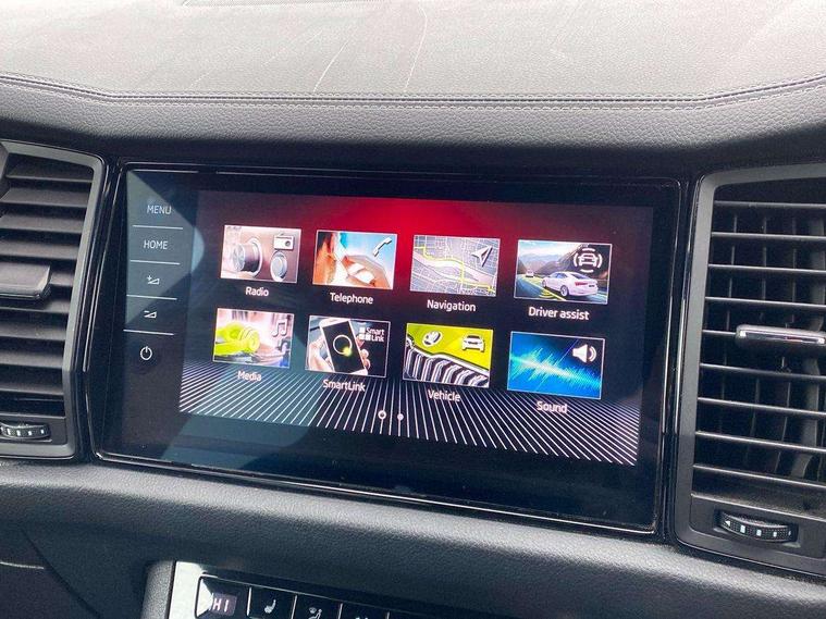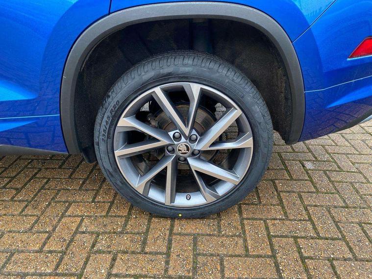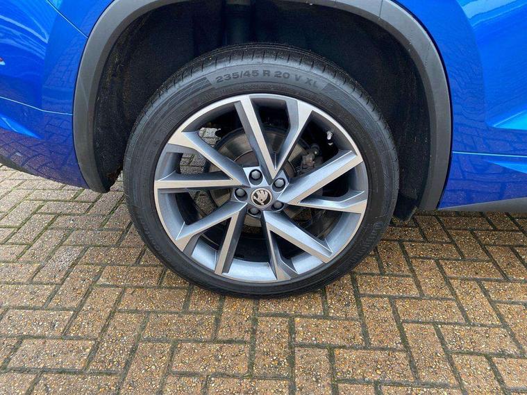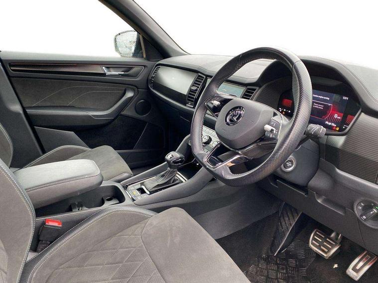 Bluetooth system, Columbus satellite navigation with 9.2" touchscreen, integrated Wi-Fi, web radio, Digital voice enhancement, e call+, ECO Stop/start function, Exterior temperature indicator, Progressive steering, Rear view camera, Smartlink wireless for apple carplay and wired for android auto, Speed limiter, USB C Port x 2 in front centre console, Virtual Cockpit - 10.25" digital display with additional sports design, Wireless charging, 8 speakers, DAB Digital radio, Aero front windscreen wipers with intermittent function, Aero rear window wiper, Auto dimming rear view mirror, Black roof rails, Black sports styling including front grille and window surrounds, Black wheel arch surrounds, Body colour bumpers, Body colour door handles, Electric adjustable/heated/folding door mirrors, driver side auto dimming with boarding sports and memory function, Electric front and rear windows, Extended rear spoiler with finlets in gloss black, Front fog lights, Full LED matrix headlights with AFS (adaptive front light system), cornering function and AWL (all weather lighting system), Gloss black door mirrors, Headlight washers, Heated rear window, Invisible tailpipe, LED daytime running lights, LED rear fog light, LED third brake light in rear spoiler, Light assistant (coming/leaving home/tunnel light), Off-road style lower front bumper element, Privacy glass, Rain and light sensors, Rear diffuser, Rear LED lights (high functionality) with welcome effect and dynamic indicators, Rear side wing doors, Safety reflectors on front and rear doors, Sportline badge on front fender, Sports front and rear bumpers including lower rear chrome strip, Tailgate lettering in Black, Window control switches with black trim, Without engine designation, 12V socket in boot, 2 rails with 2 hooks, 2 seat bench in 3rd row, 3 seat bench in 2nd row, 4 foldable roof handles with rear coat hooks, 60:40 foldable rear seat with sliding adjustment and backrest angle adjustment, Aluminium pedals, Black roof headlining, Bottle holders in door panel in the 1.5 litre front and 1 litre rear, Cargo storage compartments, Chrome headlight control button, Chrome interior door handles, Coat hooks on B pillar, Covered storage compartment on driver side, Decorative door sill covers, Front centre armrest with storage compartment, cup holder and 12V socket, Front courtesy lights, Gear shift lever with chrome frame and black gloss insert, Grey stitching in front and rear armrests and door armrests + door inserts, Height adjustable front headrests, Illuminated and cooled glovebox, Illuminated luggage compartment, Isofix child seat fittings in outer rear seats with top tether, Manually adjustable steering column, Microsuede door panels, Net programme in boot (1x horizontal Net, 2x vertical Nets), Overhead glasses storage compartment, Pollen filter, Rear centre armrest with cupholders, Single front passenger seat, Sliding trunk cover, Small Bags on the inner sides of the front backrests, Sports seats, Sunvisors with illuminated vanity mirrors, Three rear height adjustable headrests, Ticket holder on A Pillar, Umbrella in door panel, Variable boot floor, LED Interior light pack - Kodiaq, Auto door release and activation of warning lights, Child locks on rear doors, Driver and front passenger airbag with knee airbag and front passenger airbag deactivation, Electronic parking brake with hill start assist, Emergency rear braking signal, ESC (incl. ABS+MSR+ASR+EDS+HBA+DSR+RBS+MKB), Front assist with autonomous emergency braking, Front side airbags with curtain airbags, Fuel cut off safety device, Height adjustable front 3 point seatbelts + pretensioners, Hill hold control, Rear disc brakes, Safety vest holder in door, Seat belt reminder for all seats, Tailgate unlocking from outside, Three point rear seat belts, Two tone horn, Tyre pressure monitor, Alarm with interior monitoring and tilt sensor with safe function, Anti-theft wheel bolts, Immobiliser, Keyless entry and start system (KESSY), Remote central locking with 2 keys, Black air vent surround, Carbon finish dashboard and door inserts, Grey stitching in dashboard, 20" Vega Anthracite alloy wheels, Temporary spare wheel (space saver),