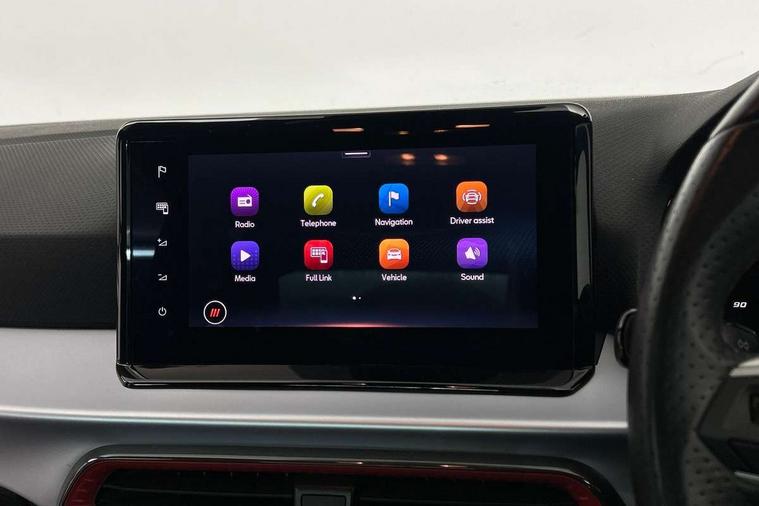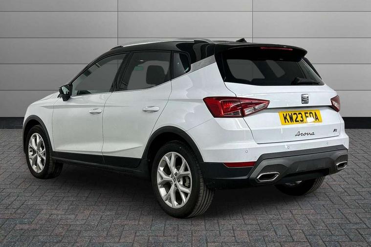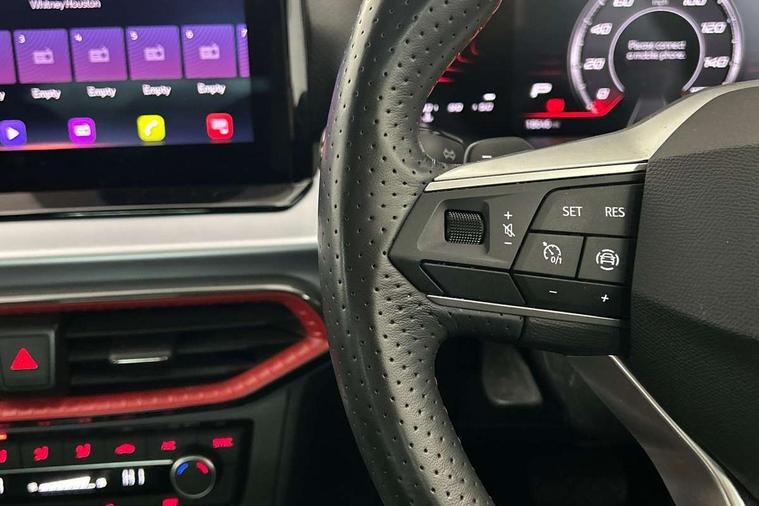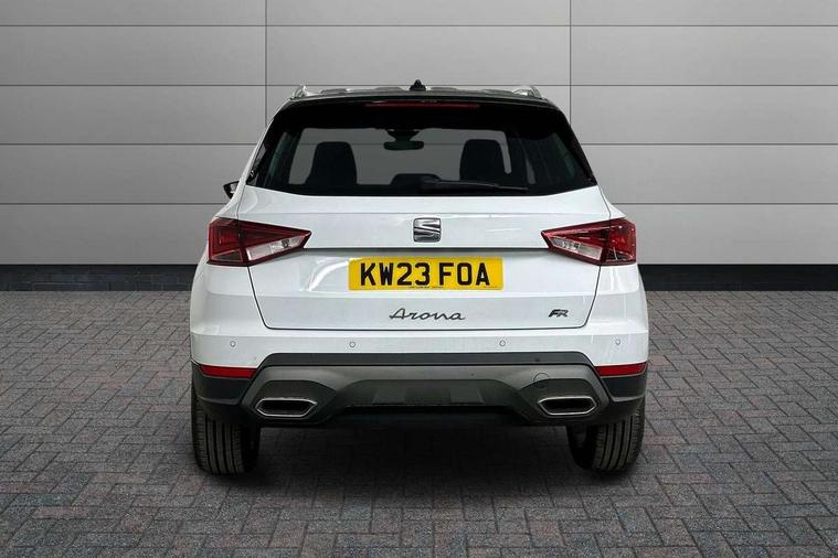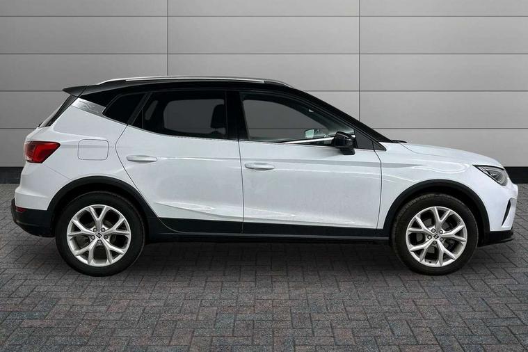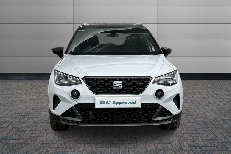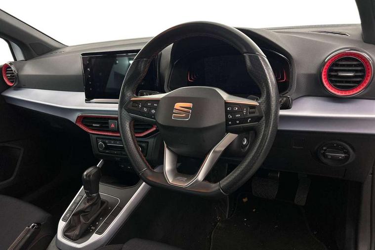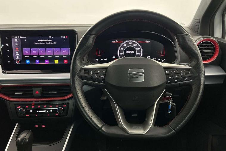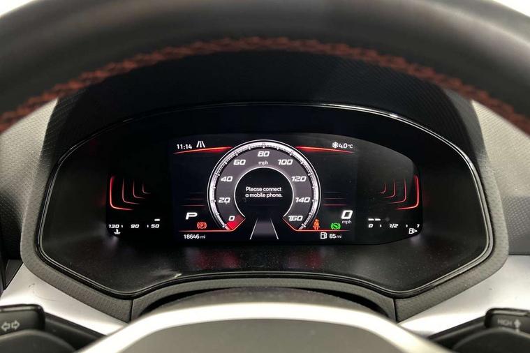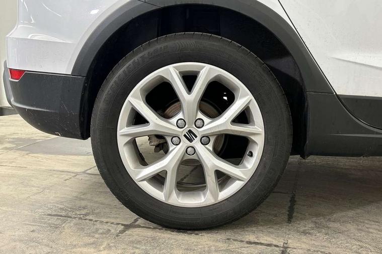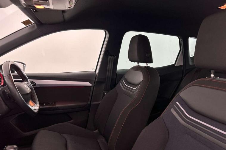 'Lights On' Reminder warning buzzer, 8" Digital cockpit, Digital clock, E-call, Electric speed sensitive power steering, Full Link Smartphone Integration with Mirror Link, Apple Car Play, Google Android Auto with USB Type C cable for Apple and Android compatibility, Lane keeping system, Low fuel warning light, Outside temperature display, Rear parking sensor, RPM counter, Seat connect with safety, service, remote and online, SEAT Drive profile - Four different models normal-sport-eco-individual, steering response, throttle response and gear shifts mode, Trip computer, Wireless phone charger, 9.2" colour touchscreen with navigation system, voice control and USB port (type c), Bluetooth interface for hands free and audio streaming, DAB digital radio and AM/FM radio, Steering wheel mounted audio controls, Anti theft roof antenna, Auto dimming interior rear view mirror, Automatic activation of hazard warning lights, Body coloured bumpers, Body coloured door handle inserts, Chrome roof rails and window surrounds, Dark tinted rear windows, Electric front/rear windows, Electrically adjustable, heated and folding door mirrors, Front fog lights with cornering function and rear fog light, FULL LED automatic headlights with dynamic headlight range control, coming and leaving home, LED daytime running lights, LED rear tail lights and licence plate lights, Protective side mouldings, Rain sensing wipers, Rear side wing doors, Rear spoiler, Rear window wash/wipe, Roof colour door mirrors, Third brake light, Twin exhaust pipe styling hidden exhaust pipe, Visible VIN plate, Windshield wiper with intermittent control and potentiometer, 2 cupholders, 3 seat bench in 2nd row, 60/40 split folding rear seat, Aircare filter, Black interior roof, Cloth upholstery, Double boot floor, Driver sunvisor with covered mirror + card holder, Dual zone climate control, Front courtesy light with 2x front and 2x rear reading lights, Front sport seats, Gear shift indicator, Height adjustable front seats, Height/reach adjustable steering column, Illuminated boot, Instrument lighting with brightness control, Interior ambient lighting, Interior light in footwell, central console and door panel, ISOFIX points in outer rear seats with top tether anchorage points, Passenger sunvisor with vanity mirror, Perforated flat bottomed leather steering wheel/gear knob/handbrake with red stitching and FR logo, Single front passenger seat, Steering wheel mounted gearshift paddles, Two front and three rear height adjustable headrests, Interior chrome pack - Arona, 3 point seatbelts on all rear seats, ABS, Active front headrests, Child locks on rear doors, Driver and front passenger airbags with front passenger airbag de activation, front side and curtain airbags, Electronic stability control, Emergency Brake Assist (EBA) and front assist, Front and rear seatbelt reminder, Hill hold control, Multi-Collision braking, Tiredness recognition system, Traction control, Tyre pressure monitoring system, Alarm with back-up horn, Electronic engine immobiliser, Locking wheel bolts, Remote central locking + deadlocks, Tow away protection, Titan black dashboard, 17" Dynamic alloy wheels,