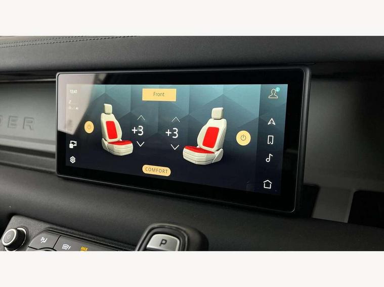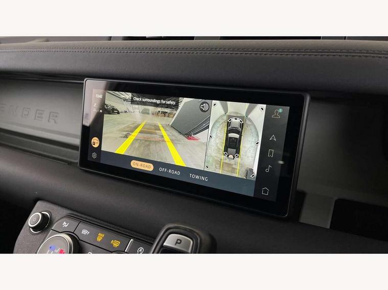 360 degree parking aid, 3D Surround Camera with 360 View, 180 Rear View, Front Traffic Detection, Forward Vehicle Guidance, Tow Hitch Assist and clear sight Ground View, Adaptive cruise control, Android Auto, Apple CarPlay, Assisted tailgate with soft close, Blind spot assist, Bluetooth system, Brake pad wear indicator, Clear exit monitor, Connected navigation pro, Driver condition monitor, Electric power assisted steering (EPAS), Interactive driver display, Lane keep assist, Push button start, Rear traffic monitor, Traffic sign recognition with adaptive speed limiter, Trip computer, Wade Sensing, 8 speed automatic transmission, Adaptive dynamics, All wheel drive system, Twin speed transfer box, DAB Radio (Digital Audio Broadcasting), Meridian 400w sound audio system with 11 speakers and subwoofer, Pivi pro connected, Automatic headlight levelling, Automatic headlights, Black exposed rear recovery eyes, Centre high mounted stop light, Electric heated/power fold door mirrors with approach lights and auto dimming driver side, Electric windows with one touch open/close and anti-trap, Follow me home lighting, Heated rear window with timer, Heated windscreen, LED tail lights, Privacy glass, Puddle lights, Rain sensing windscreen wipers, Rear fog lights, Rear side wing doors, Rear wiper, Side hinged tailgate, Trailer stability assist, X-Dynamic badge, 12V power socket in loadspace, 2 seat bench in 3rd row, 3 seat bench in 2nd row, Alpine lights, Configurable cabin lighting, Durable rubber cabin flooring, Durable rubber loadspace flooring, Footwell lights, Front passenger isofix child seat attachment, Loadspace cover, Loadspace Hook, Multifunction steering wheel, Overhead stowage for sunglasses, Premium cabin lighting, Rear headrests, Rear ISOFIX, Rear reading lights, Single front passenger seat, Storage glovebox, Sunvisors with illuminated vanity mirrors, Online pack with data plan - Defender, 7 three point seatbelts, ABS, Brake hold function, Cornering brake control (CBC), Customer configurable autolock, DSC - Dynamic Stability Control, EBD - Electronic brakeforce distribution, Electric parking brake (EPB), Emergency brake assist, Emergency braking, ESP + traction control, Front airbags with passenger seat occupant detector, HDC - Hill descent control, Hill launch assist, Low traction launch, Power operated child locks, Remote for (e-Call, Optimised assistance call, InControl app, Climate, beep and flash and door), RSC - Roll stability control, Seat belt reminder, TPMS (Tyre pressure monitoring system), Alarm, Immobiliser, Intrusion sensor, Keyless entry, Locking wheel nuts,