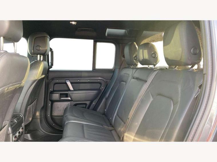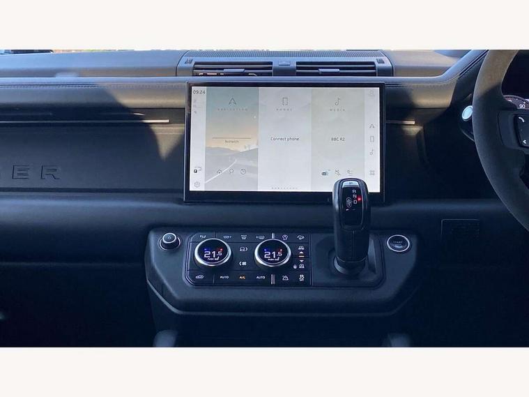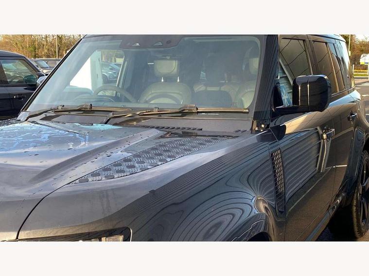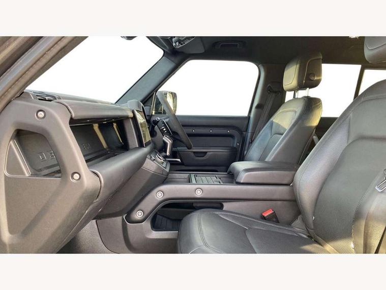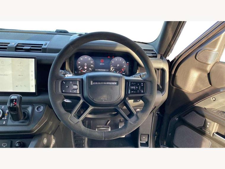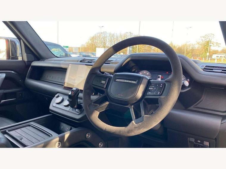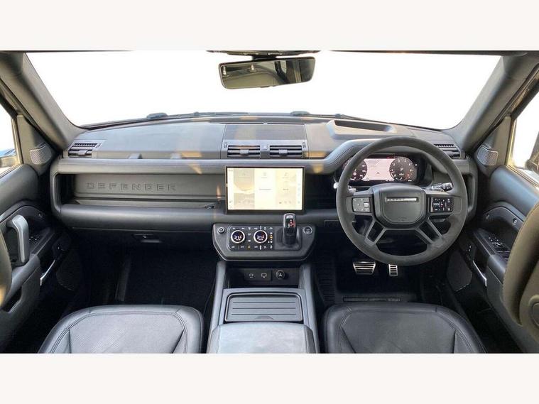 11.4" touchscreen, 360 degree parking aid, 3D Surround Camera with 360 View, 180 Rear View, Front Traffic Detection, Forward Vehicle Guidance, Tow Hitch Assist and clear sight Ground View, Adaptive cruise control, Android Auto, Apple CarPlay, Assisted tailgate with soft close, Blind spot assist, Bluetooth system, Brake pad wear indicator, Clear exit monitor, Connected navigation pro, Driver condition monitor, Electric power assisted steering (EPAS), Garage door opener (Homelink), Head up Display, Interactive driver display, Lane keep assist, Push button start, Rear collision monitor, Rear traffic monitor, Traffic sign recognition with adaptive speed limiter, Trip computer, Wade Sensing, Wireless device charging with phone signal booster, Adaptive dynamics, All terrain progress control, Configurable Terrain Response, Electronic active differential with brake torque vectoring, Electronic air suspension, Terrain Response 2 with dynamic program, DAB Radio (Digital Audio Broadcasting), Meridian 700w surround sound audio system with 15 speakers, Pivi pro connected, Advanced tow assist, Automatic headlight levelling, Automatic headlights, Black exposed rear recovery eyes, Centre high mounted stop light, ClearSight interior rear view mirror, Darkened LED tail lights, Electric heated/power fold door mirrors with approach lights and auto dimming driver side, Electric windows with one touch open/close and anti-trap, Electrically deployable towbar, Follow me home lighting, Front fog lights, Headlamp power wash, Heated rear window with timer, Heated washer jets, Heated windscreen, Illuminated metal treadplates with V8 branding, Less roof rack or roof rails, Privacy glass, Puddle lights, Quad outboard mounted exhaust pipes, Rain sensing windscreen wipers, Rear fog lights, Rear side wing doors, Rear wiper, Signature graphic (with interior storage), Sliding panoramic roof, Solar attenuating windscreen, Trailer stability assist, V8 badge, 12V power socket in loadspace, 14 way heated and cooled electric adjustable memory front seats with 4 way manual headrests, 3 seat bench in 2nd row, 40:20:40 folding, heated rear seats with centre armrest, Air quality sensor, Bright metal pedals, Cabin air ionisation with PM2.5 filter, Domestic plug socket, Durable rubber cabin flooring, Durable rubber loadspace flooring, Ebony morzine headlining, Electric cabin pre conditioning, Electric reach + rake adjustable steering column, Extended leather upgrade, Footwell lights, Front centre console refrigerator compartment, Front passenger isofix child seat attachment, Heated steering wheel, Leather gearshift, Loadspace cover, Loadspace Hook, Multifunction steering wheel, Overhead stowage for sunglasses, Premium cabin lighting, Rear headrests, Rear ISOFIX, Rear reading lights, Satin chrome gearshift paddles, Single front passenger seat, Storage glovebox, Suedecloth steering wheel, Sunvisors with illuminated vanity mirrors, Three-zone Climate Control with Rear Cooling Assist, Twin front cupholders with cover, Online pack with data plan - Defender, 5 x 3 point seatbelts, ABS, Brake hold function, Cornering brake control (CBC), Cross car beam in satin black powder coat brushed finish, Customer configurable autolock, Driver and passenger airbags, DSC - Dynamic Stability Control, EBD - Electronic brakeforce distribution, Electric parking brake (EPB), Emergency braking, ESP + traction control, Front airbags with passenger seat occupant detector, HDC - Hill descent control, Hill launch assist, Low traction launch, Power operated child locks, Remote for (e-Call, Optimised assistance call, InControl app, Climate, beep and flash and door), RSC - Roll stability control, Seat belt reminder, TPMS (Tyre pressure monitoring system), Activity key, Alarm, Immobiliser, Intrusion sensor, Keyless entry, Locking wheel nuts, Robustec veneer,