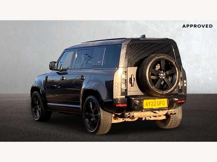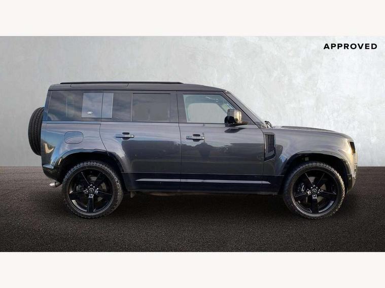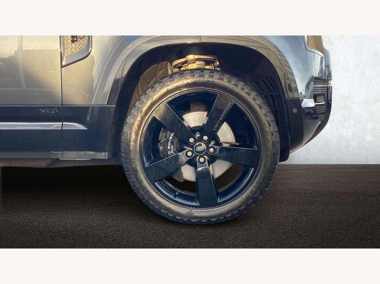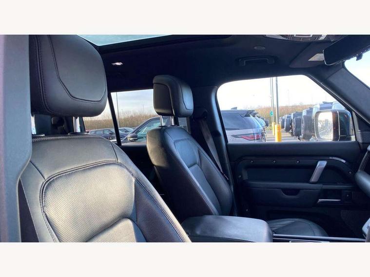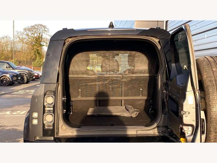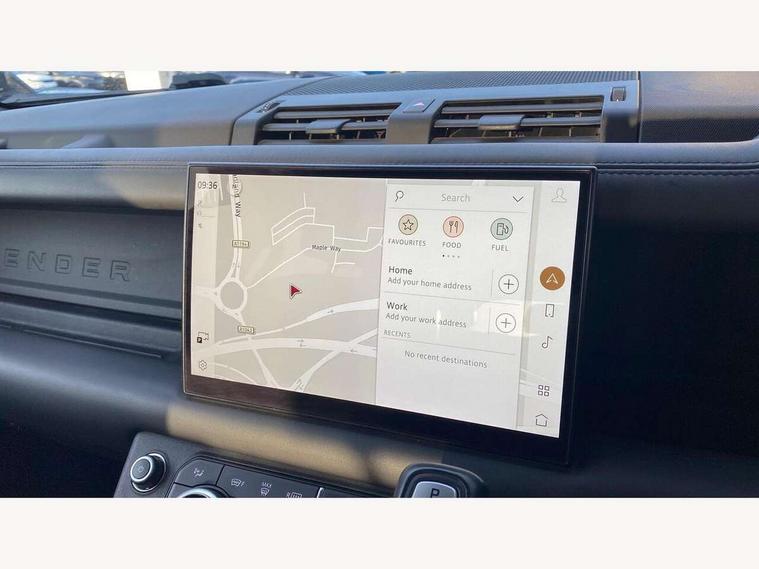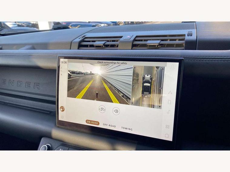 11.4" touchscreen, 360 degree parking aid, 3D Surround Camera with 360 View, 180 Rear View, Front Traffic Detection, Forward Vehicle Guidance, Tow Hitch Assist and clear sight Ground View, Adaptive cruise control, Android Auto, Apple CarPlay, Assisted tailgate with soft close, Blind spot assist, Bluetooth system, Brake pad wear indicator, Clear exit monitor, Connected navigation pro, Driver condition monitor, Electric power assisted steering (EPAS), Garage door opener (Homelink), Head up Display, Interactive driver display, Lane keep assist, Push button start, Rear collision monitor, Rear traffic monitor, Traffic sign recognition with adaptive speed limiter, Trip computer, Wade Sensing, Wireless device charging with phone signal booster, Adaptive dynamics, All terrain progress control, Configurable Terrain Response, Electronic active differential with brake torque vectoring, Electronic air suspension, Terrain Response 2 with dynamic program, DAB Radio (Digital Audio Broadcasting), Meridian 700w surround sound audio system with 15 speakers, Pivi pro connected, Advanced tow assist, Automatic headlight levelling, Automatic headlights, Black exposed rear recovery eyes, Centre high mounted stop light, ClearSight interior rear view mirror, Darkened LED tail lights, Electric heated/power fold door mirrors with approach lights and auto dimming driver side, Electric windows with one touch open/close and anti-trap, Electrically deployable towbar, Follow me home lighting, Front fog lights, Headlamp power wash, Heated rear window with timer, Heated washer jets, Heated windscreen, Illuminated metal treadplates with V8 branding, Less roof rack or roof rails, Privacy glass, Puddle lights, Quad outboard mounted exhaust pipes, Rain sensing windscreen wipers, Rear fog lights, Rear side wing doors, Rear wiper, Signature graphic (with interior storage), Sliding panoramic roof, Solar attenuating windscreen, Trailer stability assist, V8 badge, 12V power socket in loadspace, 14 way heated and cooled electric adjustable memory front seats with 4 way manual headrests, 3 seat bench in 2nd row, 40:20:40 folding, heated rear seats with centre armrest, Air quality sensor, Bright metal pedals, Cabin air ionisation with PM2.5 filter, Domestic plug socket, Durable rubber cabin flooring, Durable rubber loadspace flooring, Ebony morzine headlining, Electric cabin pre conditioning, Electric reach + rake adjustable steering column, Extended leather upgrade, Footwell lights, Front centre console refrigerator compartment, Front passenger isofix child seat attachment, Heated steering wheel, Leather gearshift, Loadspace cover, Loadspace Hook, Multifunction steering wheel, Overhead stowage for sunglasses, Premium cabin lighting, Rear headrests, Rear ISOFIX, Rear reading lights, Satin chrome gearshift paddles, Single front passenger seat, Storage glovebox, Suedecloth steering wheel, Sunvisors with illuminated vanity mirrors, Three-zone Climate Control with Rear Cooling Assist, Twin front cupholders with cover, Online pack with data plan - Defender, 5 x 3 point seatbelts, ABS, Brake hold function, Cornering brake control (CBC), Cross car beam in satin black powder coat brushed finish, Customer configurable autolock, Driver and passenger airbags, DSC - Dynamic Stability Control, EBD - Electronic brakeforce distribution, Electric parking brake (EPB), Emergency braking, ESP + traction control, Front airbags with passenger seat occupant detector, HDC - Hill descent control, Hill launch assist, Low traction launch, Power operated child locks, Remote for (e-Call, Optimised assistance call, InControl app, Climate, beep and flash and door), RSC - Roll stability control, Seat belt reminder, TPMS (Tyre pressure monitoring system), Activity key, Alarm, Immobiliser, Intrusion sensor, Keyless entry, Locking wheel nuts, Robustec veneer,