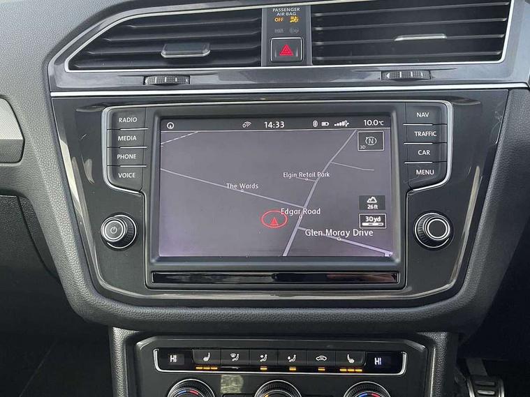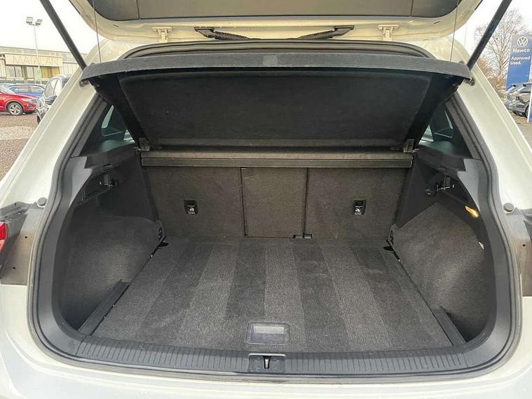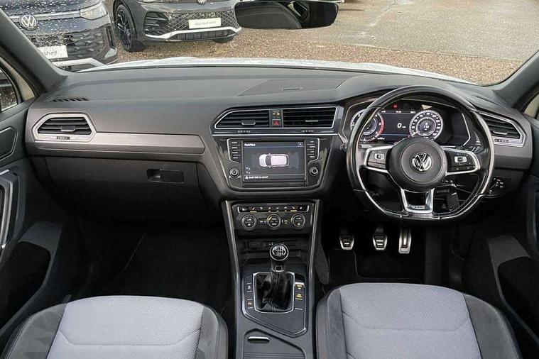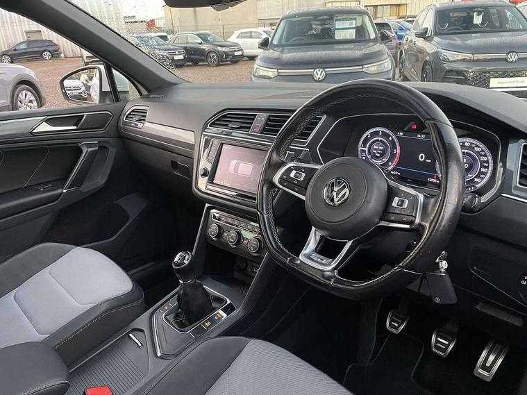 Active information display, Adaptive cruise control, App-Connect, Bluetooth phone integration system, Instrument cluster, Lane assist, Low washer fluid warning light, Outside temperature display, Service interval indicator, Speed limiter, Warning lights, Diesel particulate filter, Sports suspension, XDS electronic differential lock, Aux-in socket, DAB Digital radio, SD card slot, USB connection, Auto dimming interior mirror, Automatic activation of hazard warning lights, Black roof rails, Body colour door handles, Body colour door mirrors, Body colour rear spoiler, Body coloured bumpers, Chrome side window surrounds, Chrome trimmed radiator grille, Coming/leaving home lighting function, Dual chrome exhaust, Dusk sensor + auto driving lights, Electric folding door mirrors, Electric heated + adjustable door mirrors, Electric panoramic sunroof with sunblind, Front and rear electric windows, Heated rear window, LED headlights with dynamic light assist daytime running lights and cornering front fog lights, LED rear lights, Piano black rear diffuser, R Line body kit, Rain sensor windscreen wipers, Rear windscreen washer and wiper with interval delay, Silver under body guard, Tinted windows (B pillar backwards), Twin trapezoid chrome exhaust pipes, 12V Accessory socket in centre console, 3 rear headrests, 3 zone climate control, 4 load lashing points, 40:20:40 split folding rear seats, Bag hook in luggage compartment, Black headlining, Driver + front passenger lumbar support, Foldable passenger seatback, Front + rear carpet mats, Front centre armrest with 12v socket, Front centre armrest with storage + rear 2 air vents + cupholders, Front seatback folding tables, Height/reach adjust steering wheel, Illuminated driver/passenger vanity mirrors, Illuminated scuff plates, Interior light with delay, Isofix Preparation 2 Rear child seats, Leather gear knob, Lockable cooled glovebox, Luggage compartment lighting, Luggage compartment side storage, Map pockets on front seats, Passenger seat height adjuster, Rear cupholders, Removable luggage cover, Sliding/reclining rear seats, Stainless steel pedals, Storage compartment in driver's door, Storage compartment in passenger's door, Storage tray on dashboard, Sunglasses storage, Variable boot floor, Ambient lighting pack - Tiguan, 3 rear 3 point seatbelts, ABS+EBD+Brake assist, Active bonnet, Active pedestrian safety system, Curtain airbags, Driver/Front Passenger airbags, Driver/Passenger whiplash optimised head restraints, Drivers knee airbag, Electronic parking brake with auto hold, ESP with EDL + ASR, First aid kit, Front assist including city emergency braking, Front side airbags, Head airbag system, Height adjustable front 3 point seatbelts + pretensioners, Hill hold control, Passenger airbag deactivate switch, Passenger knee airbag, Pre crash system, Rear side airbags, Seatbelt warning lamp and buzzer, Two tone horn, Warning triangle, Alarm with interior protection, Electronic engine immobiliser, Remote central locking with 2 remote folding keys, Chrome door trim inserts, Piano black interior trim, 20" Suzuka alloy wheels + anti theft wheel bolts, Steel space saver spare wheel,