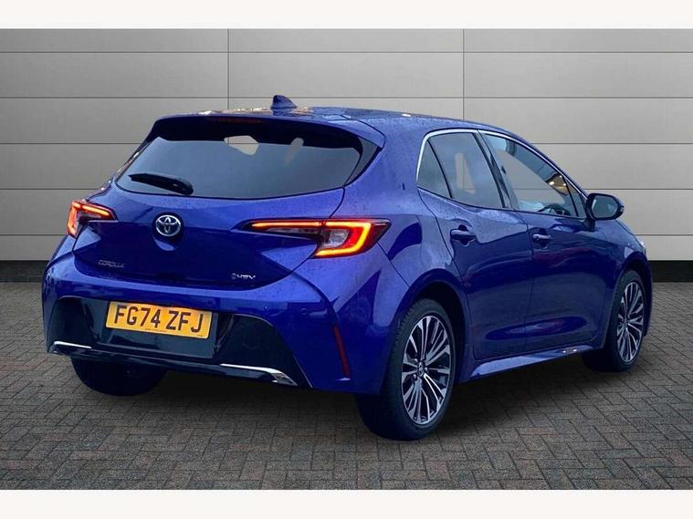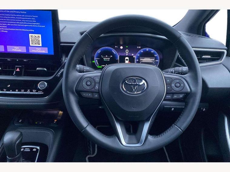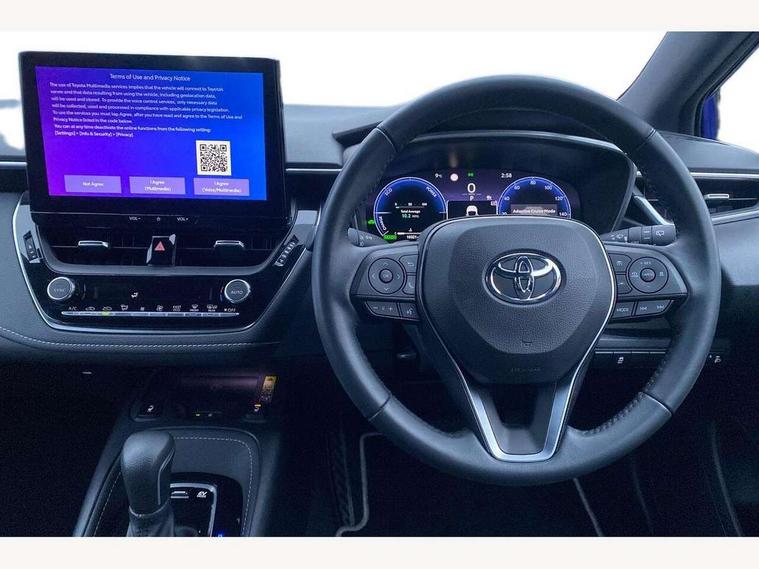 10.5" Multimedia display screen, Bluetooth telephone connectivity, Connected car functionality upgrade, tracker, remote status and e-care, Drive mode select (Eco, Normal), E-call, Electrically assisted power steering, EV drive indicator, Front and rear parking sensors with auto brake, Full Digital 12.3" TFT Digital Combimeter, Key reminder warning, Lane Departure Alert (LDA) switch on steering wheel, Memory on adjustable speed limiter, MyT connected services, Proactive driving assist (PDA), Reversing camera, Smartphone integration with Apple CarPlay and wired android auto, Tailgate, Toyota remote services, Toyota smart connect navigation, Wireless charger, Gasoline particulate filter, Vehicle Stability Control (VSC), 6 speakers, AM/FM radio, DAB Digital radio, Front USB-C in dashboard, Smart voice assist/ Voice recognition, USB and Aux in connectors + 12V front outlet, Anti-jam protection on power windows, Auto up and down function on all power windows, Automatic folding mirrors, Automatic headlights with high beam assist, Black centre and side air vents, Black metallic meshed front grille, Black toyota logo in front, Body coloured bumpers, Body coloured door mirrors, Body coloured front spoiler, Body coloured outside door handles, COROLLA alloy door scuff plates, Electrochromatic mirror, Follow me home headlights, LED daytime running lights, LED dual beam projector headlights, LED front fog lights, LED High mounted stop light, LED rear combi lights with LED lightguide, Manual headlight levelling system, New grille pattern, Noise reduction layer on windscreen, Piano black diffuser, Power adjustable heated door mirrors, Power front windows, Power rear windows, Privacy glass with UV filter, Rain sensing wipers, Rear bumper decoration with chrome plated inserts, Rear side wing doors, Rear under guard with chrome ornament, Rear window defogger, Rear window wiper, Reverse tilting door mirrors, Roof spoiler, Satin chrome insert on front air vents, Satin chrome insert on front door assist grips, Shark fin antenna, Tailgate release with push button, Time adjustment on intermittent wiper, Turning signal integrated indicators in door mirrors, Unique lower skirt, Unique side rocker with black insert, UV-filter on driver and passenger windows, 2 Shopping bag hooks in luggage compartment, 3 rear headrests, 3 seat bench in 2nd row, 3 spoke leather steering wheel with satin insert + gear knob, 4 tie down hooks in luggage compartment, 60/40 split folding rear seat, Adaptive cruise control (ACC) switch on steering wheel, Adjustable speed limiter switch on steering wheel, Audio, multimedia and telephone switches on steering wheel, Black armrest on centre console box, Black gear shift console, Boot light, Boot underfloor storage, Centre room light, Driver and front passenger personal light, Driver and passenger assist grip, Driver and passenger sun visor with mirror and light, Dual zone automatic air conditioning with ECO mode switch, Fabric/synthetic leather upholstery, Front and rear cup and bottle holders, Front door pockets, Front head restraints, Front passenger seat, Front sliding synthetic leather armrest, Heated seats, Illuminated entry system in room lamp, ISOFIX seat fixing (2 fixings on rear outer seats), Leather gear shift with satin chrome on gear shift console, Manual height adjustable for driver and front passenger seat, Manually tilt with sliding driver and front passenger seat, Nanoe-X air purifier, Paddle shifts, Parcel shelf, Passenger seat back pocket, Pollen filter, Power adjustable lumbar support on driver seat, Power window switches with satin chrome inserts, Rear armrest with 2 cupholders, Rear passenger coat hooks (2), Remote air conditioning, Satin chrome inside door handles, Satin chrome surround on heater control panel, Satin chrome surround on speedometer, Sliding armrest on centre console box, Slow opening glovebox with lights, Textile floor mats, Tilt/telescopic steering column, Voice recognition switch on steering wheel, Whiplash Injury Lessening (WIL) feature (active headrest) for seats, White ambient lighting on open tray and front cup holder, Toyota safety sense 3 pack - Corolla, 3x3 point rear seatbelts, Adjustable driver and front passenger seat belt extender to top anchor point, Anti lock braking system + Electronic brake force distribution, Brake assist function, Child locks on rear doors, Downhill Assist Control (DAC), Electronic parking brake, Emergency brake light signal (EBS), Front passenger airbag on/off switch, Front seatbelt reminder, HAC - Hill start assist control, Rear seat belt reminder, Seatbelt pretensioners and force limiters, Supplemental restraint system (SRS) 7 airbags - dual driver, dual side curtain, side impact and driver knee airbags, Traction control, Tyre pressure warning system, Acoustic vehicle alert system (AVAS), Alarm with motion sensor and immobilizer, Power passenger window lock, Remote central locking + deadlocks, Satin chrome dash trim, Soft touch texture on upper dashboard, Stitching on lower dashboard, 17" Black machined face 5 double spoke alloy wheels, Tyre repair kit, Unique wheel finish with red wheel cap,