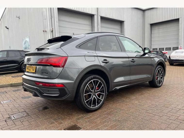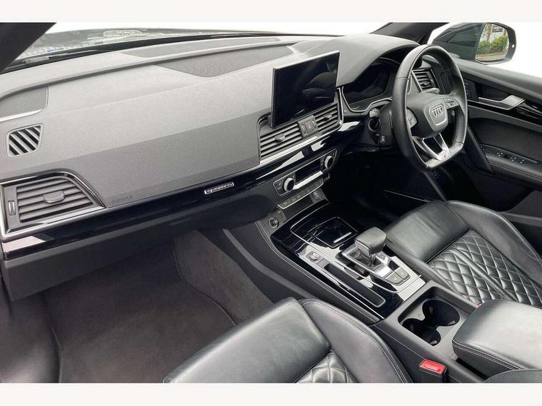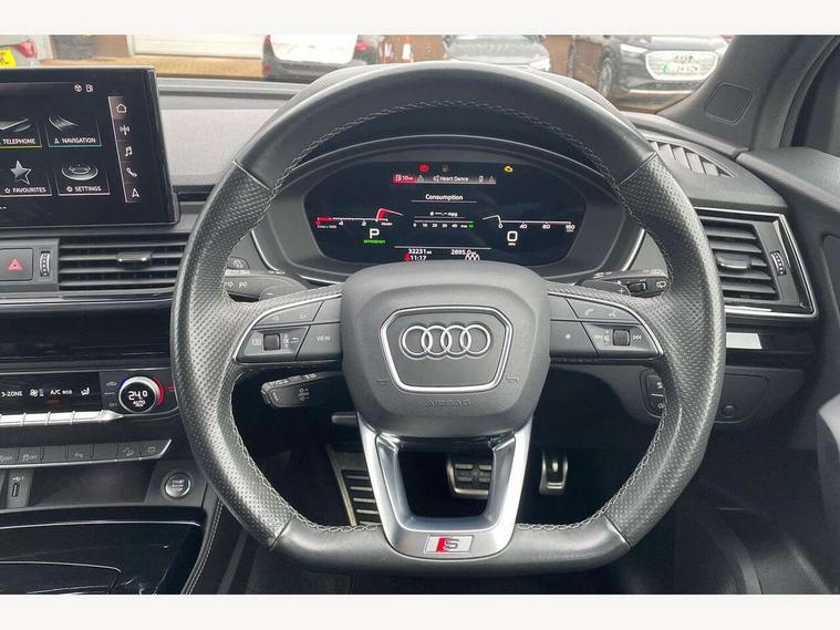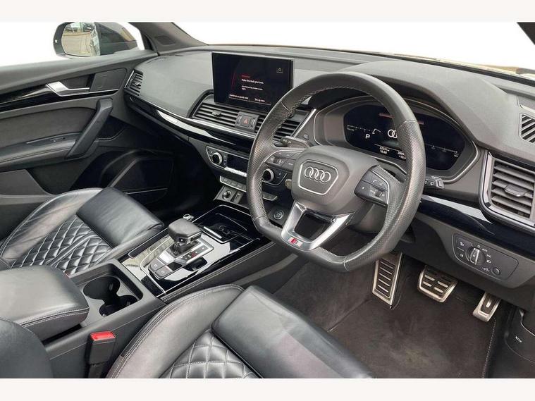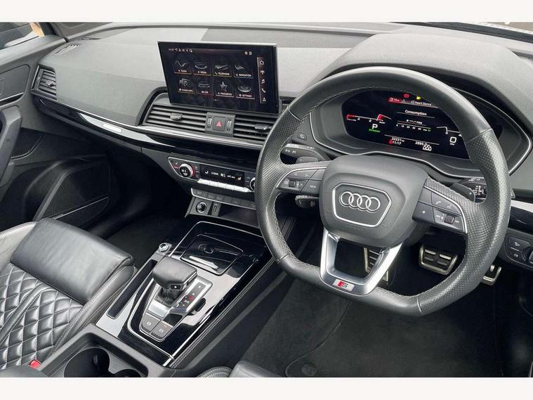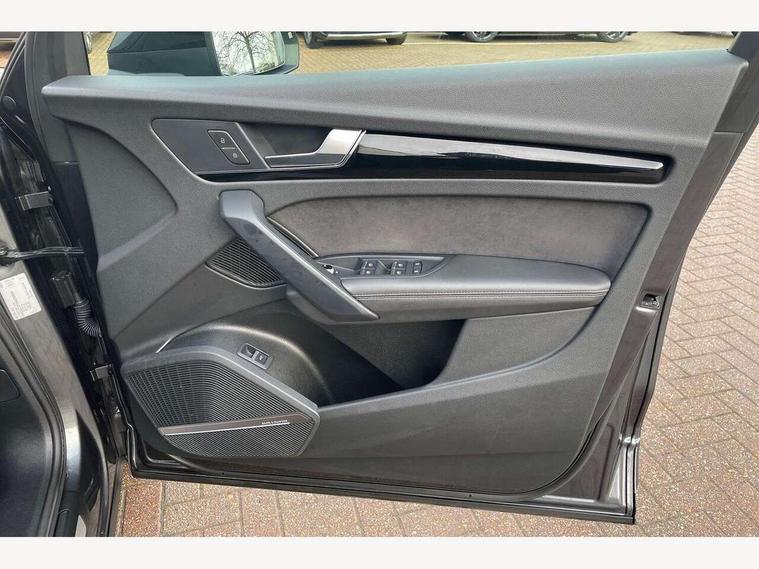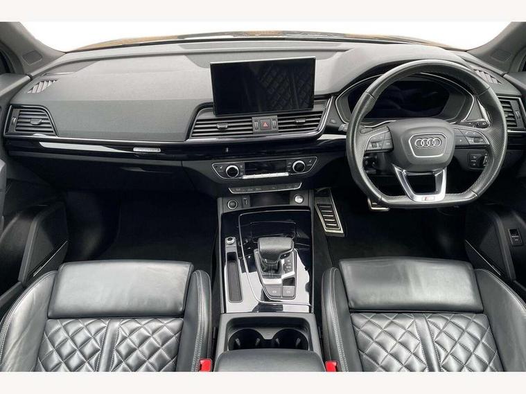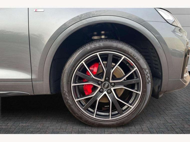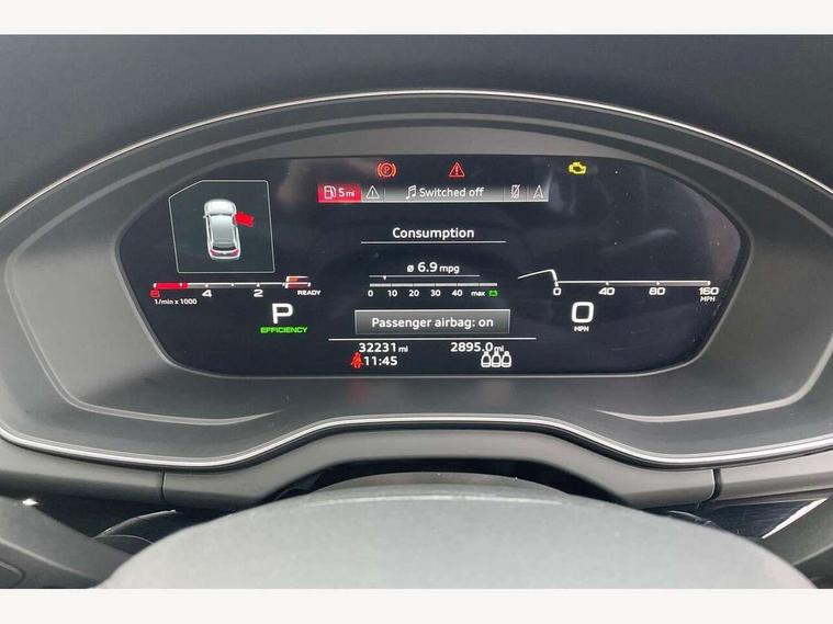 Audi connect safety and service (e-call), Audi connect with Amazon Alexa Integration, Audi drive select, Audi virtual cockpit plus with 12.3" screen and three different layout designs, Audi wireless smartphone interface, Automatic start-stop system with coasting functionality and efficiency programme, Bluetooth interface, Electro - mechanical power assisted steering, MMI navigation plus with 10.1" touch screen, Power tailgate, Reversing camera, Service interval indicator, Voice control system with Audi hotword activation "Hey Audi", Diesel particulate filter, Quattro on demand, S line sports suspension, DAB Digital radio, Acoustic windscreen, Audi beam with Audi rings logo, Audi matrix LED headlights with dynamic front and rear indicators, Audi rings at front and rear in black, Audi rings decal on rear doors, Auto dimming door mirrors, Auto dimming rear view mirror, Automatic headlights and windscreen wipers, Black door mirrors, Black roof rails, Body colour underbody protection, Chrome plated exhaust trims, Daytime running lights, Door sills in Selenite silver, Electric adjustable/heated/folding door mirrors, Front air inlet surrounds in aluminium, Front and rear electric windows, Headlight washers, High gloss black B pillar trims and triangular rear door trim, High level LED brake light, Rear chrome trim strip below lights, Rear privacy glass and rear side windows, Rear side wing doors, Rear spoiler, Rear wiper, Roof bars, Without model and engine badging at rear, 2 x USB charging port with aux input socket, 3 rear headrests, 4 way electric lumbar support for driver and front passenger, 40:20:40 split folding 3 rear bench seat in 2nd row with rear centre armrest, Black cloth headlining, Comfort front centre armrest, Contrast stitching on seats, steering wheel and gear lever gaiter, Deluxe 3 zone electronic climate control, Electrically adjustable front seats, Fine Nappa leather upholstery with diamond pattern contrast stitching + front sport seats with S embossed logo, Front head restraints, Front/rear floor mats, Gear lever in black leather, Heated front seats, Height/reach adjustable steering column, Illuminated door sill trims with S logo, ISOFIX child seat mounting and top tether, Rear seat bench plus, Removable luggage compartment floor, Single front passenger seat, Stainless steel pedals, Sunvisors with vanity mirrors, Trunk roller cover, Artificial leather pack - Q5, Black styling package - Q5 Edition 1, Extended LED Interior multi coloured Lighting Pack - Q5, 3 point seatbelts on all seats, 6 airbags - Driver, front passenger, curtain and side airbags, Electrically operated child locks on rear doors, Electromechanical parking brake, Electronic stabilisation control including ABS, ASR and EDL, Front and rear brake calipers painted in red, Front passenger airbag deactivation, Hill descent control, Hill hold assist, Multi collision brake assist, Pop-up bonnet for pedestrian protection, Pre sense city, Seat belt force limiter, Seatbelt monitoring, Tyre pressure warning, Warning triangle and first aid kit, Anti theft alarm, Anti-theft wheel bolts, Keyless Go access/ignition system, Remote central locking, Piano black finish inlay,