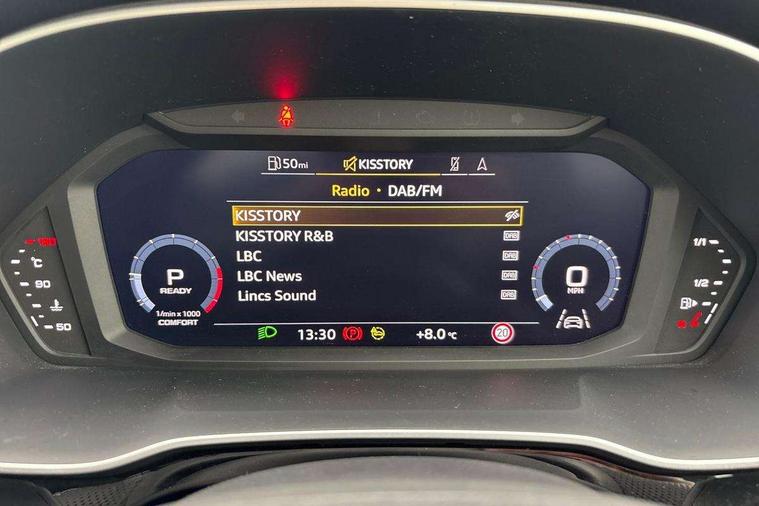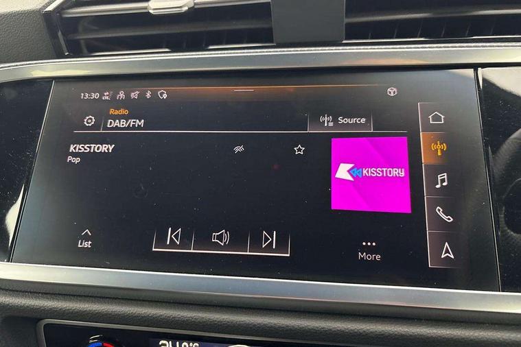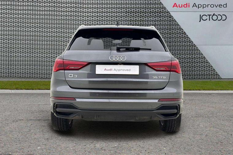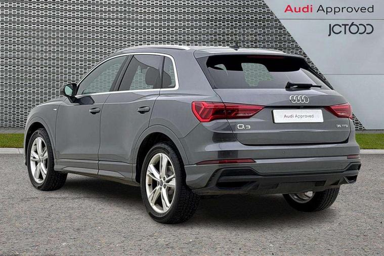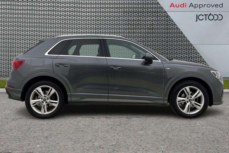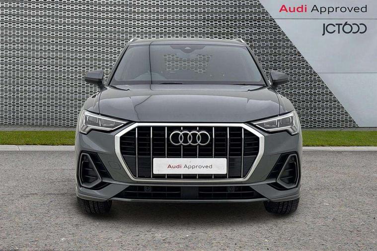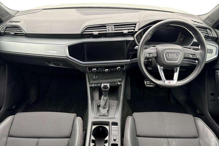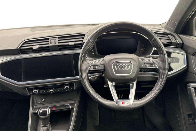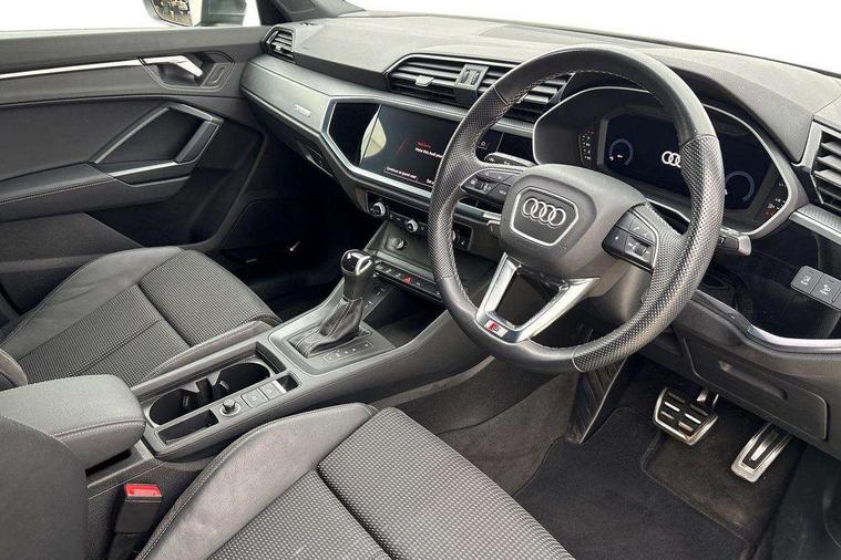 Amazon alexa Integration, Audi drive select, Audi lane departure warning, Audi smartphone interface includes wireless Apple carplay/Android Auto, Audi Virtual Cockpit - 10.25" display, Bluetooth interface, Camera based traffic sign recognition, Legal emergency call, MMI Navigation Plus with high resolution 10.1 inch touchscreen colour display, Power operated tailgate, Progressive steering, Service interval indicator, Start stop system with recuperation, Voice control system with natural language interaction, Sports suspension, 2 USB-C ports with charge and data functions, 6 passive loudspeakers, DAB digital radio module, Acoustic windscreen, Aluminium roof rails, Aluminium window trim, Auto dimming frameless rear view mirror, Body colour front spoiler blade, Body coloured bumpers, Electrically folding, adjustable and heated door mirrors with integrated LED side indicators and kerb view function for passenger side, Front and rear electric windows, Front fog lights, Front side air inlets in matt platinum grey, Grille vertical bars in aluminium silver/Matt, High gloss black finish B and C pillars, LED Dynamic rear indicators, LED headlights with LED daytime running lights, LED rear lights, LED third brake light, Privacy glass dark tinted rear and rear-side windows (from B-pillar backwards), Rain and light sensors, Rear diffuser grille in grained matt black, Rear diffuser strip in matt titanium black, Rear side wing doors, Rear wiper, S line badges on front wings, S Line front and rear bumpers, Side skirt insert in matt Platinium grey, Titanium black radiator grille, Variable front intermittent wipers, 12V socket in rear centre console, 3 seat bench in 2nd row, 40:20:40 folding with manual adjustment for 60:40 forwards/backwards position and backrest angle, Adjustable rear seat bench/backrest with centre armrest and cupholder, Black cloth headlining, Dual zone electronic climate control, Front and rear black floor mats with contrast stitching in rock grey, Front and rear headrests, Front and rear roof module including reading lights, Front centre armrest, Glove compartment lighting, Height and reach adjustable steering wheel, Illuminated door sill trims with S logo, ISOFIX child seat mounting for front passenger with airbag deactivation and outer rear seat including top tether attachment point for outer rear seats, Luggage compartment light, Manual front seats with height adjustment, Perforated leather gearknob, Single front passenger seat, Stainless steel luggage compartment sill finisher, Stainless steel pedals, Ambient lighting pack - Q3, Non smoking pack - Q3, 3x3 point rear seatbelts, 6 airbags - Driver, front passenger, curtain and side windows, Electrically operated child locks on rear doors, Electromechanical parking brake, Electronic stabilisation control including ABS, ASR and EDL, Front seatbelt reminder, Hill descent control, Hill hold assist, Pre sense basic, Seatbelt monitoring, Tyre pressure warning, Warning triangle and first aid kit, Anti theft alarm, Anti theft wheel bolts, Audi pre-sense front with pedestrain and cyclist recognition, Immobiliser, Remote central locking, Dark matt brushed aluminium inlay, Leatherette door armrest, MMI touch colour display in glass look, black with surround in aluminium look,